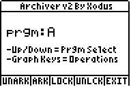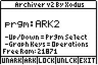 Archiver allows you to Archive, Unarchive, Lock, Unlock any program on your calculator while showing the amount of free ram. This is useful for viewing the source code of locked basic and assembly programs and archiving of programs to save memory.