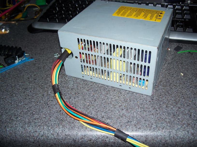 First step is to crack open the case on your power supply. Cut off all the cables and leave about 3-4 inches of wire in a group of about 3 or 4 for each voltage you want.