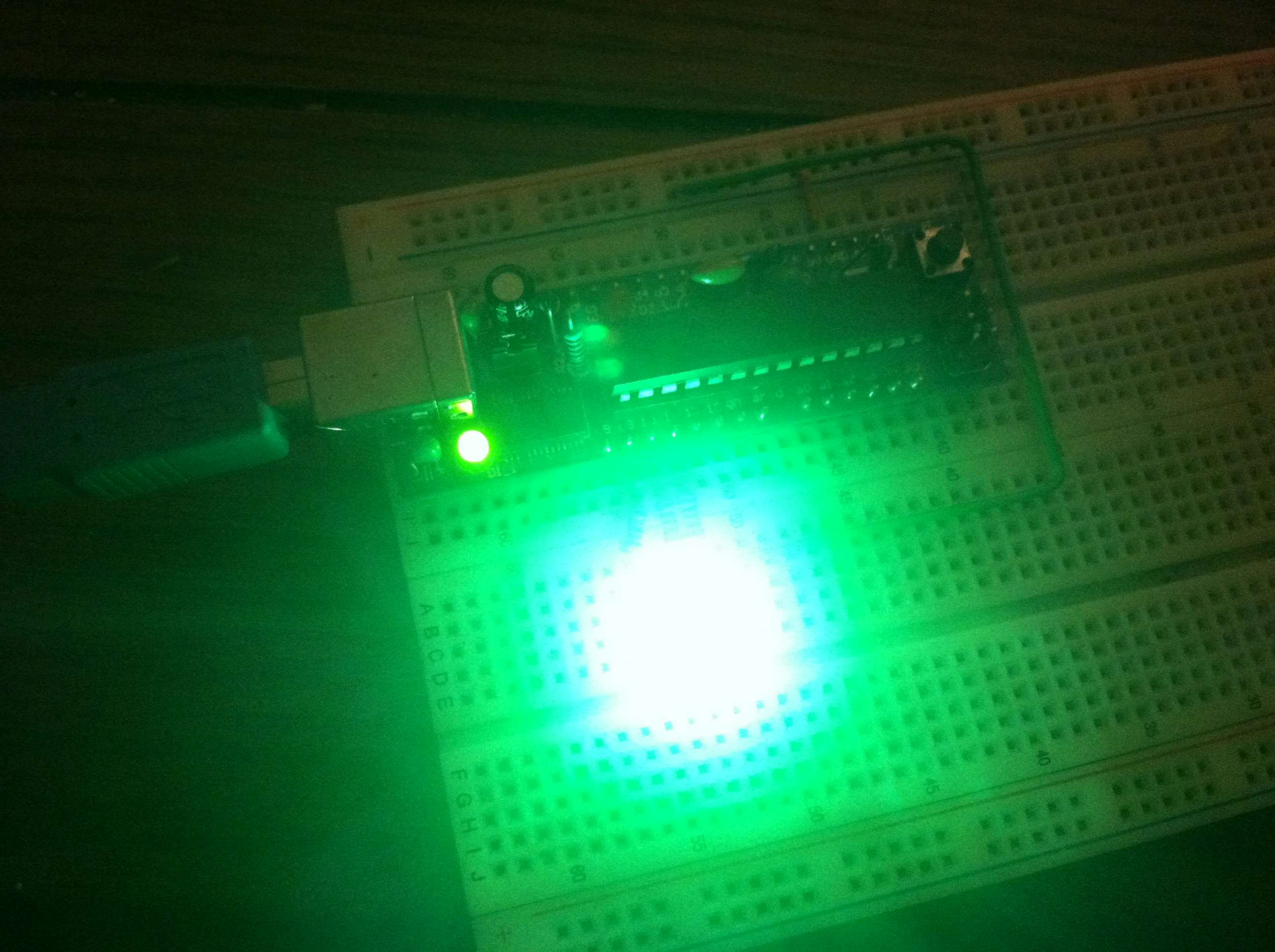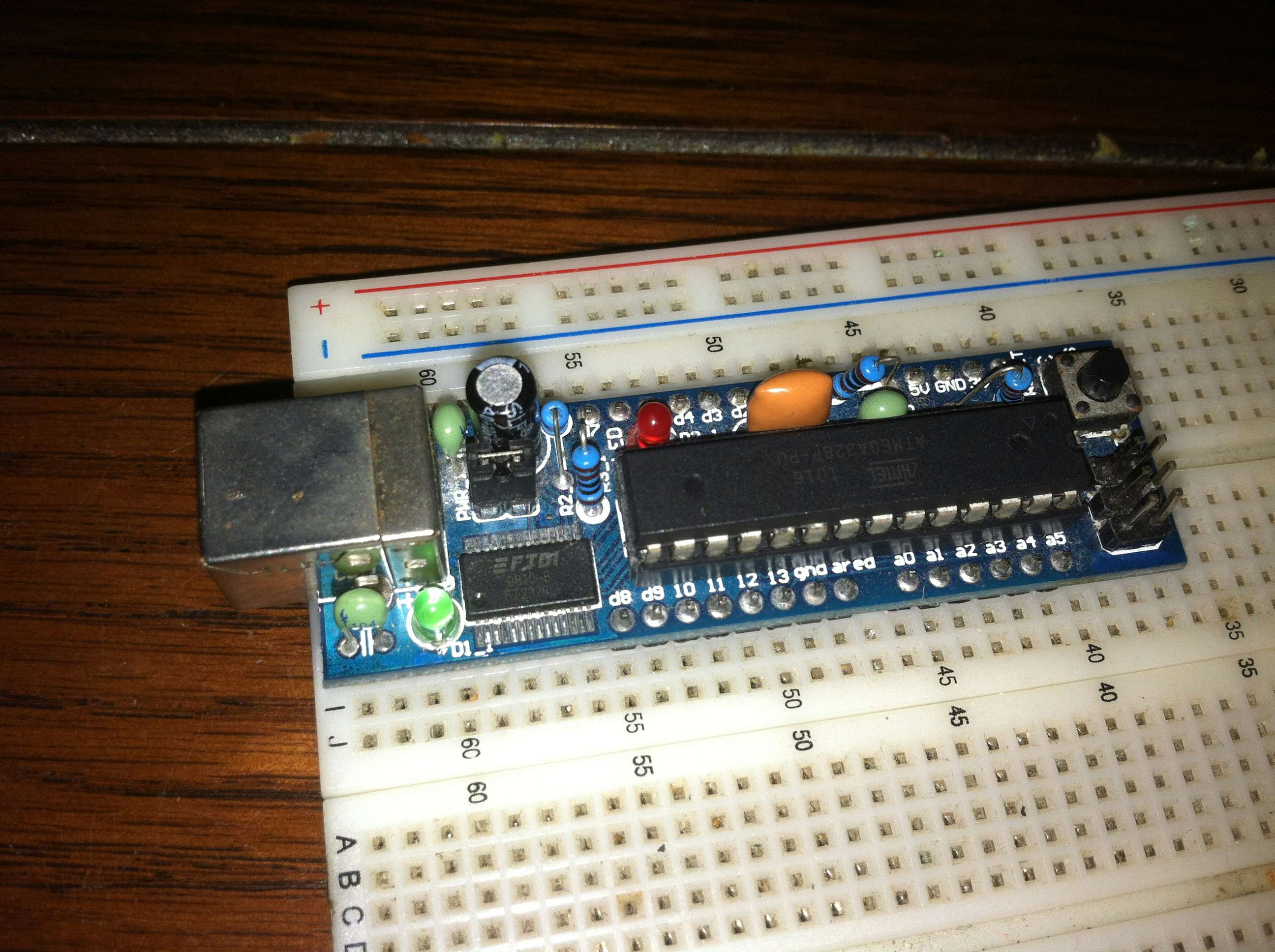 Once inserted into the breadboard you can elect to either allow the extra bit of the board without pins to poke off the side of your breadboard. The advantage is saving about 10 rows or 50 total connections by doing so, the disadvantage is it makes your breadboard less portable and the electronics underneath the Boarduino more susceptible to damage. I routinely use a breadboard as both a prototyping platform and as a way to demonstrate circuits to others.