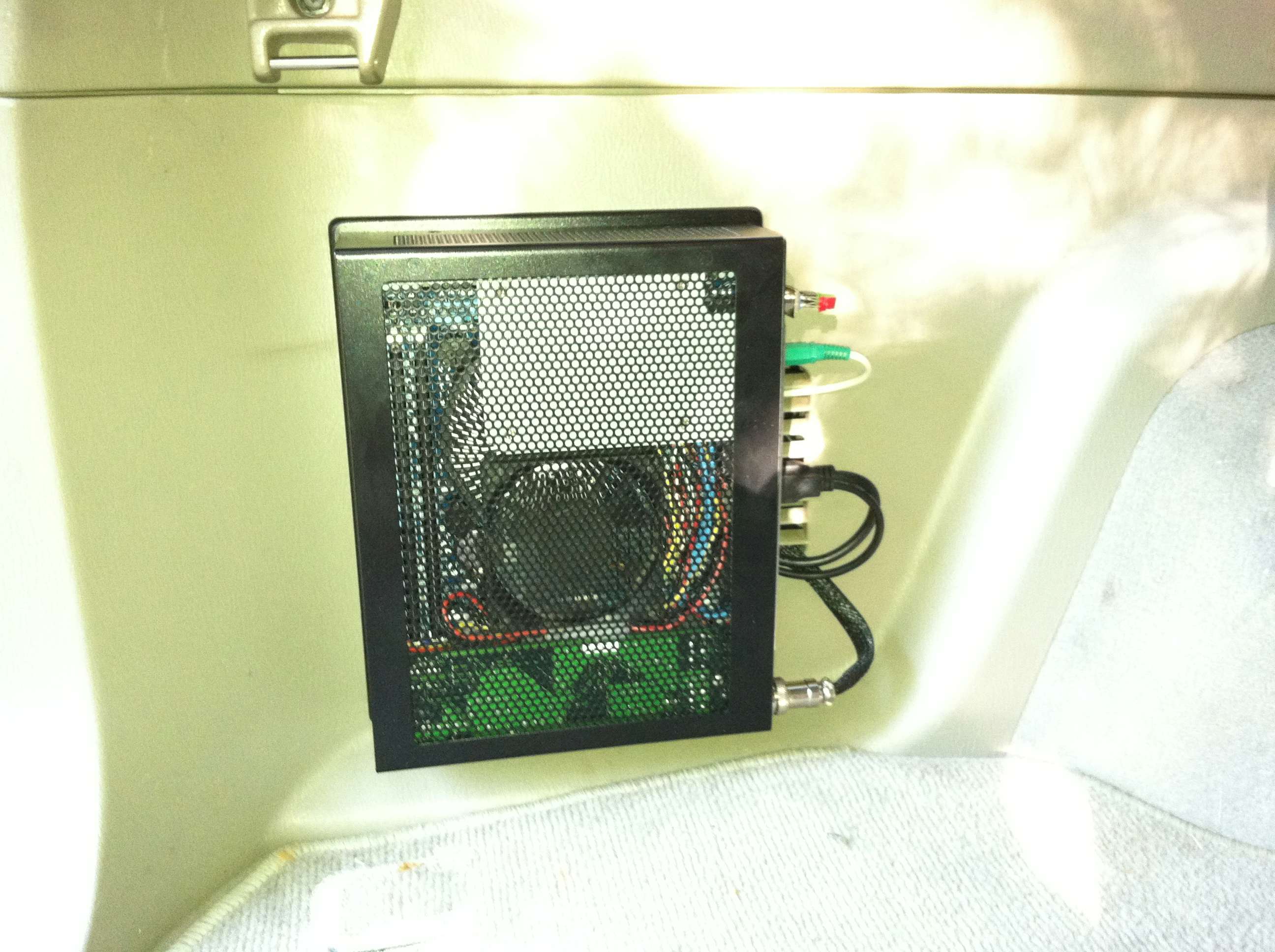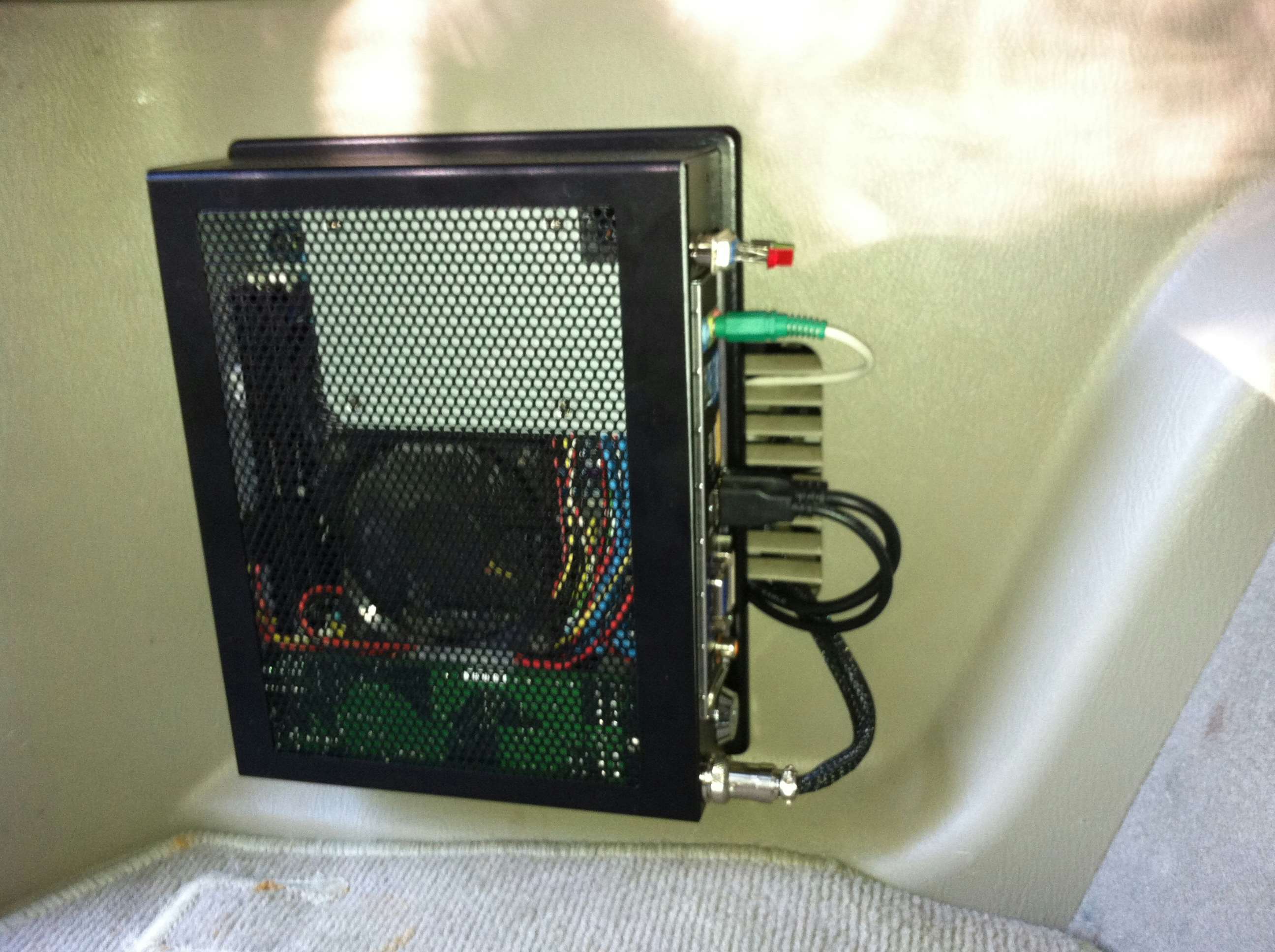 I have installed the computer using its mounting plate on a panel on the drivers side of the vehicle. The computer locks with a key and easily allows me to take the unit out of the vehicle if I need to take it inside to work on or upgrade the computer. There was a small vent where I mounted the plate so I routed the cables that connect the computer to the various peripherals in the car. This means if I choose to completely remove the computer system that there will only be 4 relatively small holes in the panel where the plate was mounted. Using screw hole inserts (common in the automotive industry) I can cover the holes completely removing any obvious evidence there was ever something installed. Panels like this one often come with holes drilled and fitted with caps where accessories can be mounted in the future.