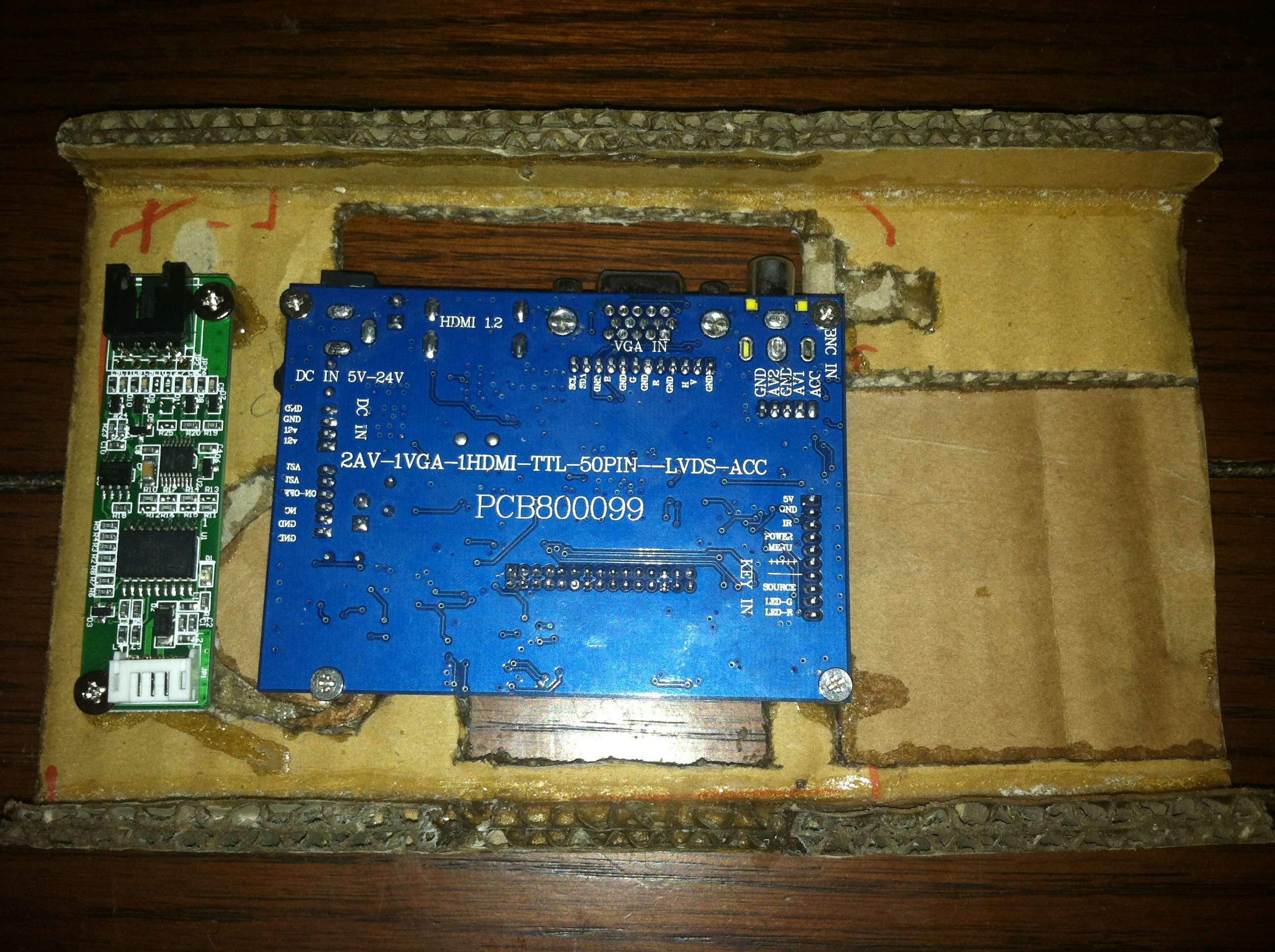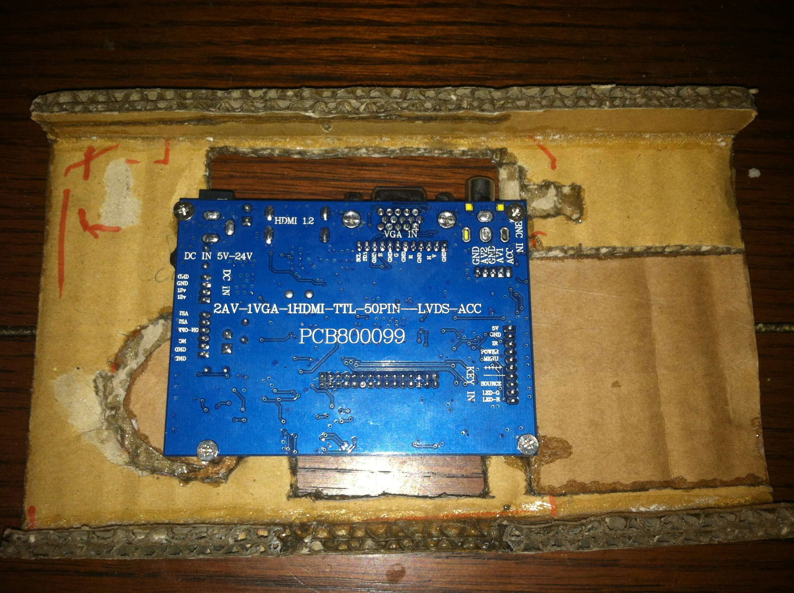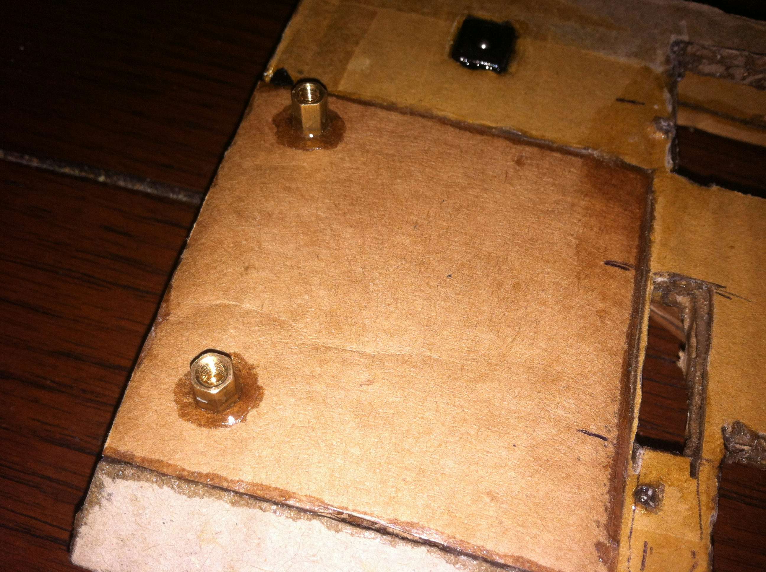 Holes are cut out of the backplane for access to the main connectors, the LCD data connector, and the button board connector. They are sealed up with more epoxy, this has the effect of making the backplane even more rigid. Standoffs are then placed and bolted to the cardboard, this is accomplished by drilling a hole in cardboard then placing a small tab of epoxy such that the edges soak up the glue but the hole is not filled in. After waiting a few minutes drop slightly more glue in and start screwing in the standoff, more glue is then placed around the edges creating a surprisingly strong mount point. With four total standoffs for the driver board I can be sure it will stay put.