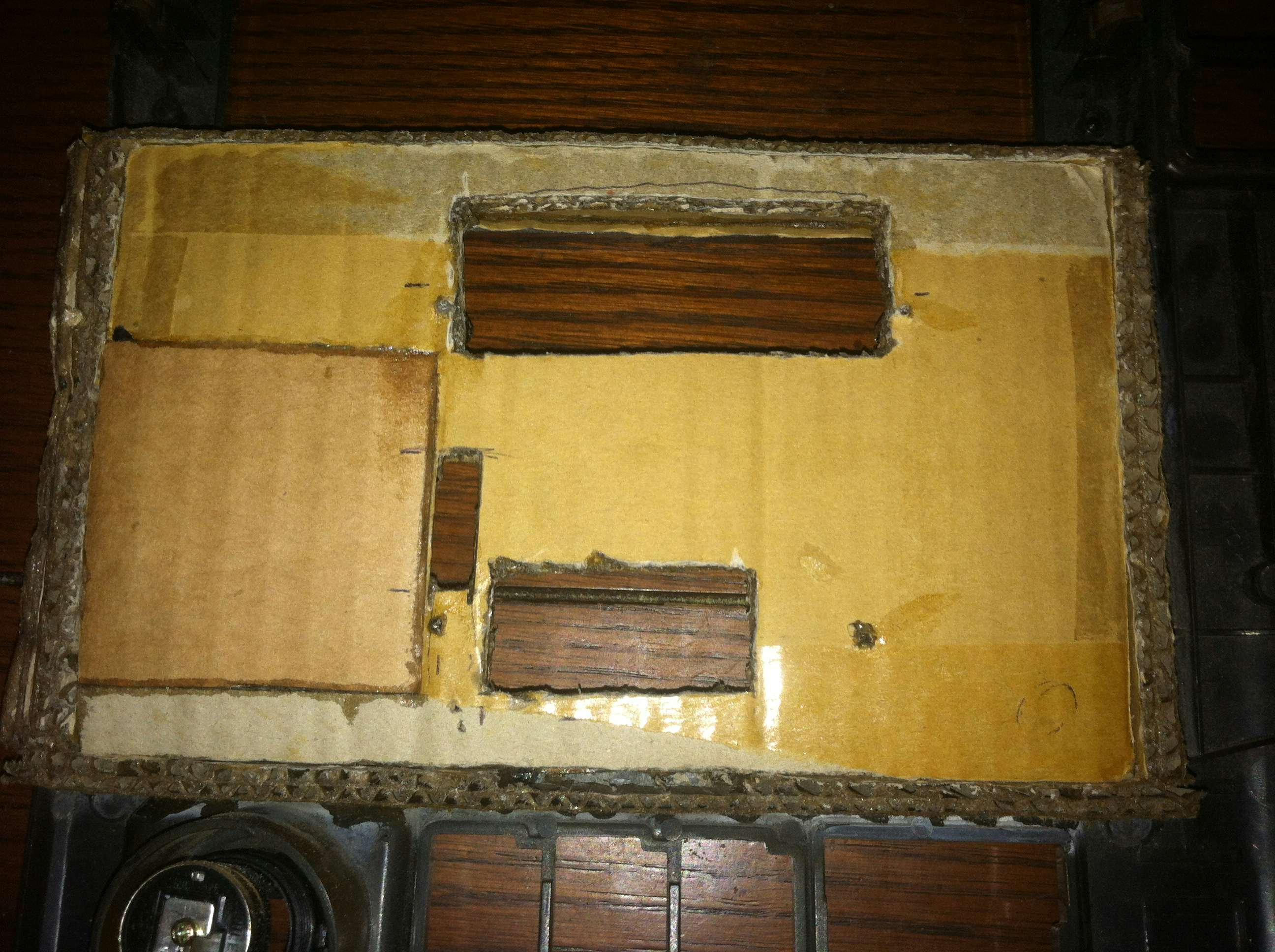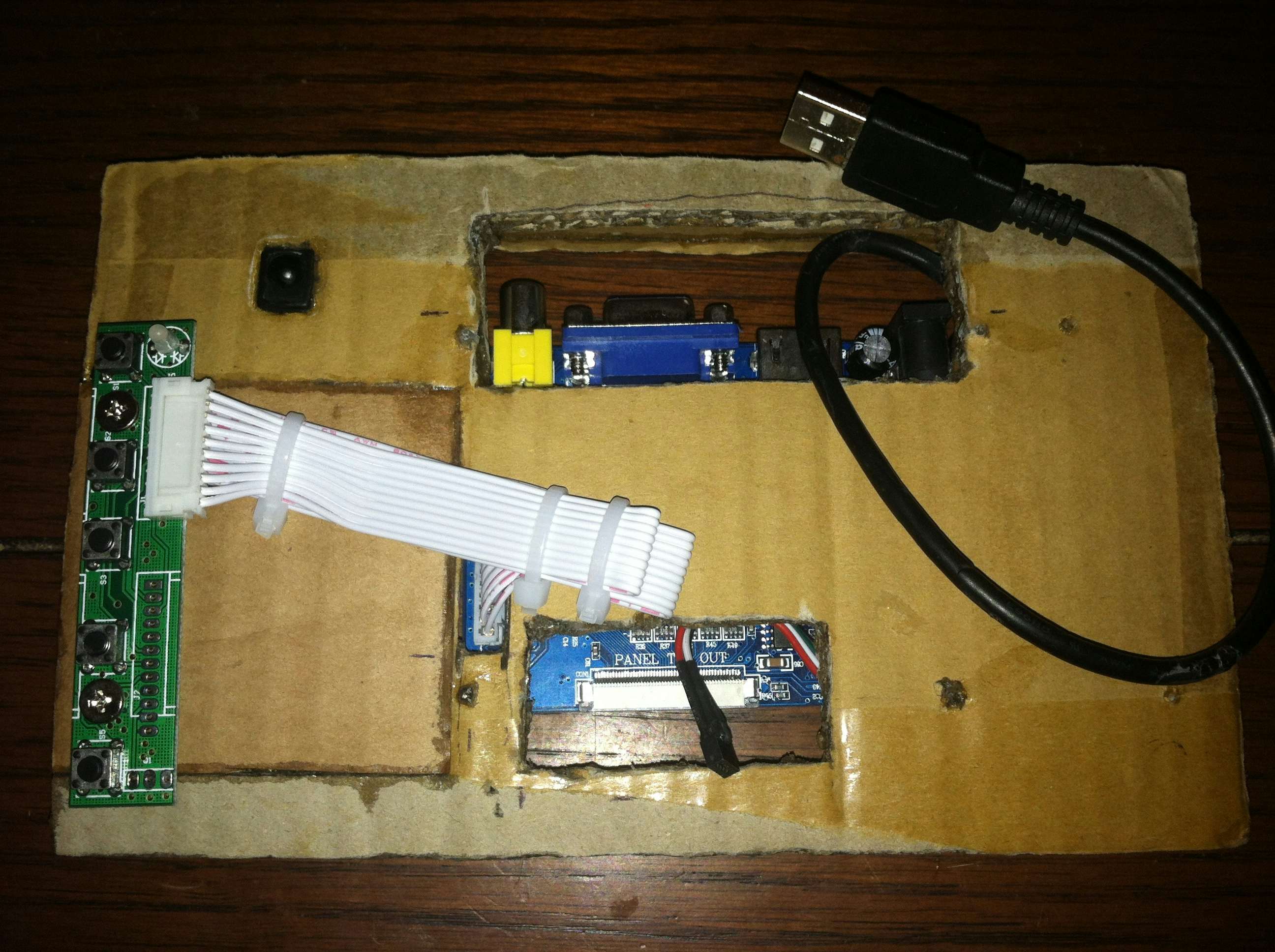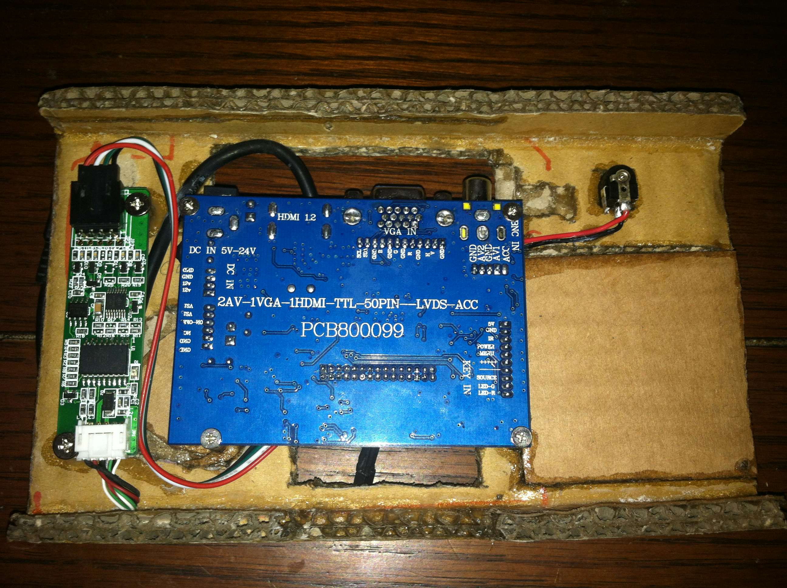 Holes are cut out of the backplane for access to the main connectors, the LCD data connector, and the button board connector. They are sealed up with more epoxy, this has the effect of making the backplane even more rigid. Standoffs are then placed and bolted to the cardboard, this is accomplished by drilling a hole in cardboard then placing a small tab of epoxy such that the edges soak up the glue but the hole is not filled in. After waiting a few minutes drop slightly more glue in and start screwing in the standoff, more glue is then placed around the edges creating a surprisingly strong mount point. With four total standoffs for the driver board I can be sure it will stay put.