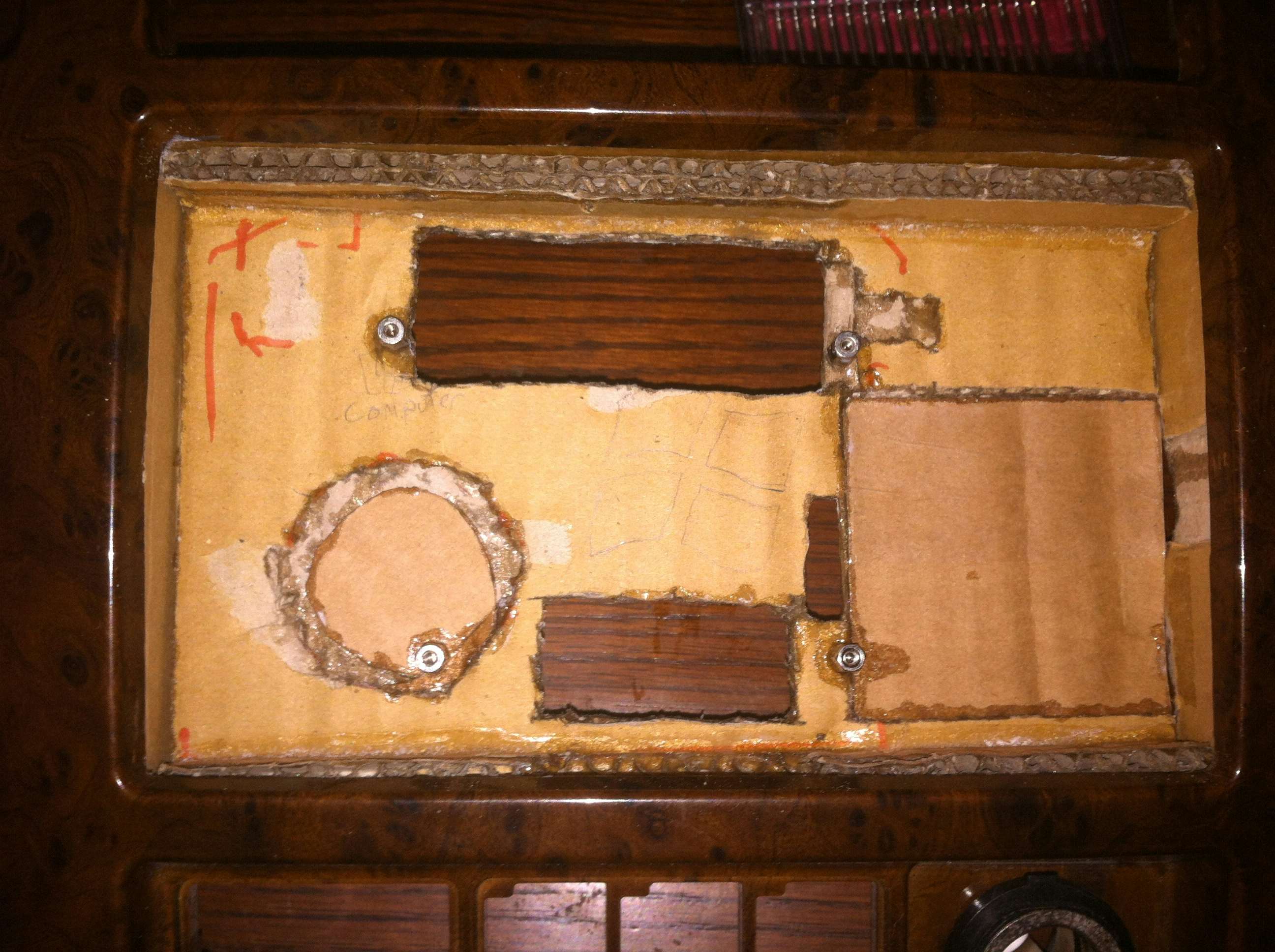 First a frame was constructed using cardboard, yes, cardboard. Using industrial strength epoxy and super glue to attach pieces and on all the exposed edges creates an incredibly strong structure that is easy to work with. The frame is then attached to the rear side of the dash panel from my car with care taken to ensure the optimal placement of the screen in the opening of the dash. Next a backplate is created that will pressure fit the display to the back of the dash creating as tight of a seal as possible with the lip of the dash and the front of the display.