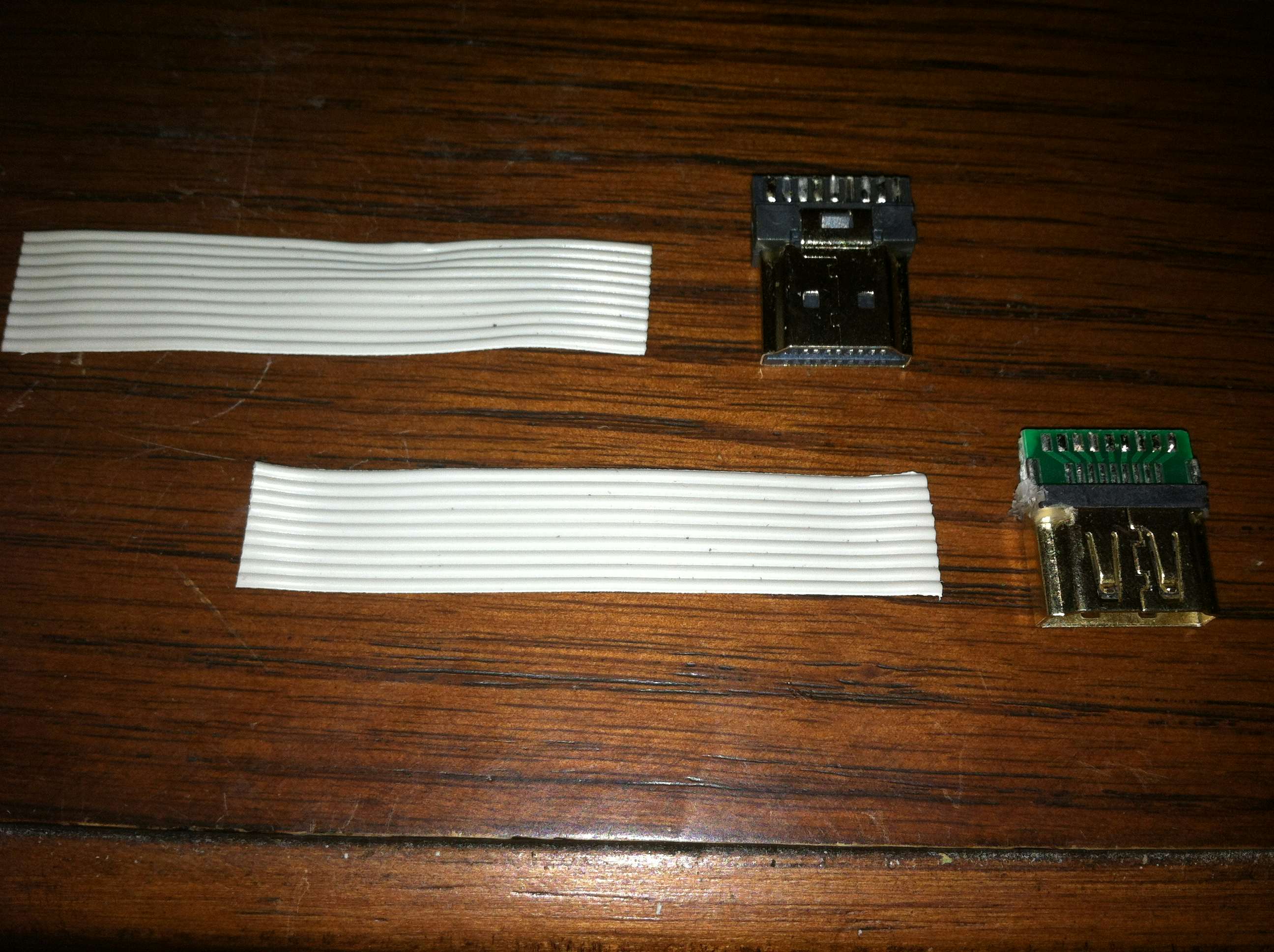 I ordered a right angle HDMI connector for this project however at the time of writing this portion of the project log I have not yet received it. Being impatient I dug around in my parts bin and found both male and female HDMI plugs and put together a simple 4” HDMI extension. I will probably replace this with the right angle adapter when and if it comes in the mail.
