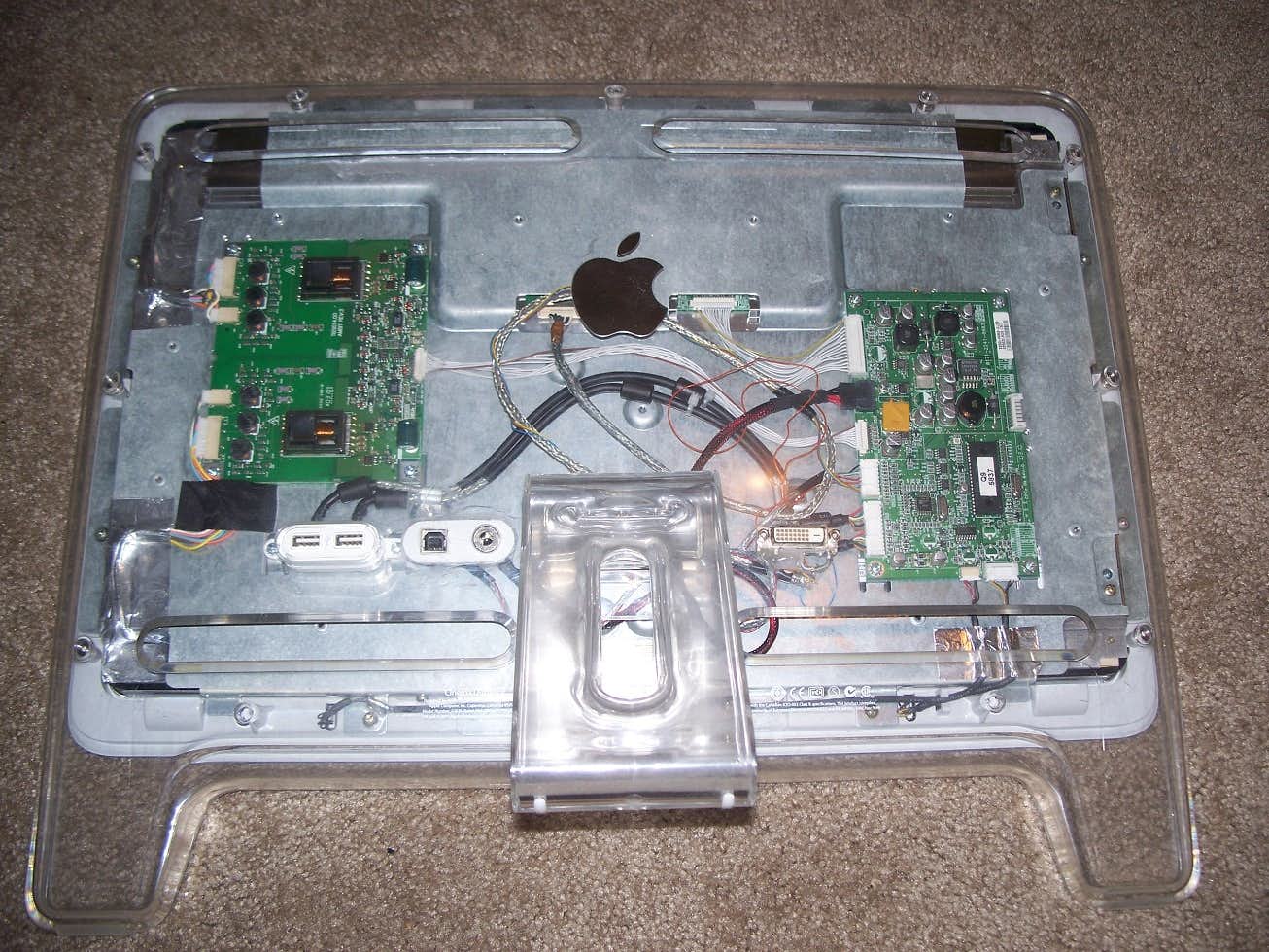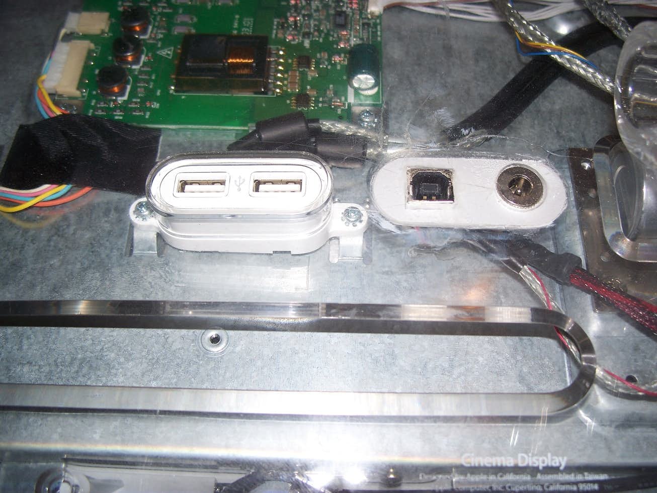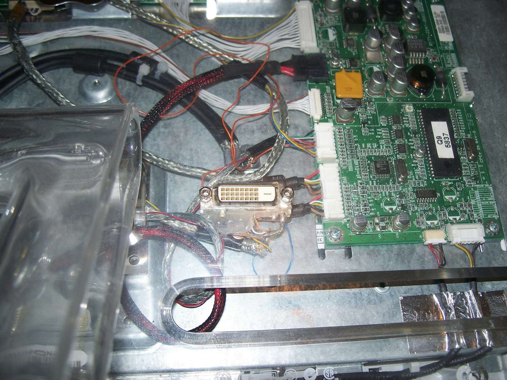 I cut a hole in the back for a DC socket, as well as an input socket for the monitors built in USB hub. I cut a small oval to mimic the look of the embedded usb ports. I need to clean the residue off the plastic I just need the right cleaning solution. The monitor works great and the color is stunning. Both Windows 7 and OSX recognize the panel right away. In the test shots I am using a Mac-Mini to drive the panel using a mini-displayport to DVI converter. Then a DVI cable running to the panel itself.