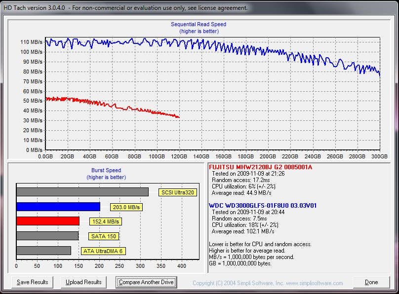 Side profile of the device. And finally some comparative hdtach results with the stock 7200 rpm hitachi drive in my laptop and the velociraptor. Can anyone tell the difference?