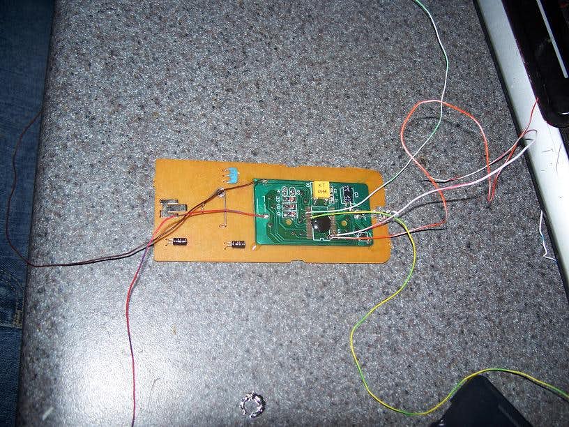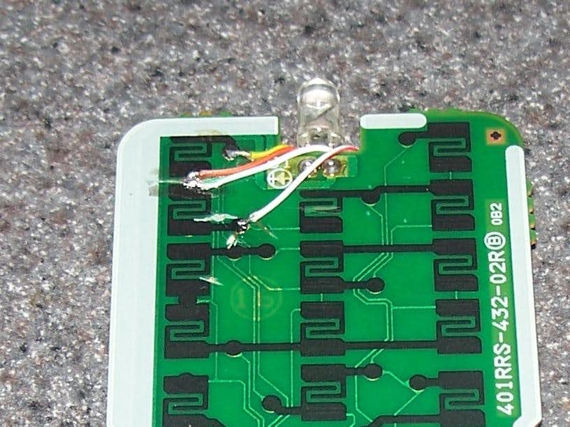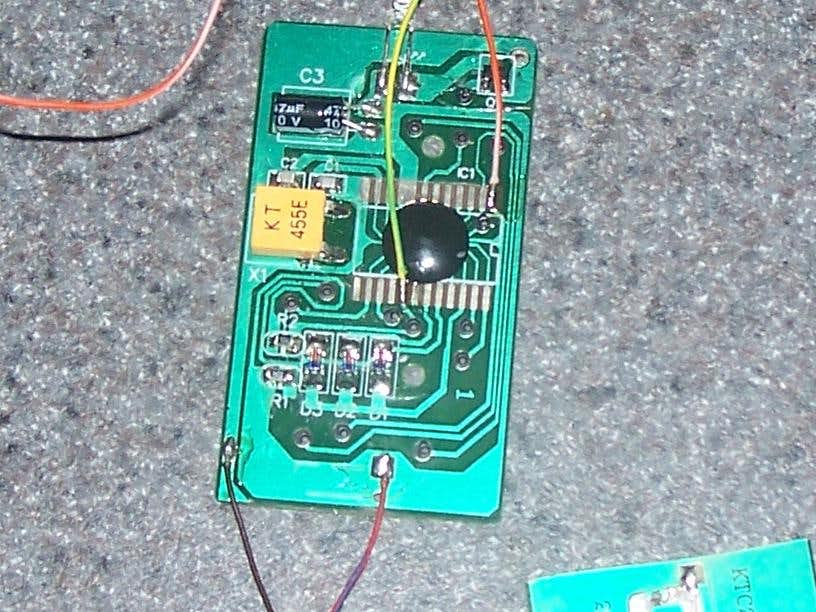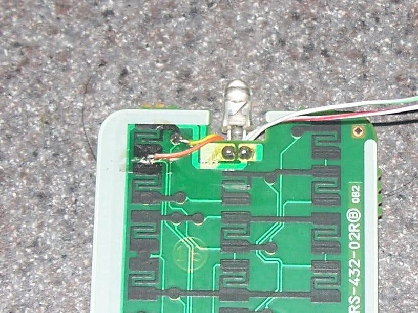 Here is where it got even trickier. Two wires had to be soldered to either side of a small solder pad that connected the traces on the Sony remote to the pads where the buttons connect. The pad had to be sliced in half and wire soldered to either side. This is because electrically the two buttons on the Sony remote shared a common wire. However the LCD remote did not share the same setup, so to make it work they had to be electrically isolated.