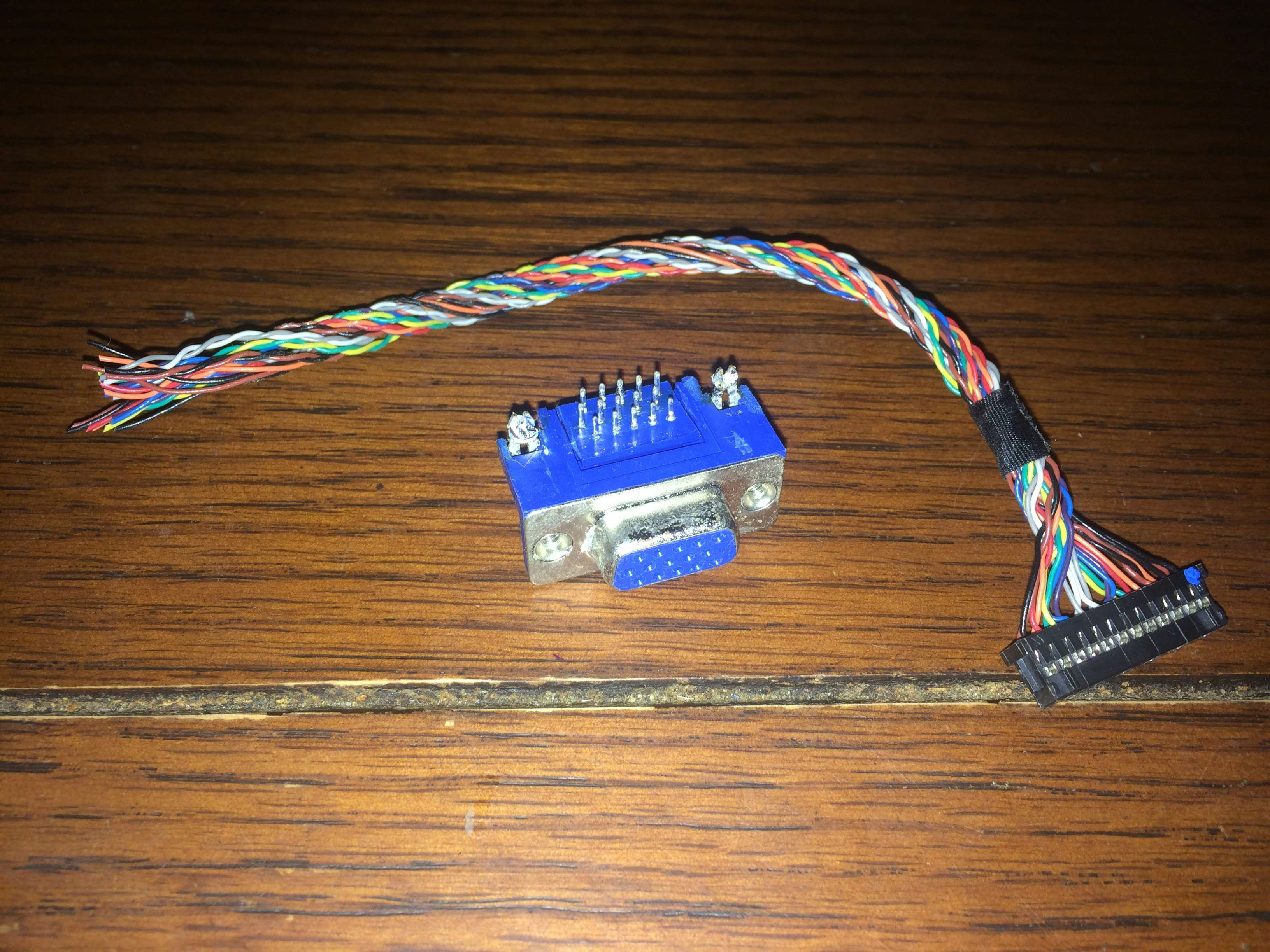Next it was time to construct a cable to fit the magical connector. On a whim I was able to find 3 separate cables in my parts bin that fit this connector and had wires already attached. The nice thing is that most of these connectors allow you to remove the pins so I even had the opportunity to use a red wire for the rgb red signal and a green wire for.. you get the idea. If you don’t have one of these laying around use the links at the bottom of the page to get the appropriate parts from digi-key or your parts supplier of choice. Intrepid users could solder directly to the pins on the motherboard and while this isn’t recommended these units have reached a particular age that all warranties are expired and maybe you want to mod on the cheap.