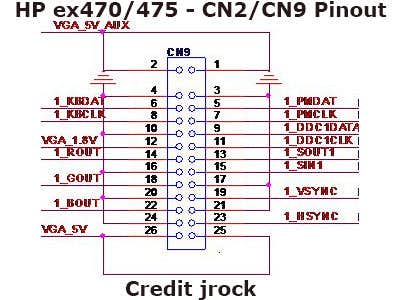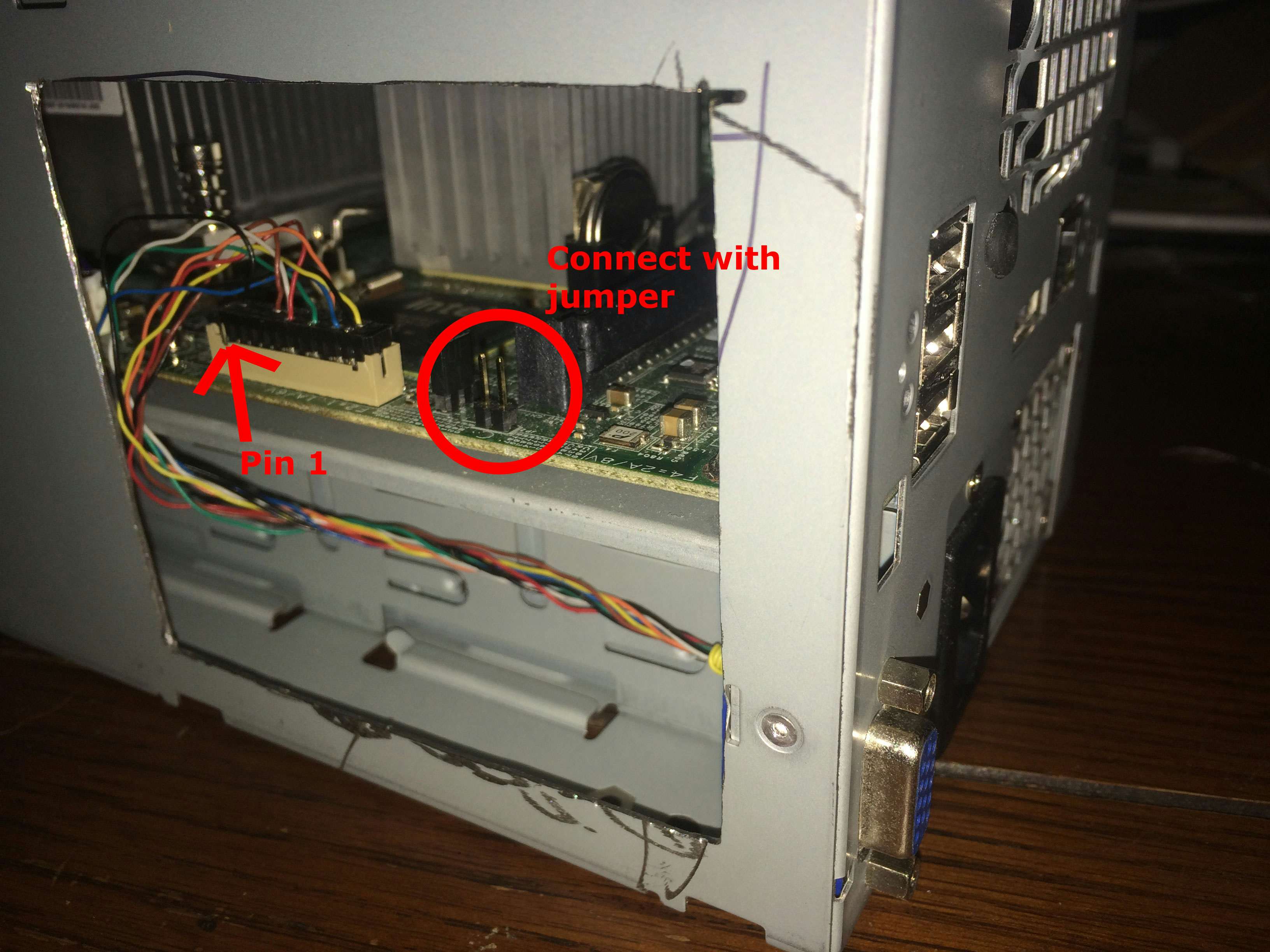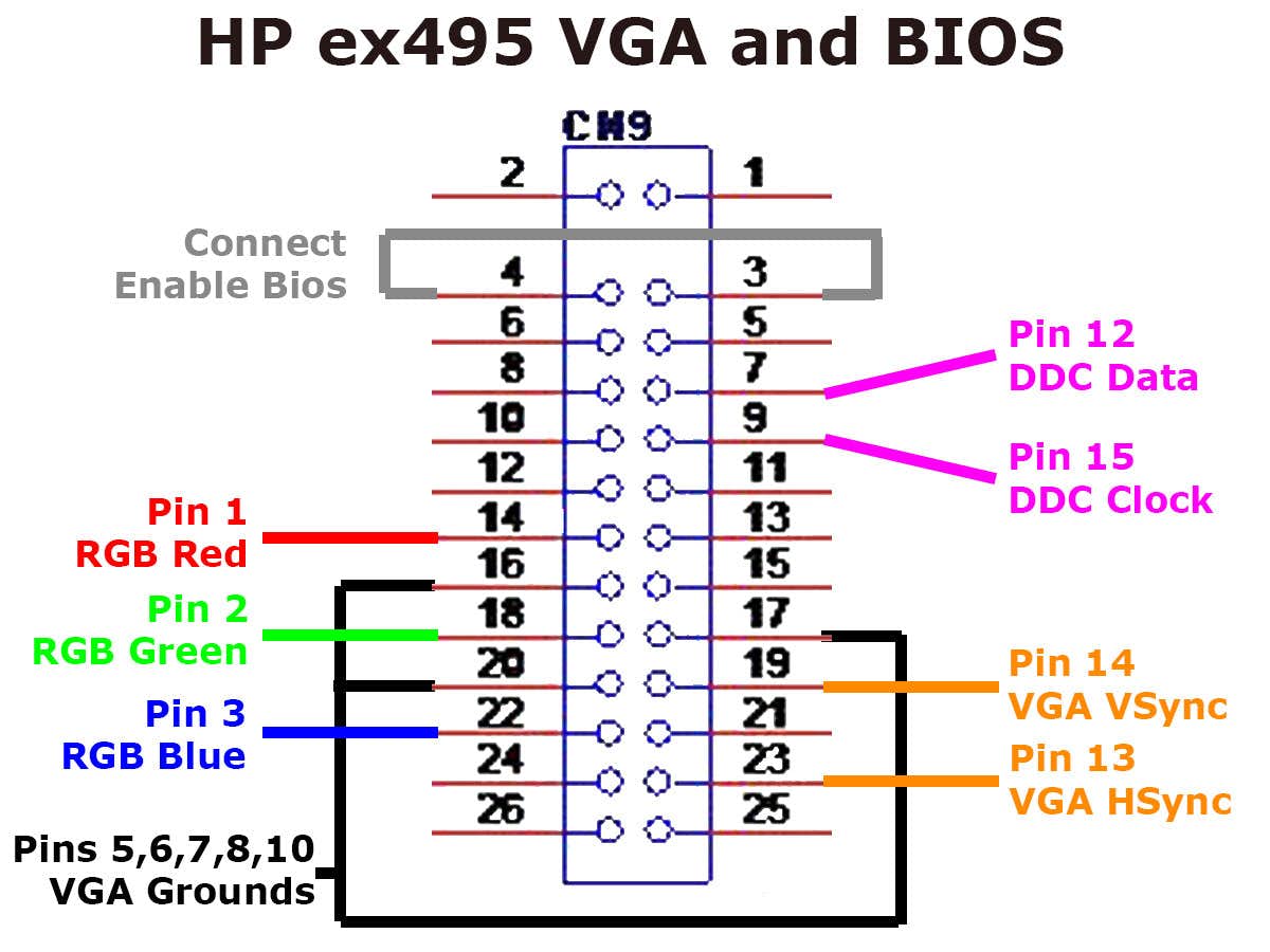 Using the space that is unoccupied by the power supply we can add the VGA connector in the lower left hand corner of the rear of the ex495. Pin 1 of the connector is closest to the front of the unit and lastly connect a jumper to the pins circled in the first image below. This was necessary in addition to the diagrams above to properly enable the interactive BIOS.