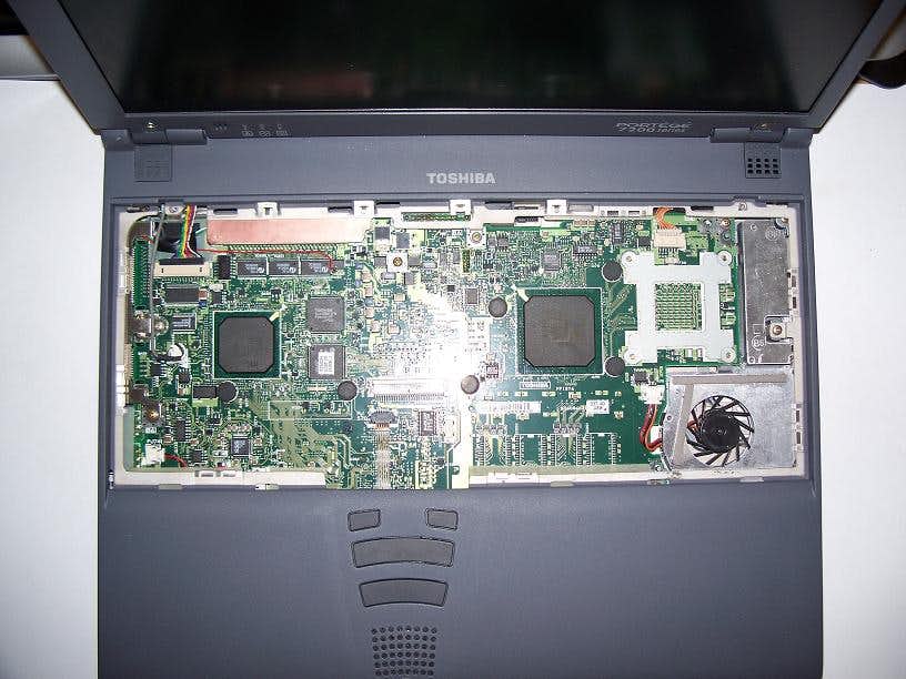 First the entire motherboard needs to be removed from the laptop’s shell, thankfully this is relatively easy and fully comes apart by taking out about 10 screws that hold the two halves of the shell together. Once apart the area we are interested in is located underneath the PCMCIA sockets, these come off of the motherboard by removing 4 screws. Lastly peel back the black anti-static plastic and locate the area around the part labelled RM1, near the center of the area underneath the black plastic.