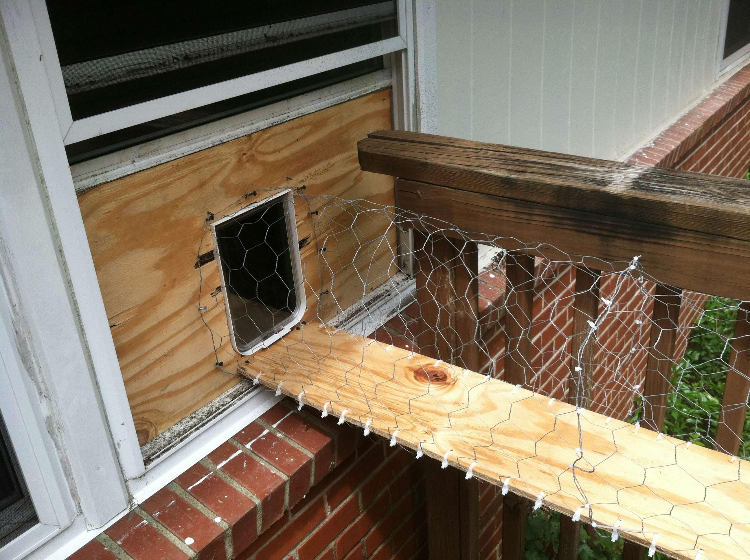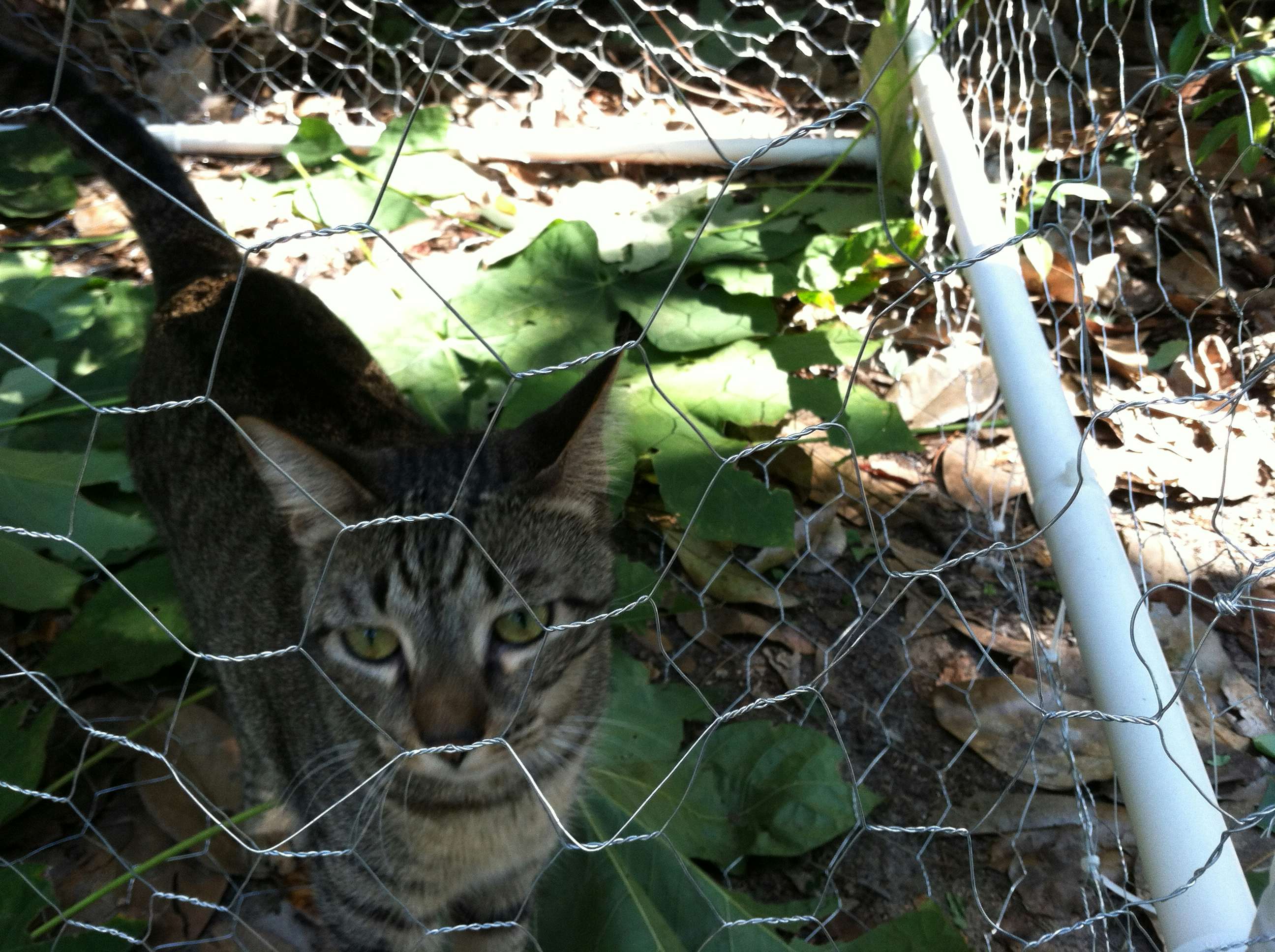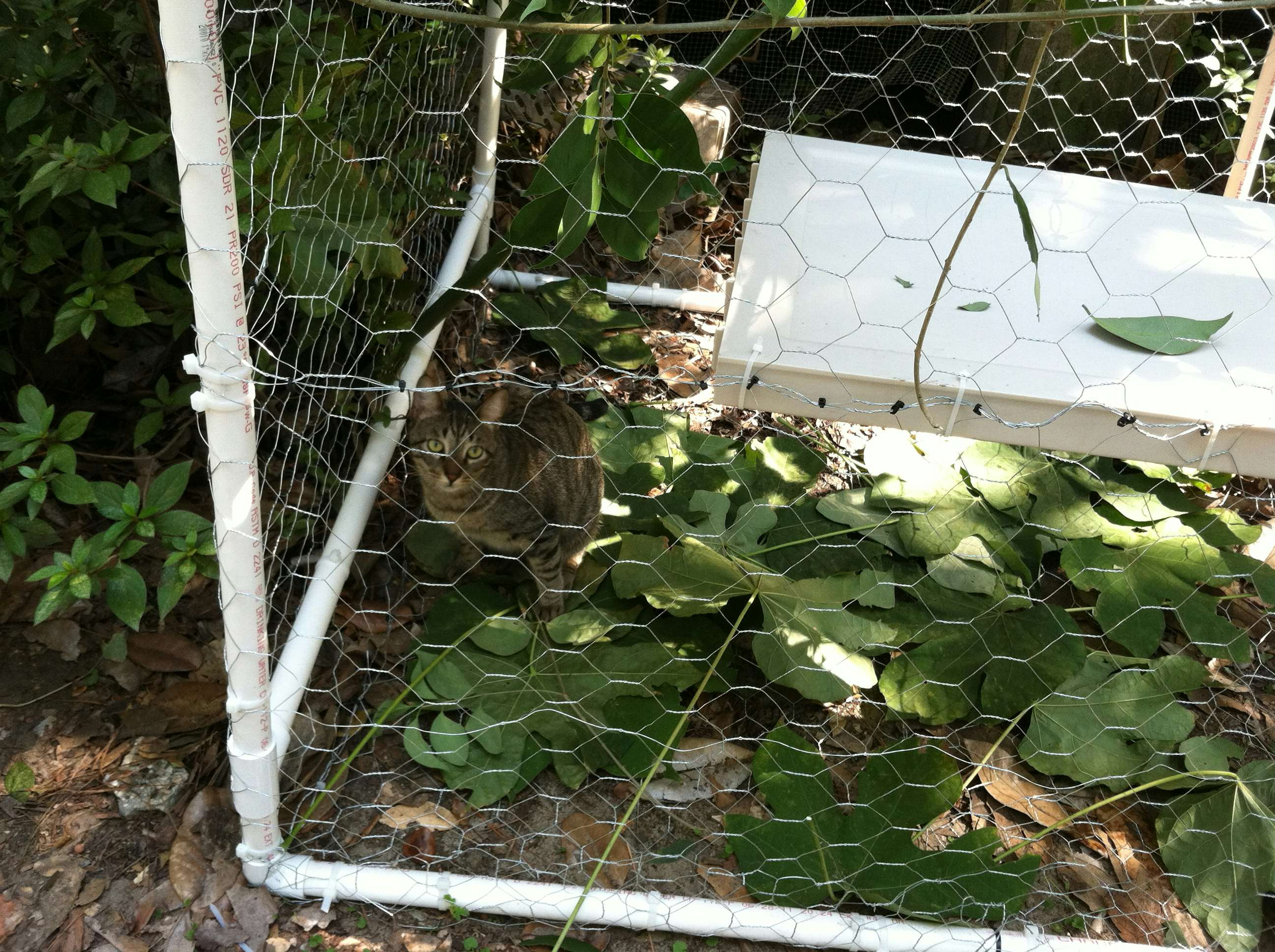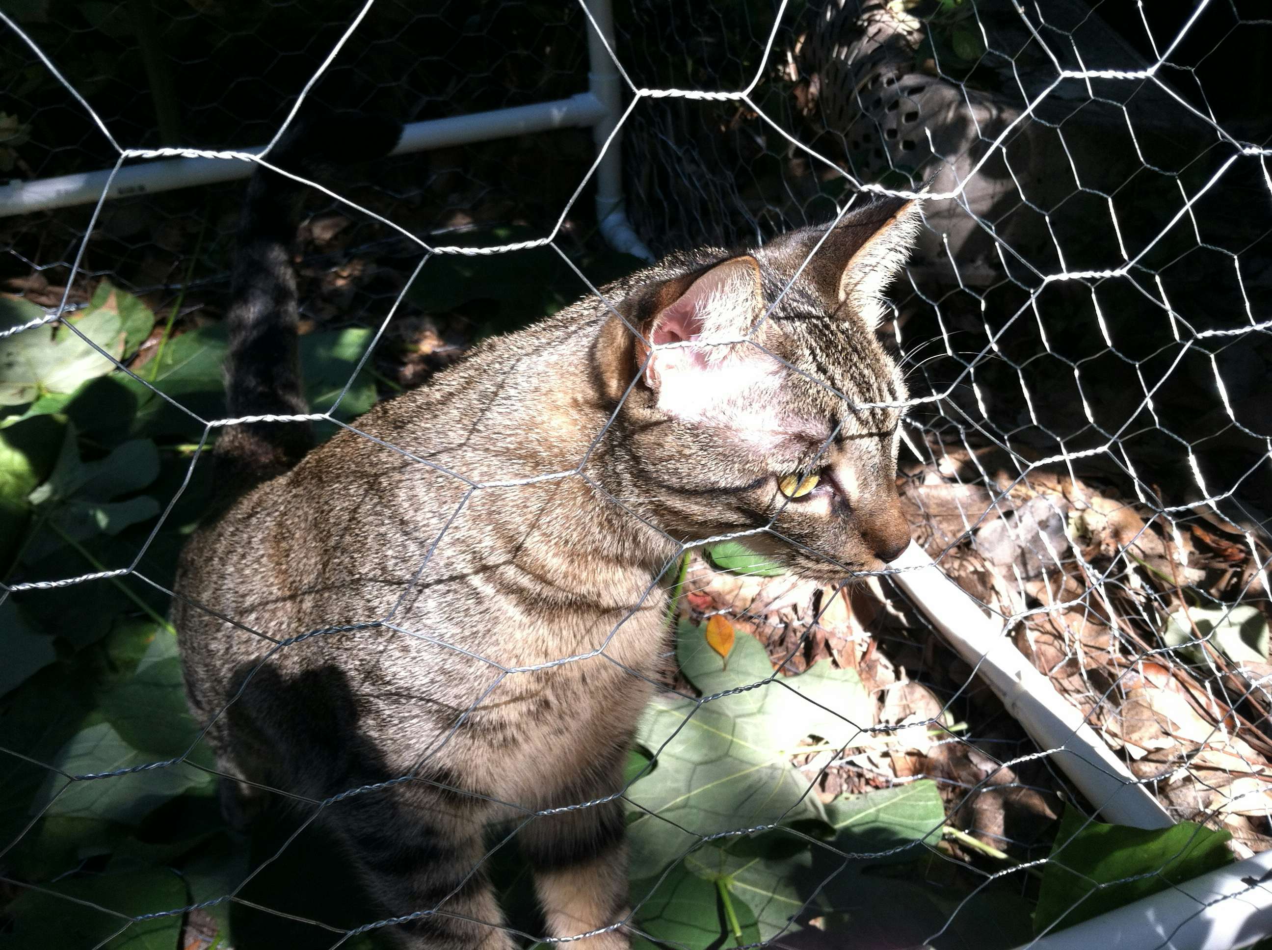Here is Tesla at the bottom of the enclosure where she could nap outside in the shade. Tesla is a smaller cat and her head is much bigger than the holes in the chicken wire and also prevents other cats, dogs, and large rodents from entering the house through the cat door.