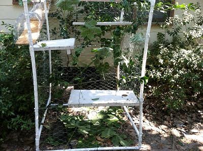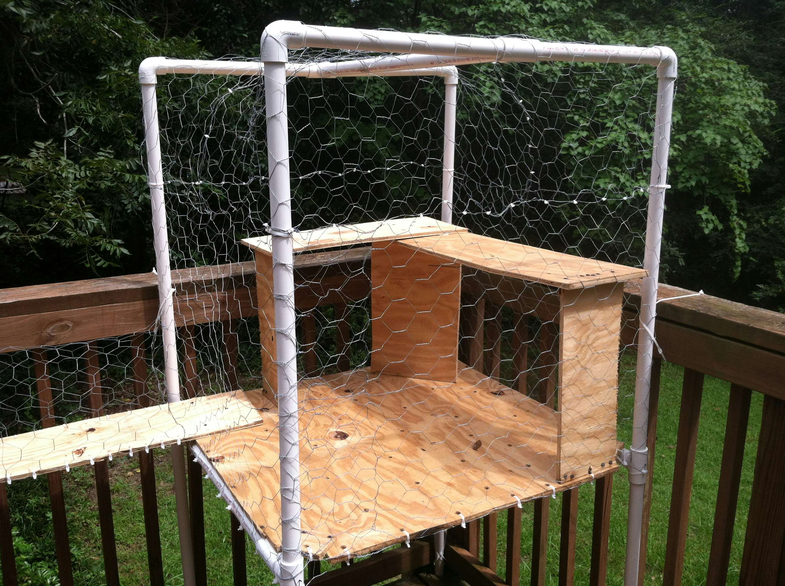 The enclosure stands 6 feet tall and is 4 x 4 feet at the base. Several platforms were installed and hung from the supporting beams so Tesla could jump her way to the bottom or hang out on any level she wanted. The platforms were salvaged from a broken set of plastic drawers, holes were drilled so water would not collect.