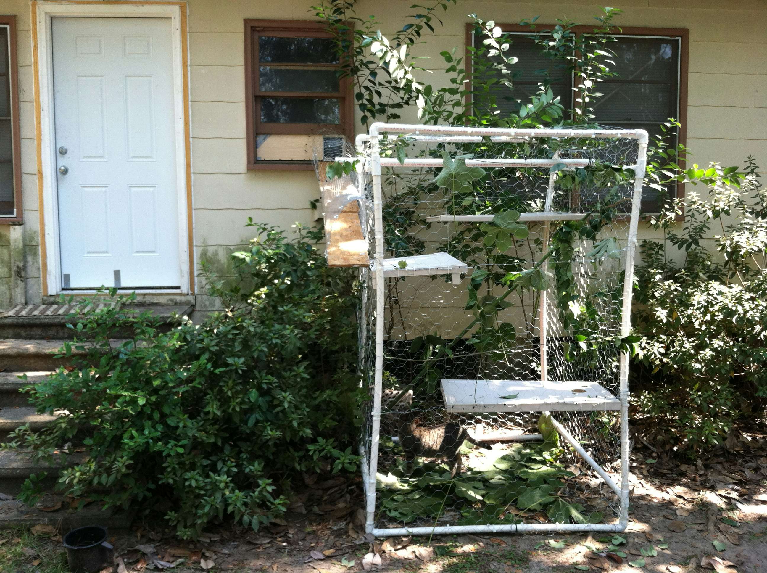 The first version of the outside cat enclosure was built for one of my room mates’ cat Tesla. Constructed out of 2” PVC pipe and 4” chicken wire. The entire enclosure is wrapped in the chicken wire with a small hole cut on the side where the ramp connects. The ramp connects to a small catdoor installed in a piece of wood installed in the window. The cat can go outside any time she wants, the cat door has a locking mechanism so we can block off the outside if the need arises.