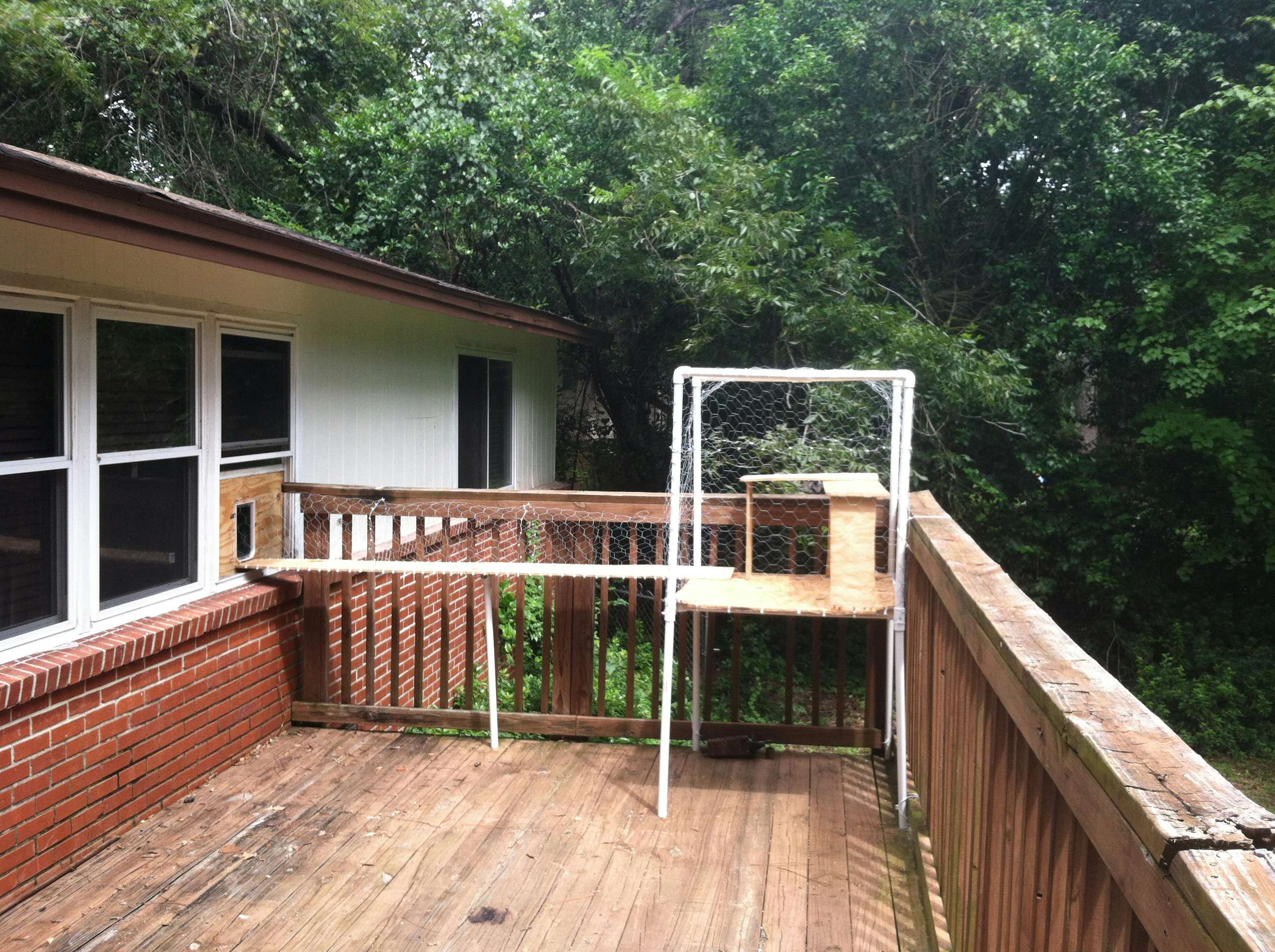 The enclosure is placed in an unused section of our deck with a ramp leading from the inside to the larger enclosed area at the corner of the deck.