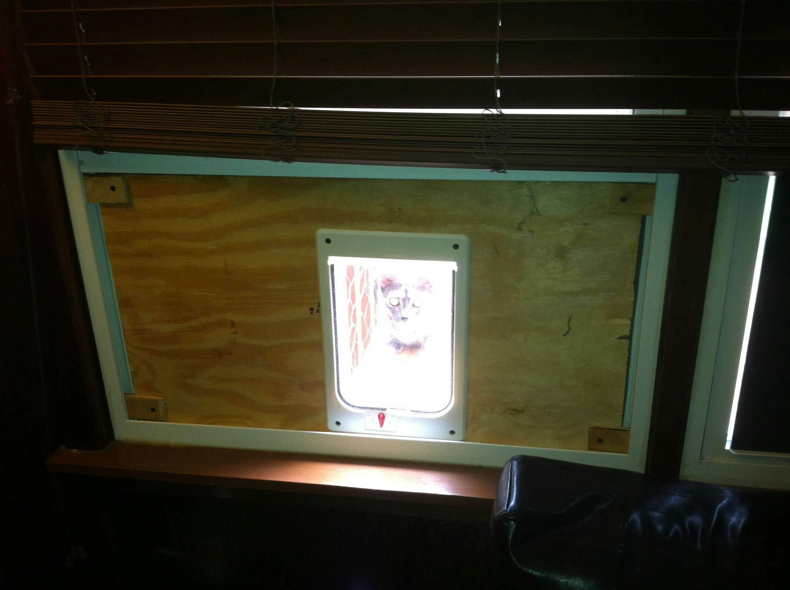A medium sized cat door was cut and placed inside a larger piece of wood that is braced inside a window frame. Weather stripping provides a tight seal against the elements. In the second picture you can see small braces that are attached from the inside and an awesome shot of Lucy close to the cat door.
