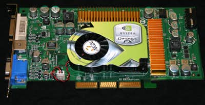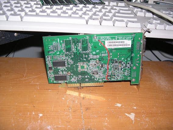 First things first I had to take that silly sticker off the cooler, which revealed a really nice looking mirrored metal plate, which not only looks better, but does not say nvidia all over my ati card. It was a complete pain in the rump to take off, took about 20 minutes and a lot of Alcohol (the rubbing kind). Also there is the back view of the card, as you can see the wire comes out of the hole at the back and down to the A1 pin on the AGP connector, which btw is the only line that runs from the motherboard to the AGP card that carries 12v, im glad it was easily accessible.