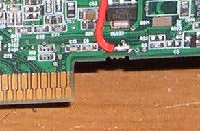This shows in greater detail the hole that was drilled to allow the +12v wire that ran to the fan controller to run to the back of the card to get the required 12v. This shows the solder point at which i soldered my fan controller wire to the A1 pin on the AGP connector.
