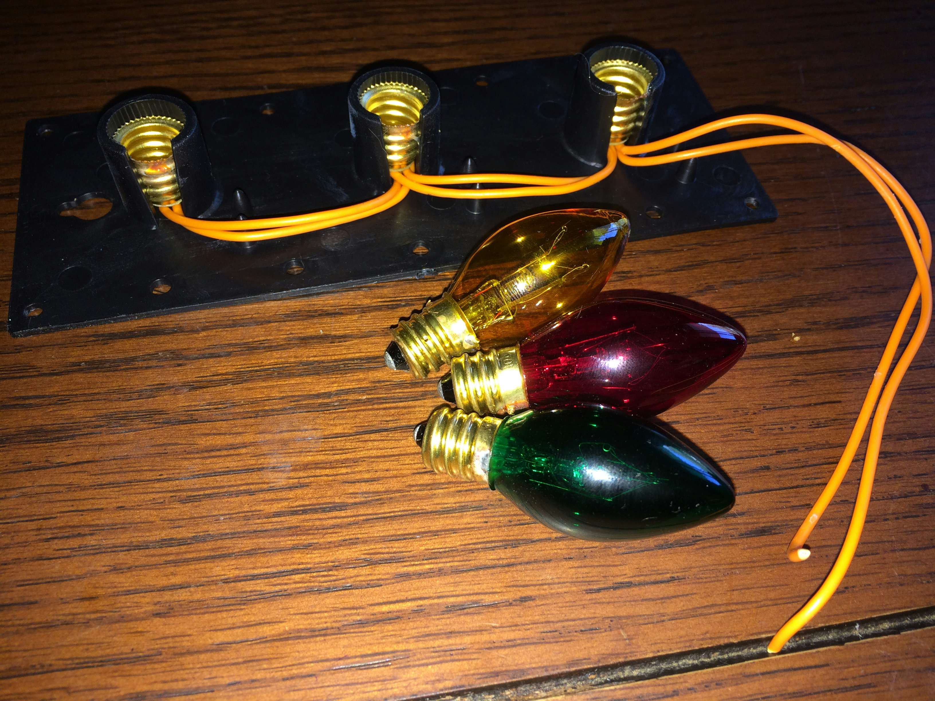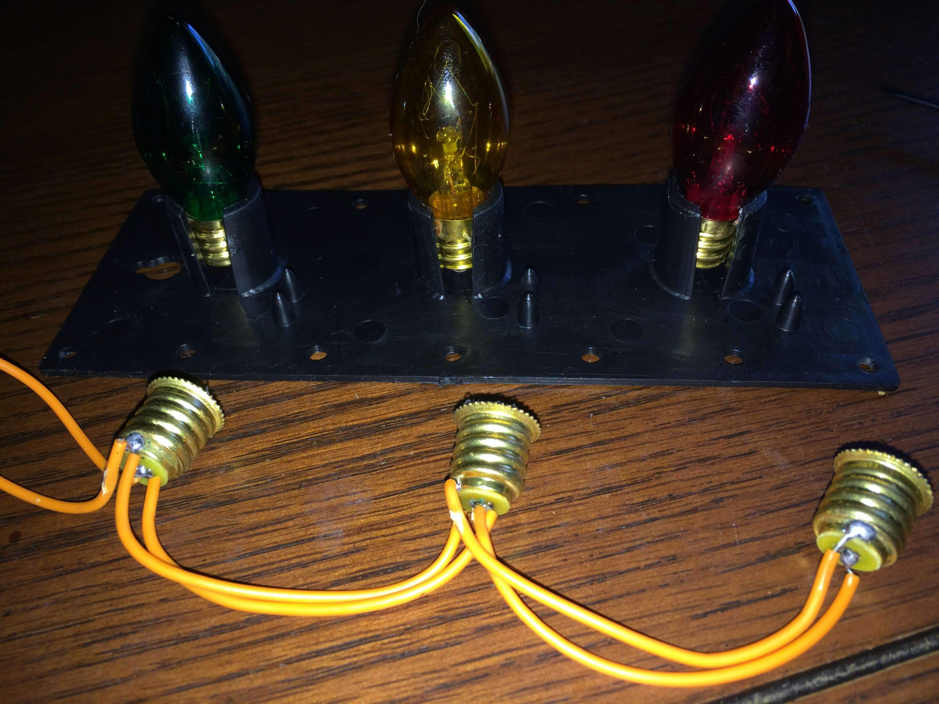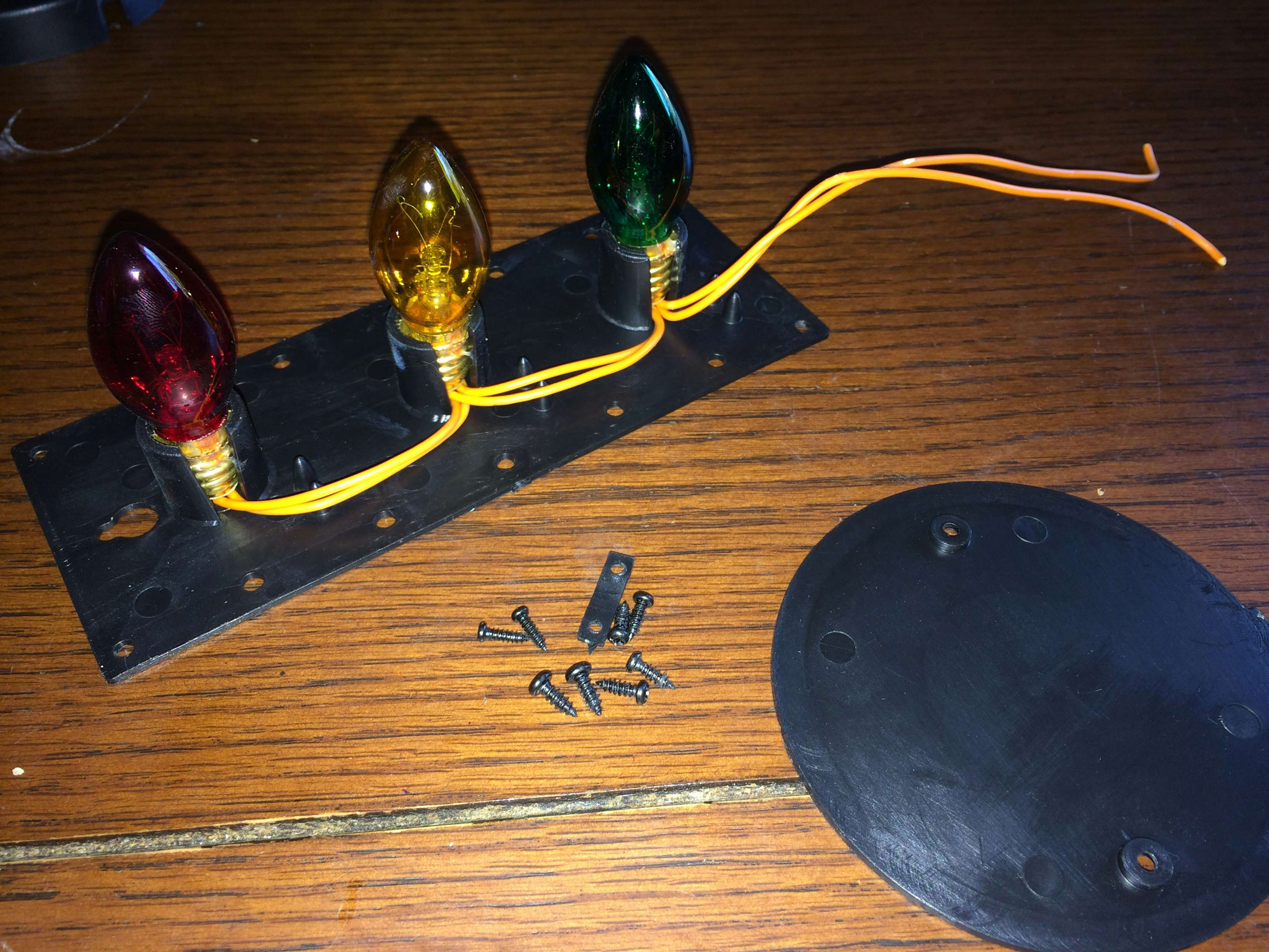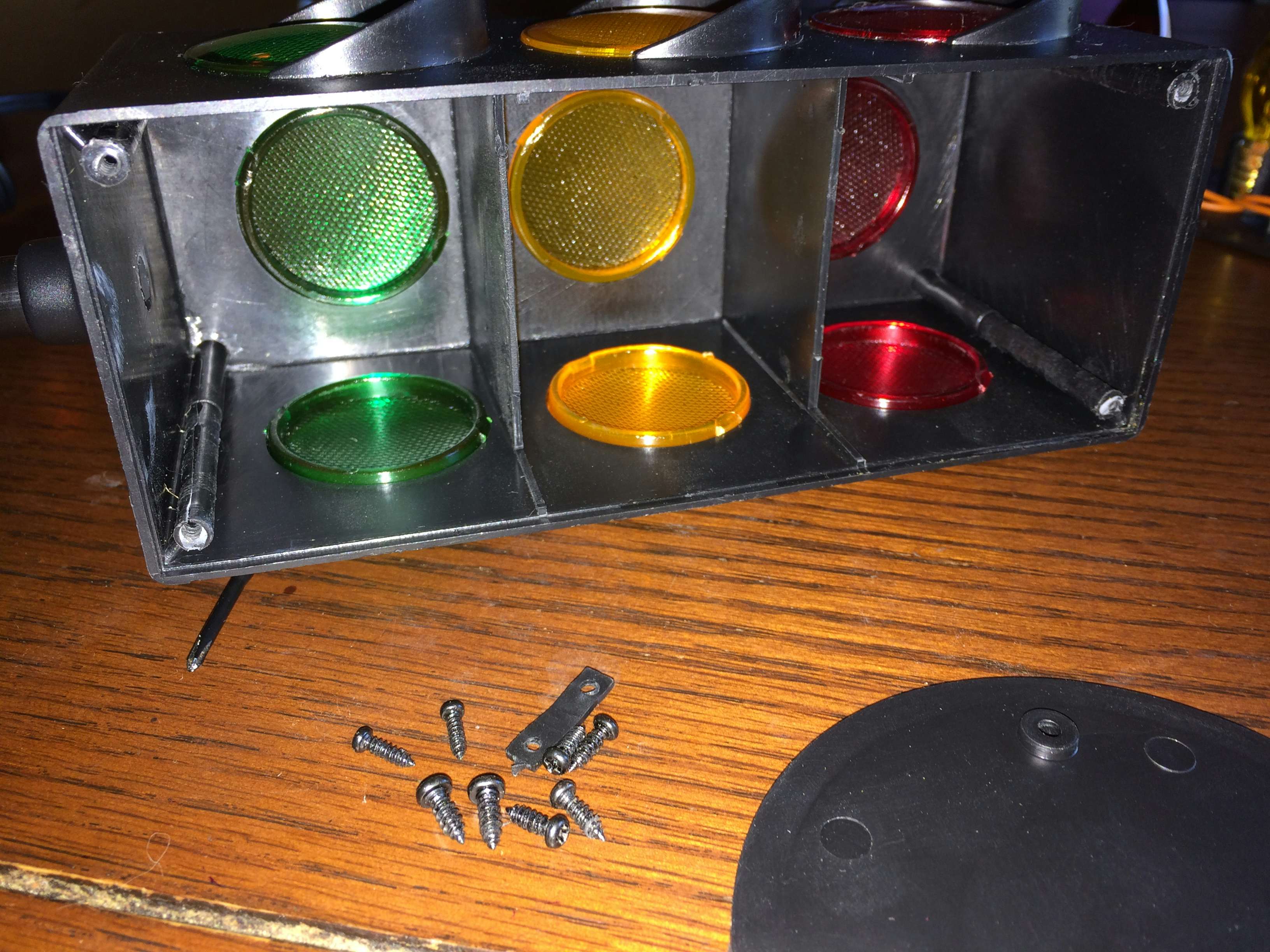 Next the back of the traffic light itself is removed. Here we see that the light source are standard miniature bulbs that are actually red, yellow, and green respectively. Assuming that this product was built to the lowest possible price point the fact that the bulbs themselves are colored means standard white or clear bulbs were too bright and/or washed out the color on the lenses.