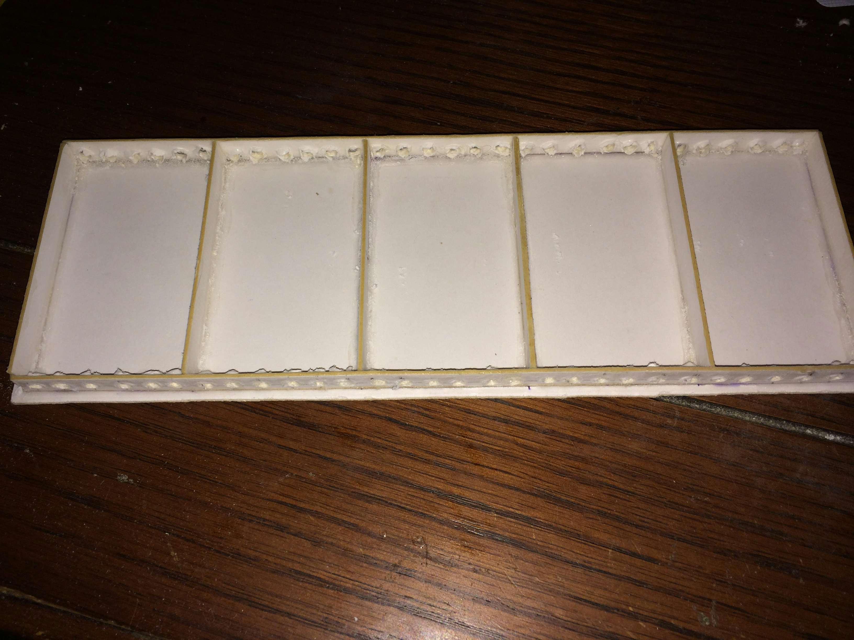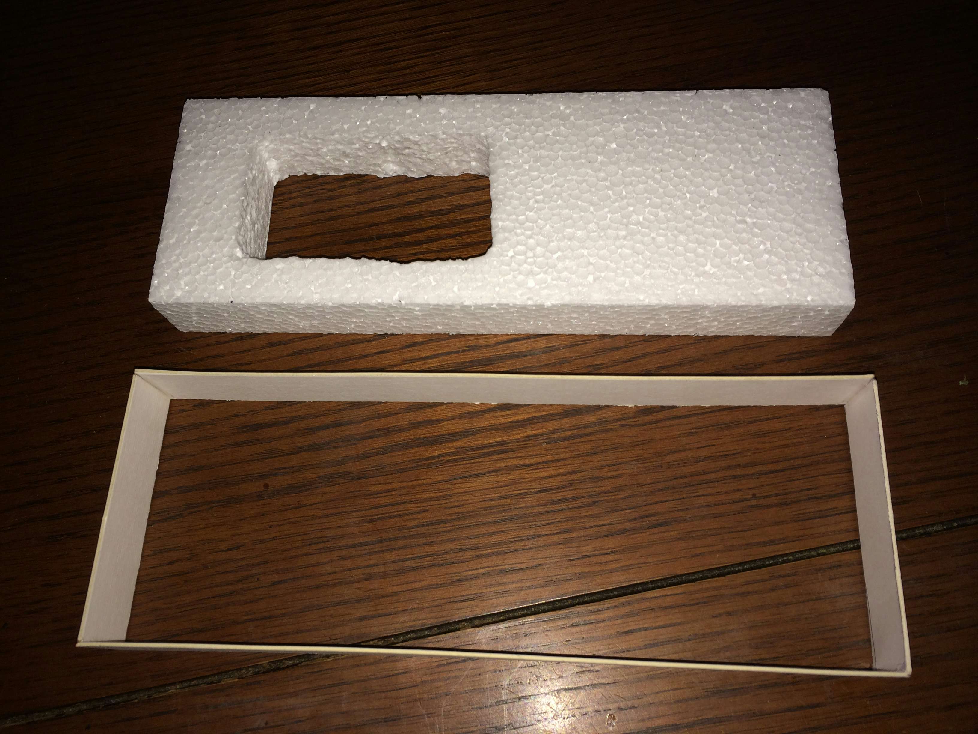 First a series of pieces were cut to the same general dimensions as the styrofoam that was removed earlier and then glued together with my super glue of choice. This frame will act as a spacer between the front piece of glass and the rear board and will be used as a basis for attaching the remaining bits.