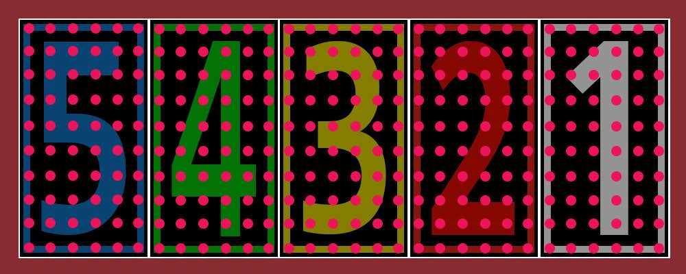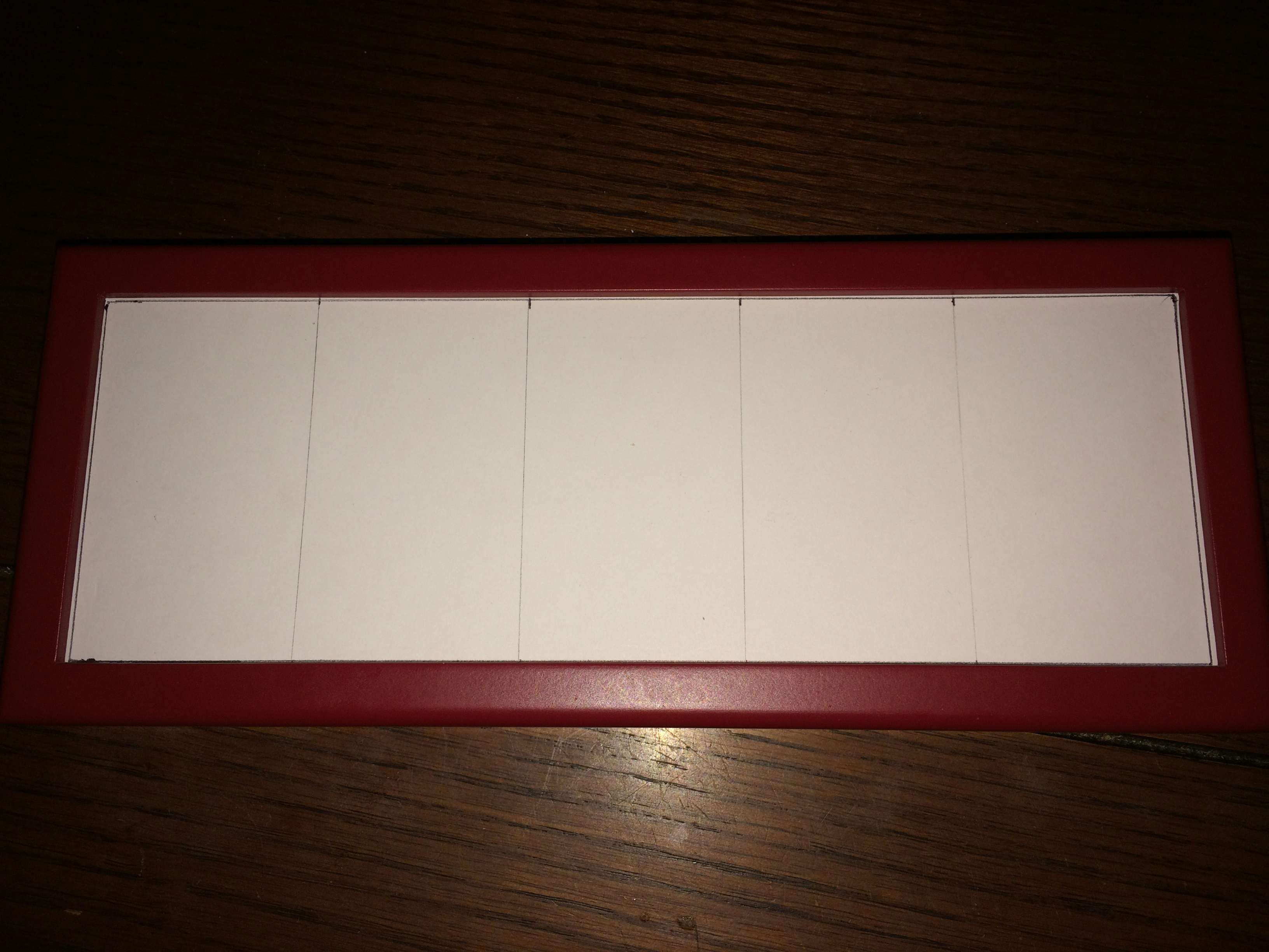 The images below represent the dimensions of the frame with its border shown in red, the white lines indicate the internal framing that will need to be done to prevent light leakage between the various numbers. When printed on transparency film only the black and colored area where the number and its border are will be shown and then will be used as an overlay on top of the individual number cells.