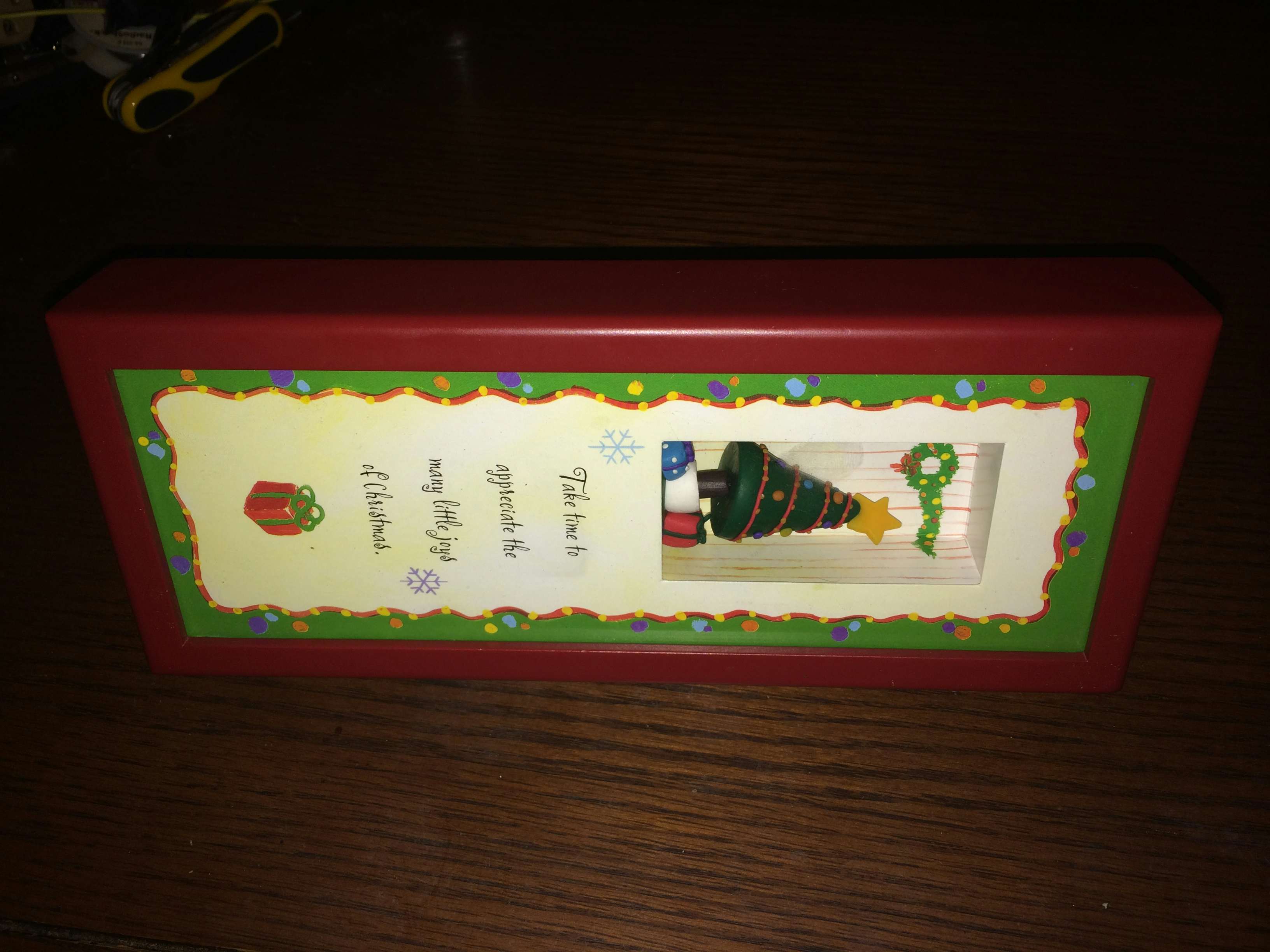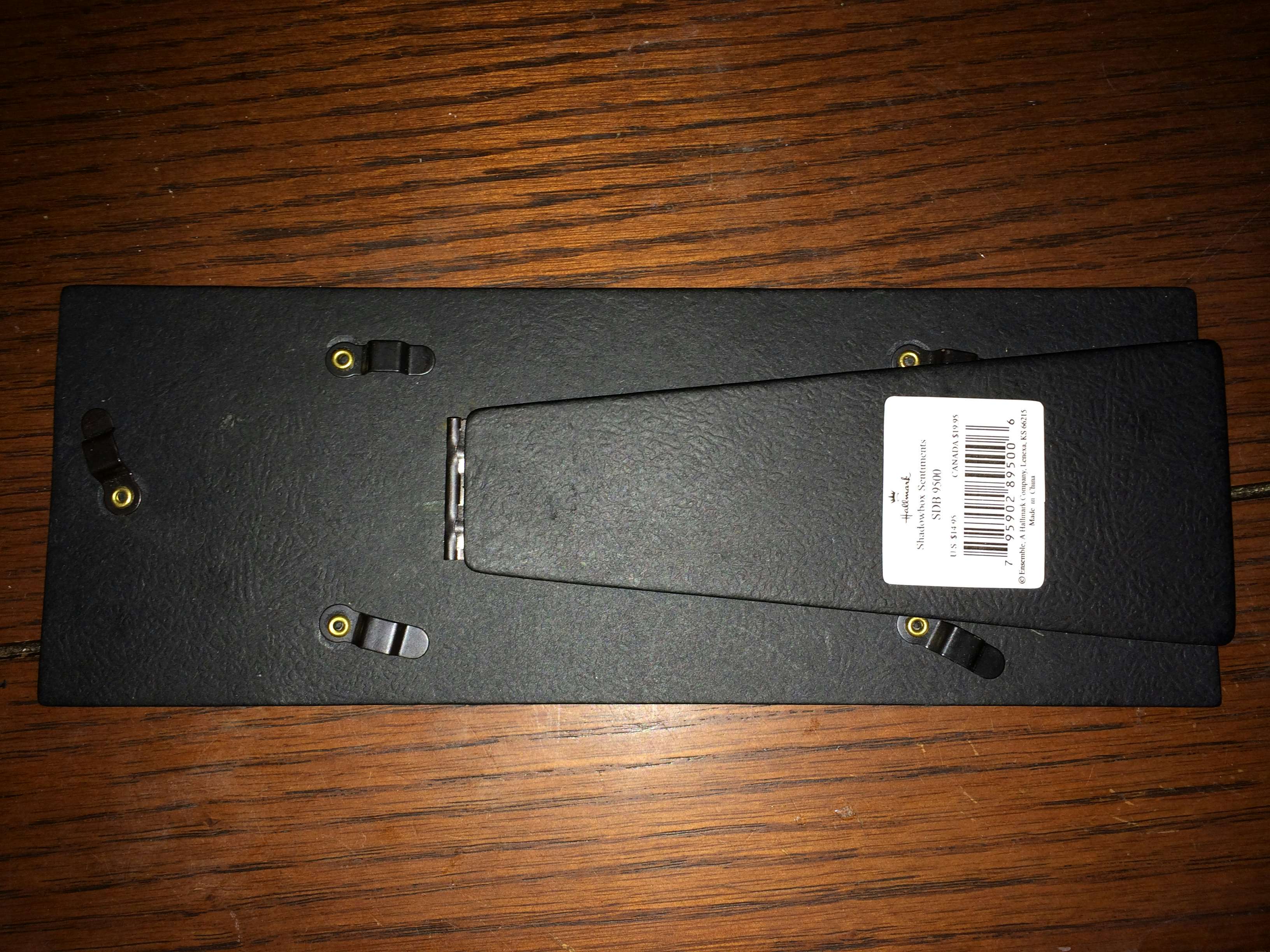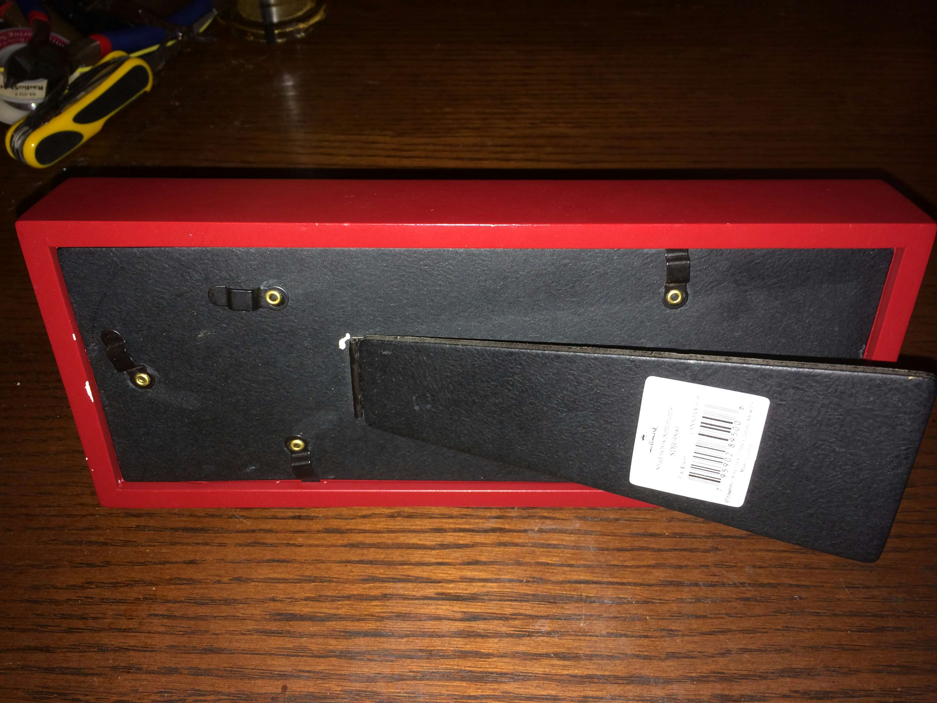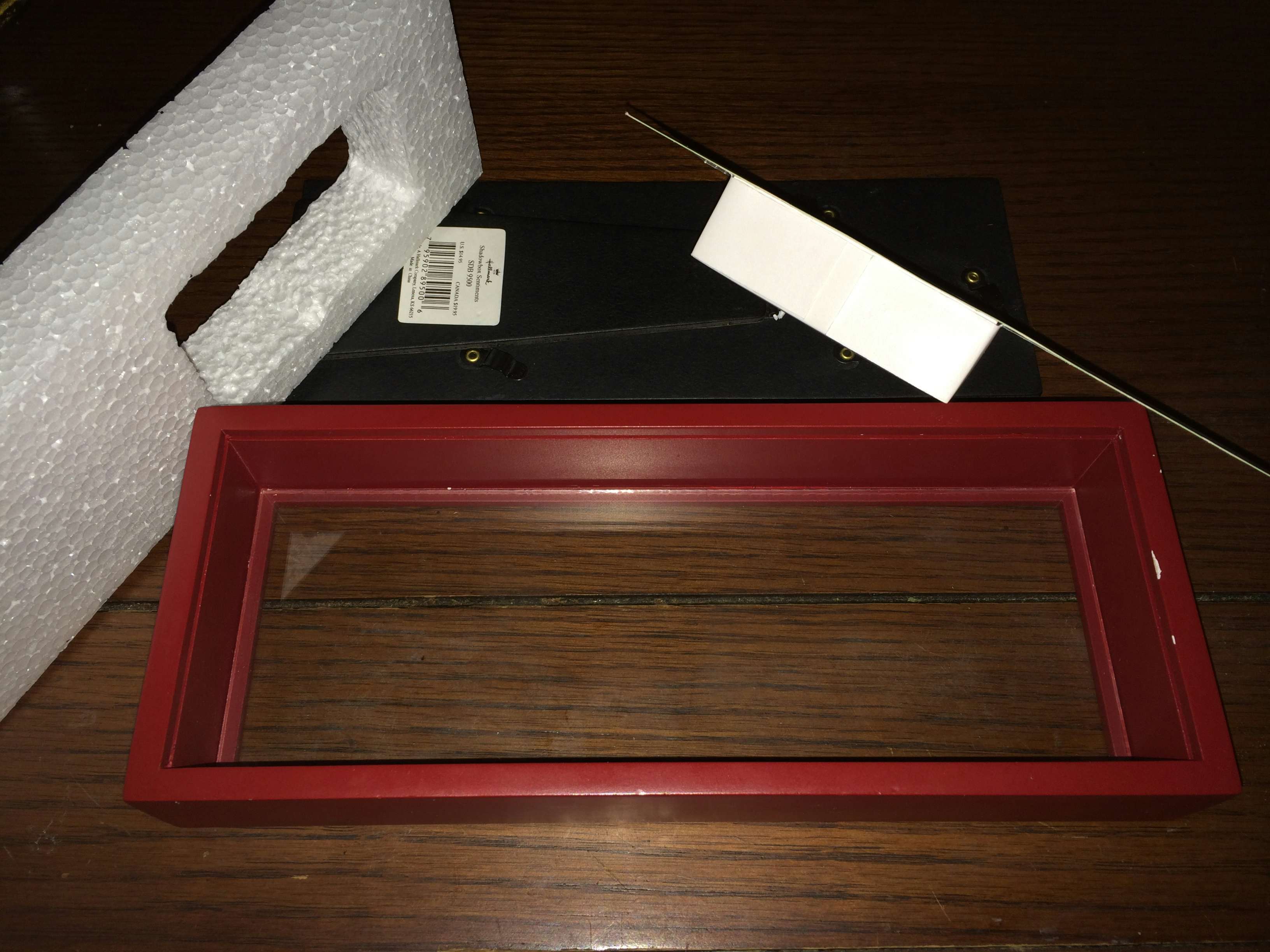 Luckily I was able to find a second-hand Hallmark Shadowbox Sentiments that roughly matches the red color used by my current employer and is 4 inches tall, 10 inches long, and 1.25 inches deep. These frames can be found in black as well and they all appear to come with various themed bits inside that I simply discarded.