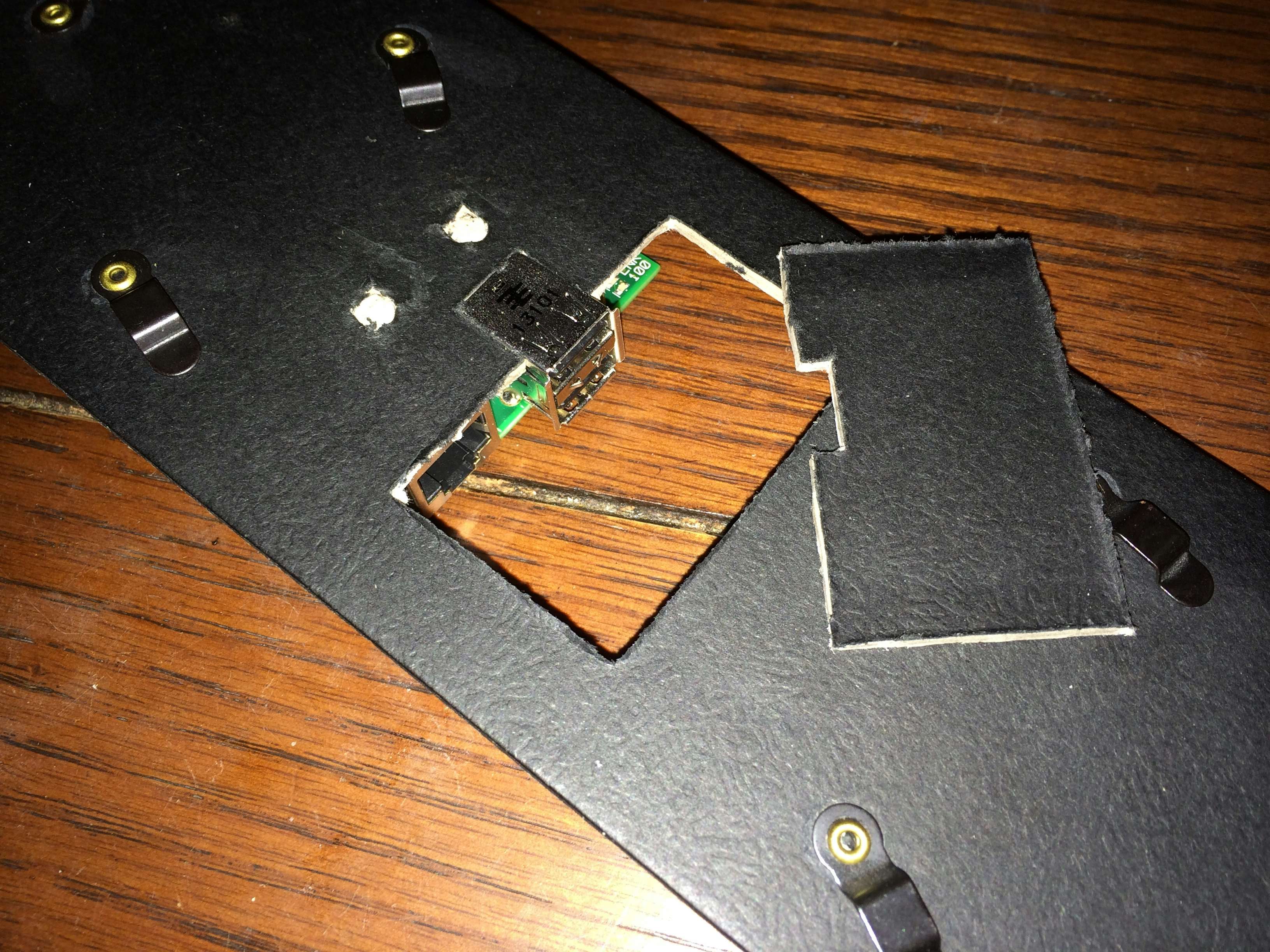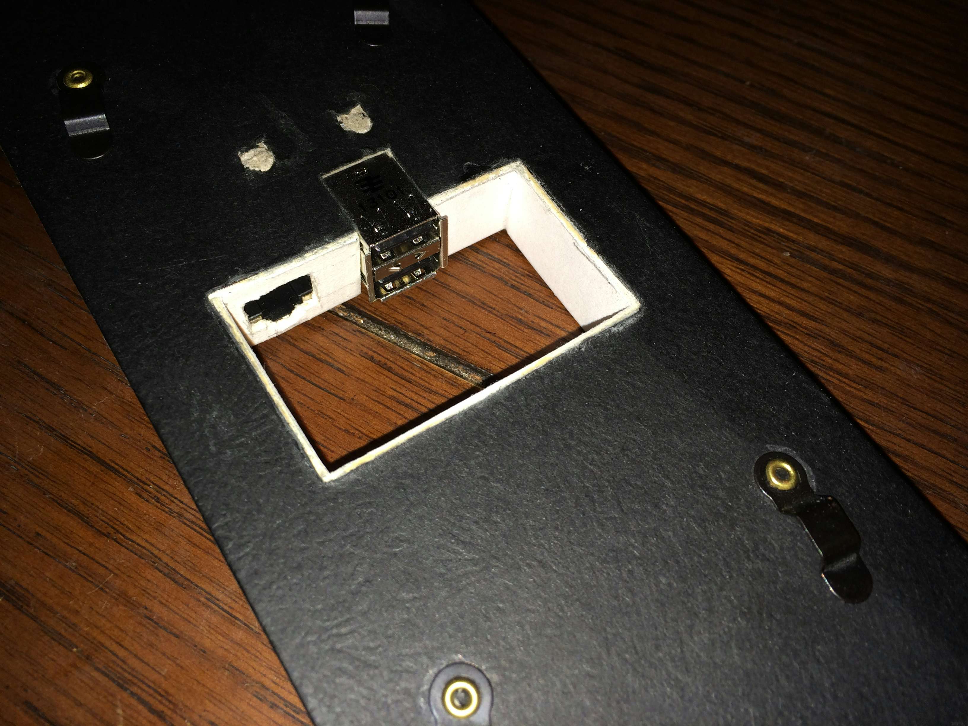 The first step was to pick a location and cut out a hole in the rear plate that would be large enough to accommodate the power connector, usb ports, and ethernet with a small bit of room to work with. It was important to keep this area as small as possible to ensure there would be room on the other side of the frame to mount the transistor board.