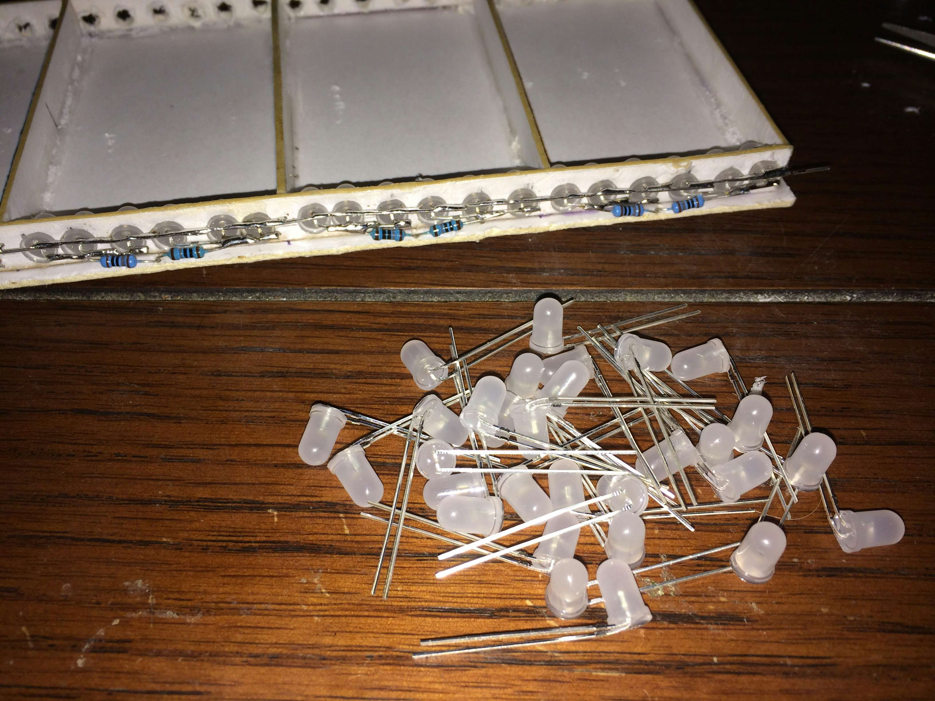 The LED’s are then arranged with their two pins all facing the same direction and soldered in a line connecting all the ground pins together on a single rail. The positive sides are grouped in sets of 3 and cuts down the amount of resistors needed by a third from 60 to just 10. Lastly the resistors are grouped in sets of two with each set representing either the top or bottom of a particular digit.