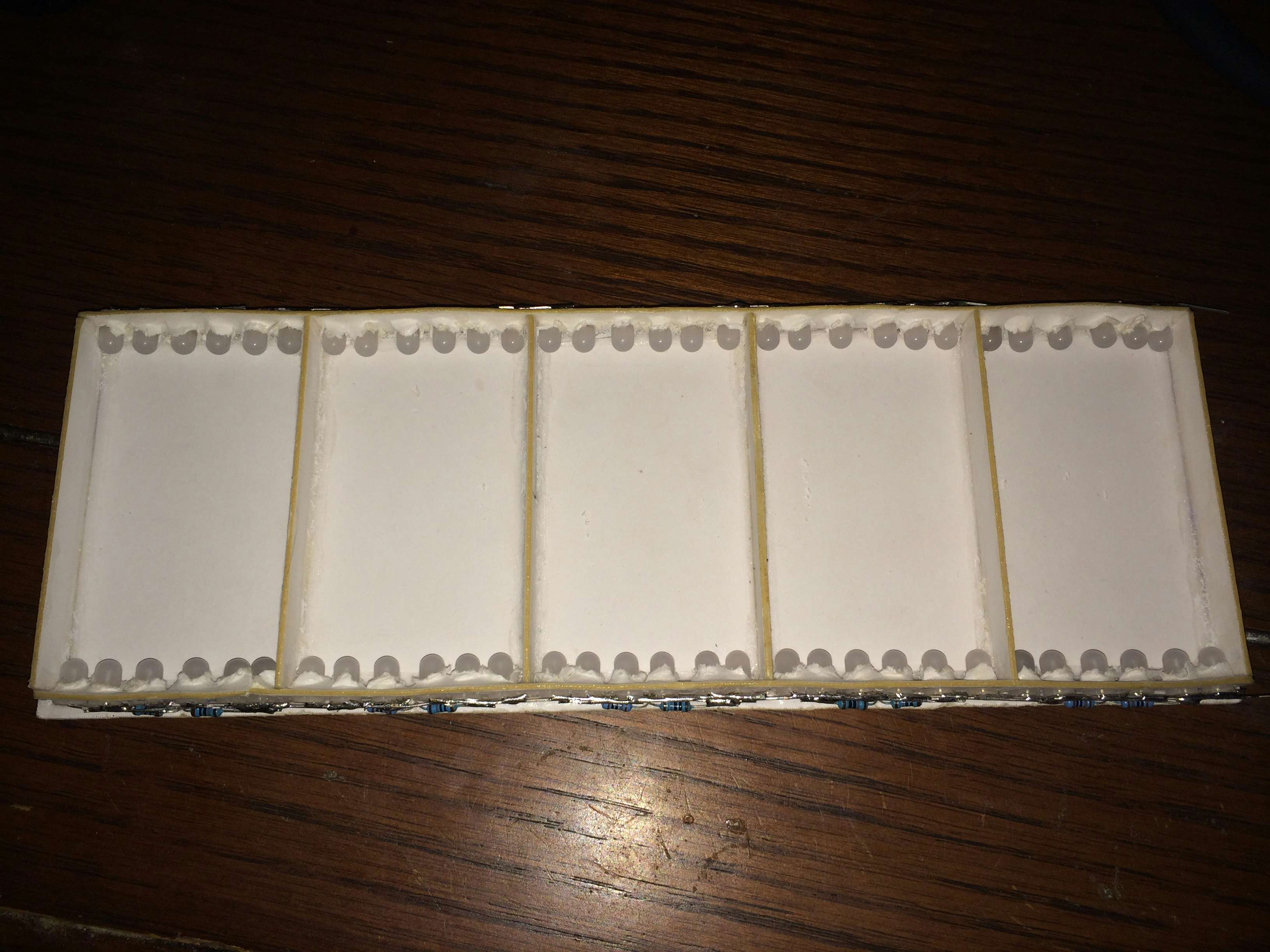 It was now time to construct the LED display that will be used to illuminate the digits of the Defcon sign, originally I was going to have a grid of 6 x 10 LED’s for each digit but it quickly became apparent that space was more limited inside than previously anticipated. As a compromise I discovered it would be possible to illuminate the digits from the top and bottom and cut down the amount of LED’s by one fifth from 300 to just 60 in total.