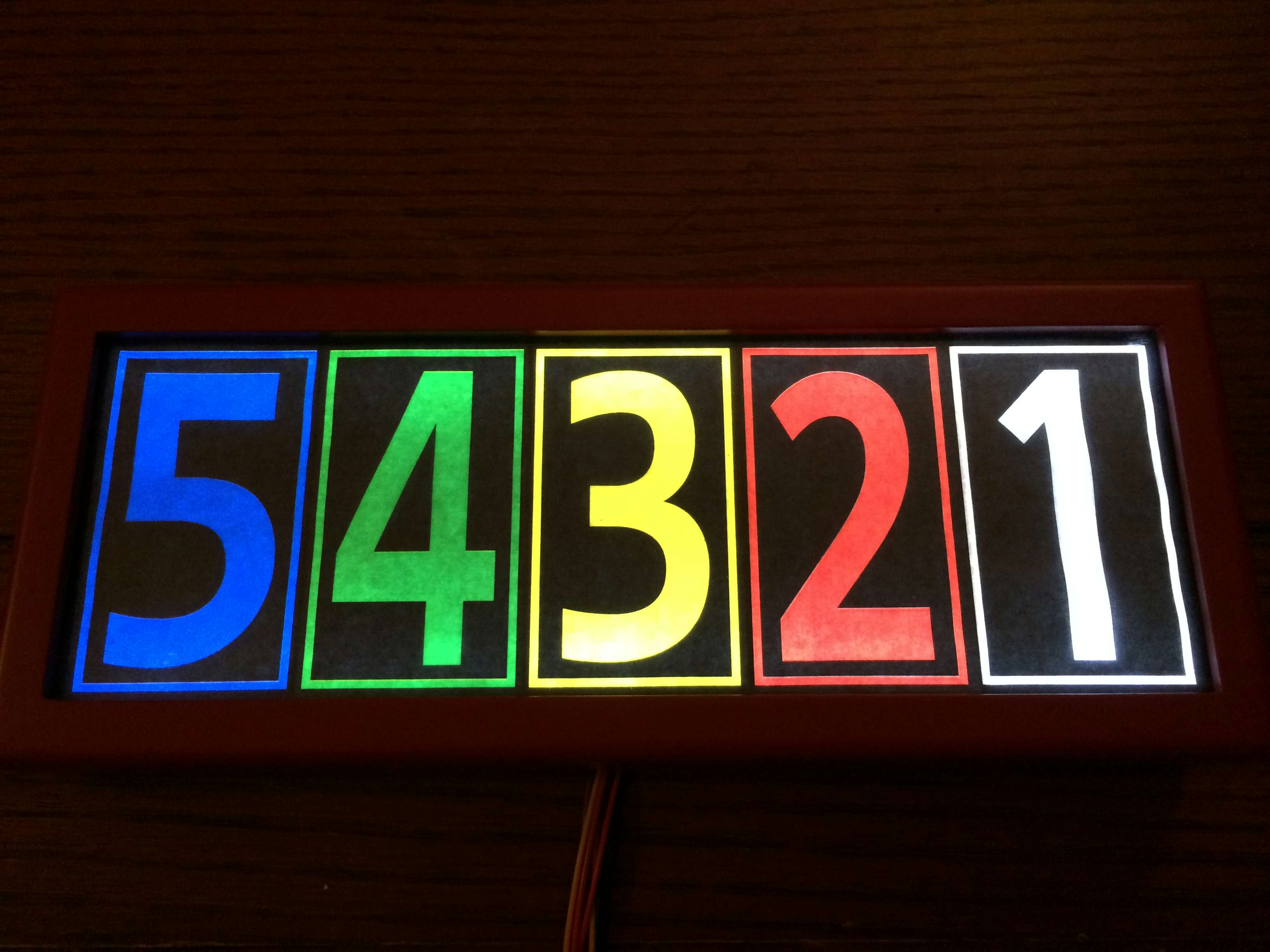 Since the front-end of this project is really just a printed sheet it was easy to swap out the number template for one themed to match the various button flair colors. Since the defcon sign only has 5 sections I set the first section (blue) to represent times between 60 and 42 seconds.