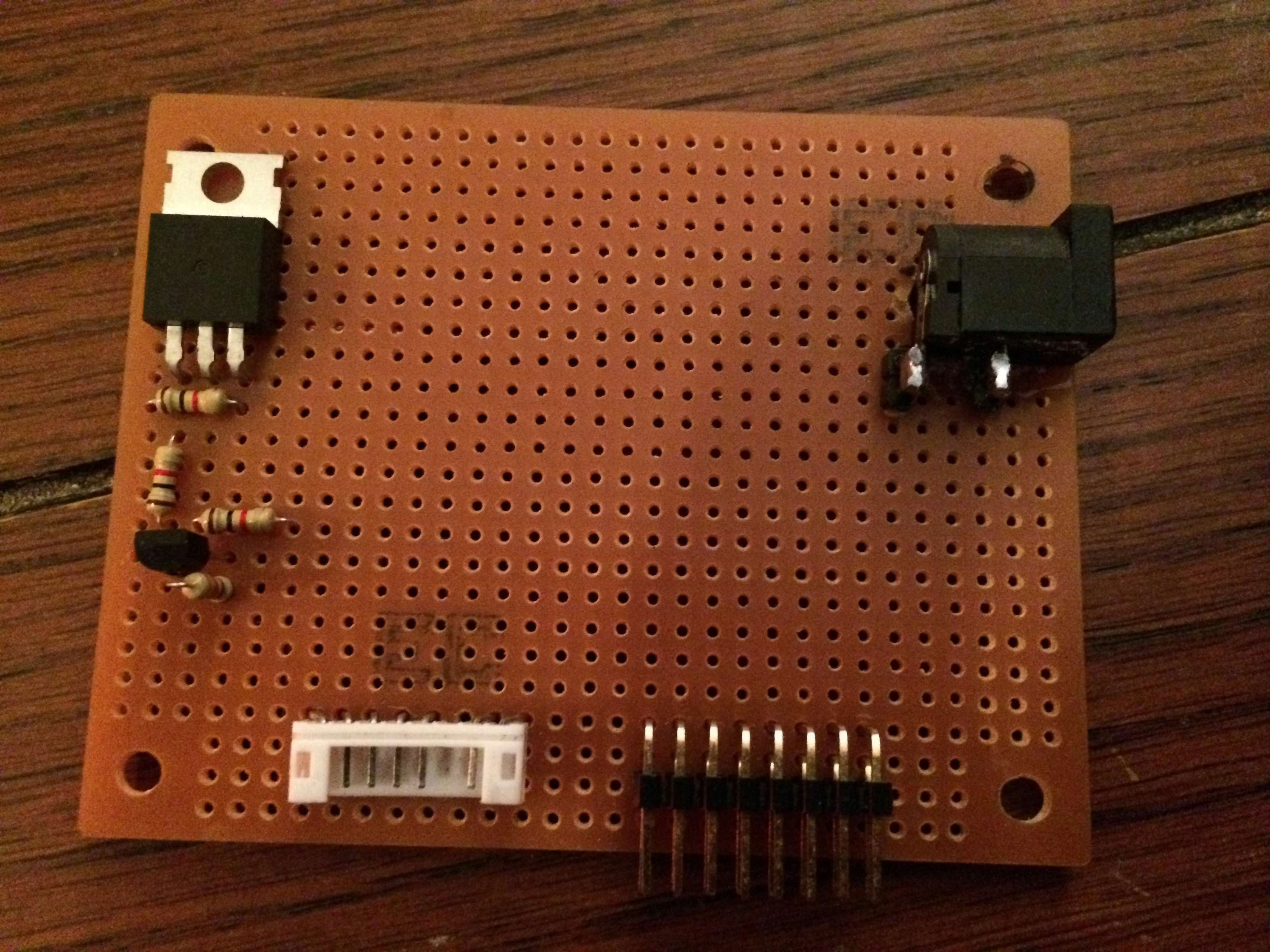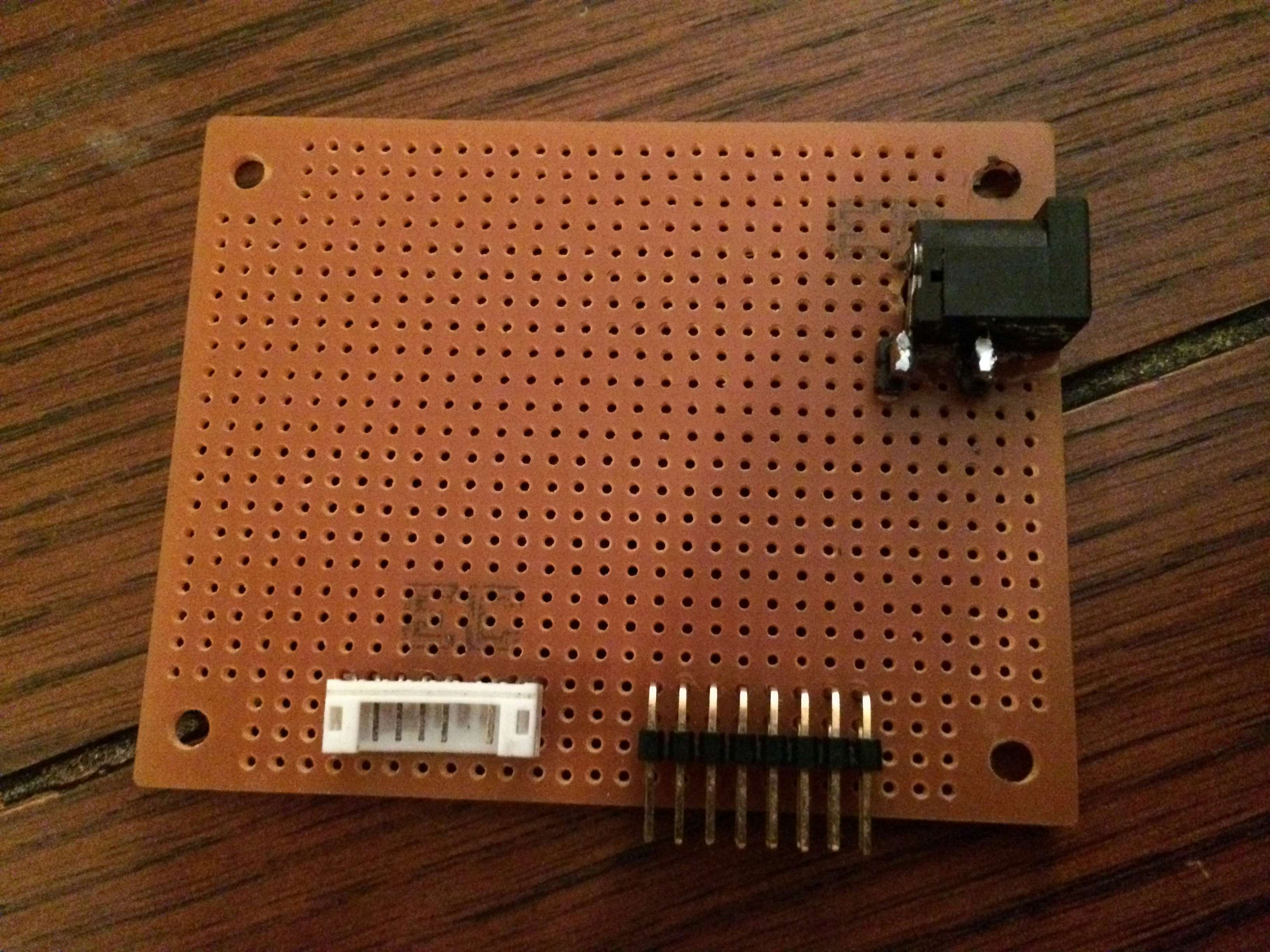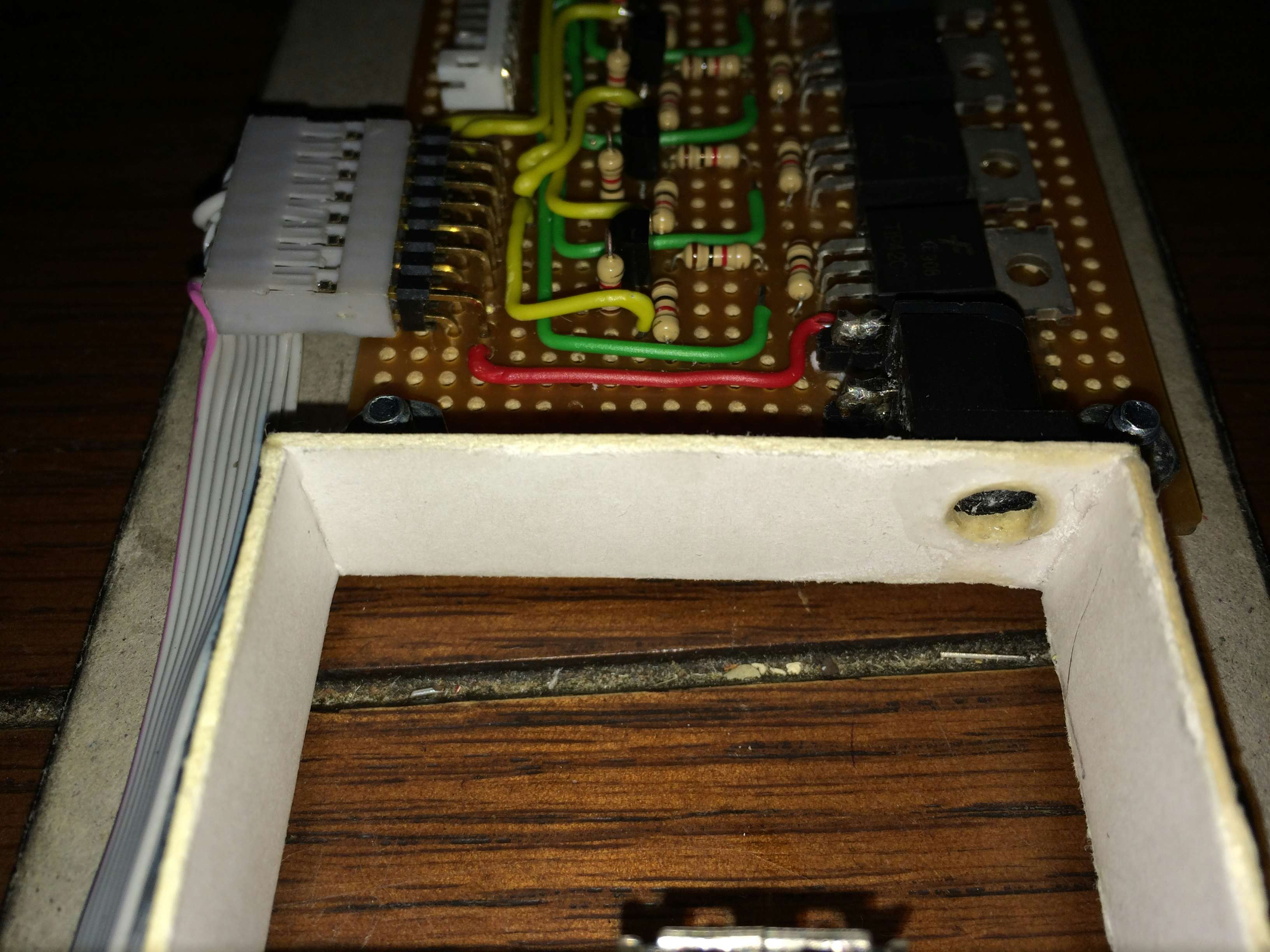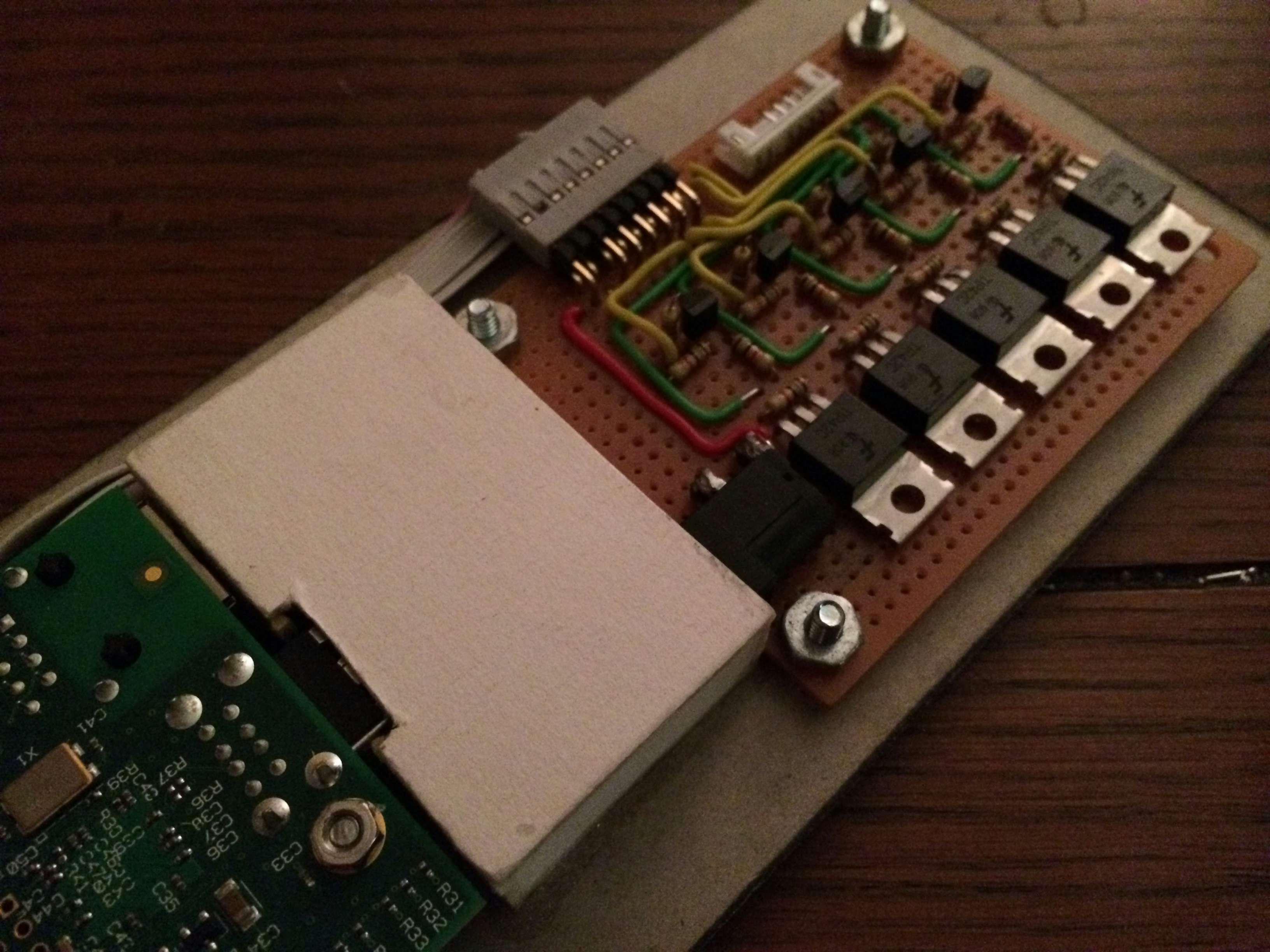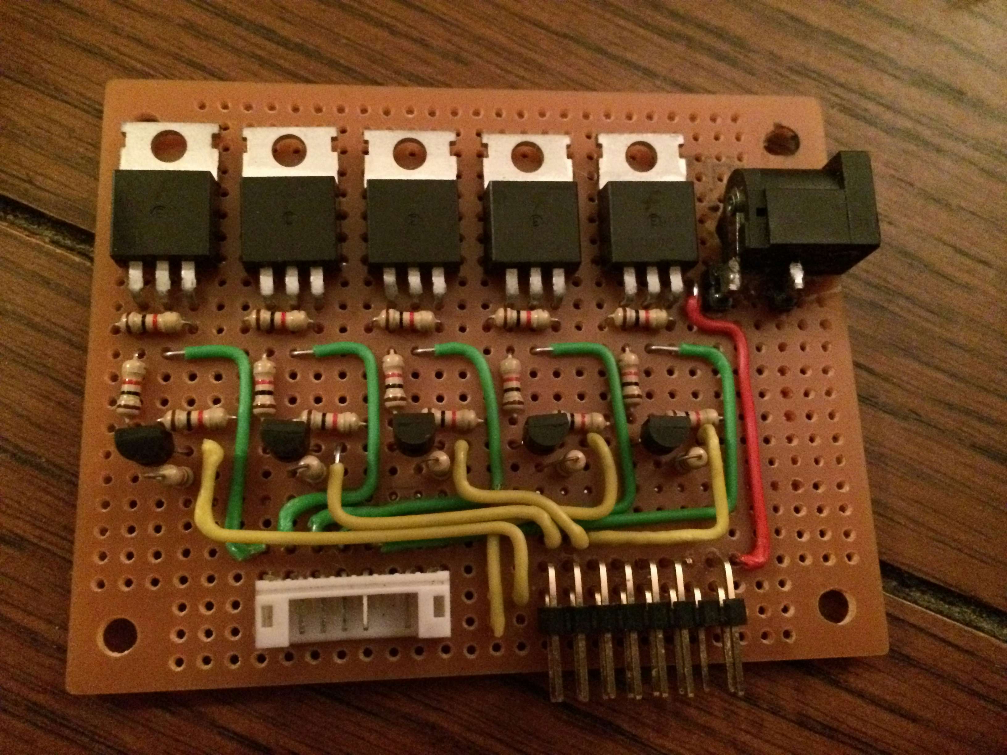 First on a piece of proto-board the necessary connectors are laid out and soldered. The barrel jack has been placed on its side and held in place with my super glue of choice to help align it properly for the I/O area on the rear plate. With the connectors ready I setup the first of five complementary transistor pair circuits that will amplify the logic level signals from the Pi’s GPIO pins.