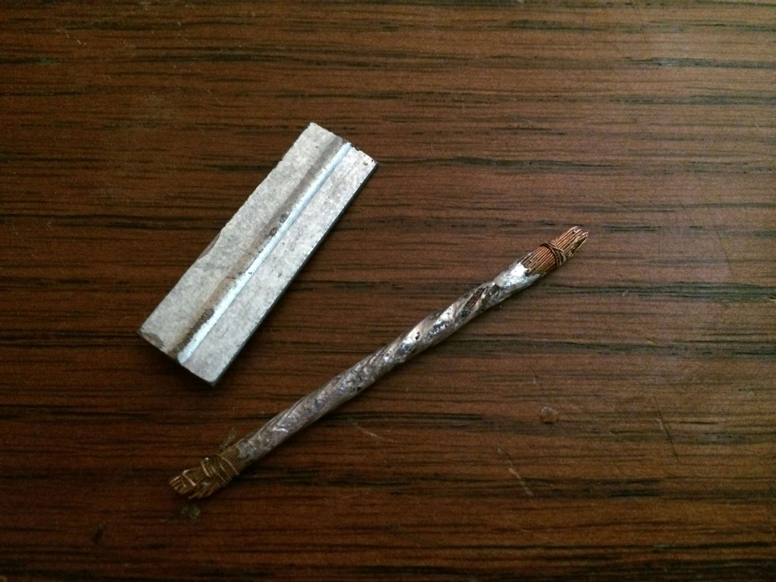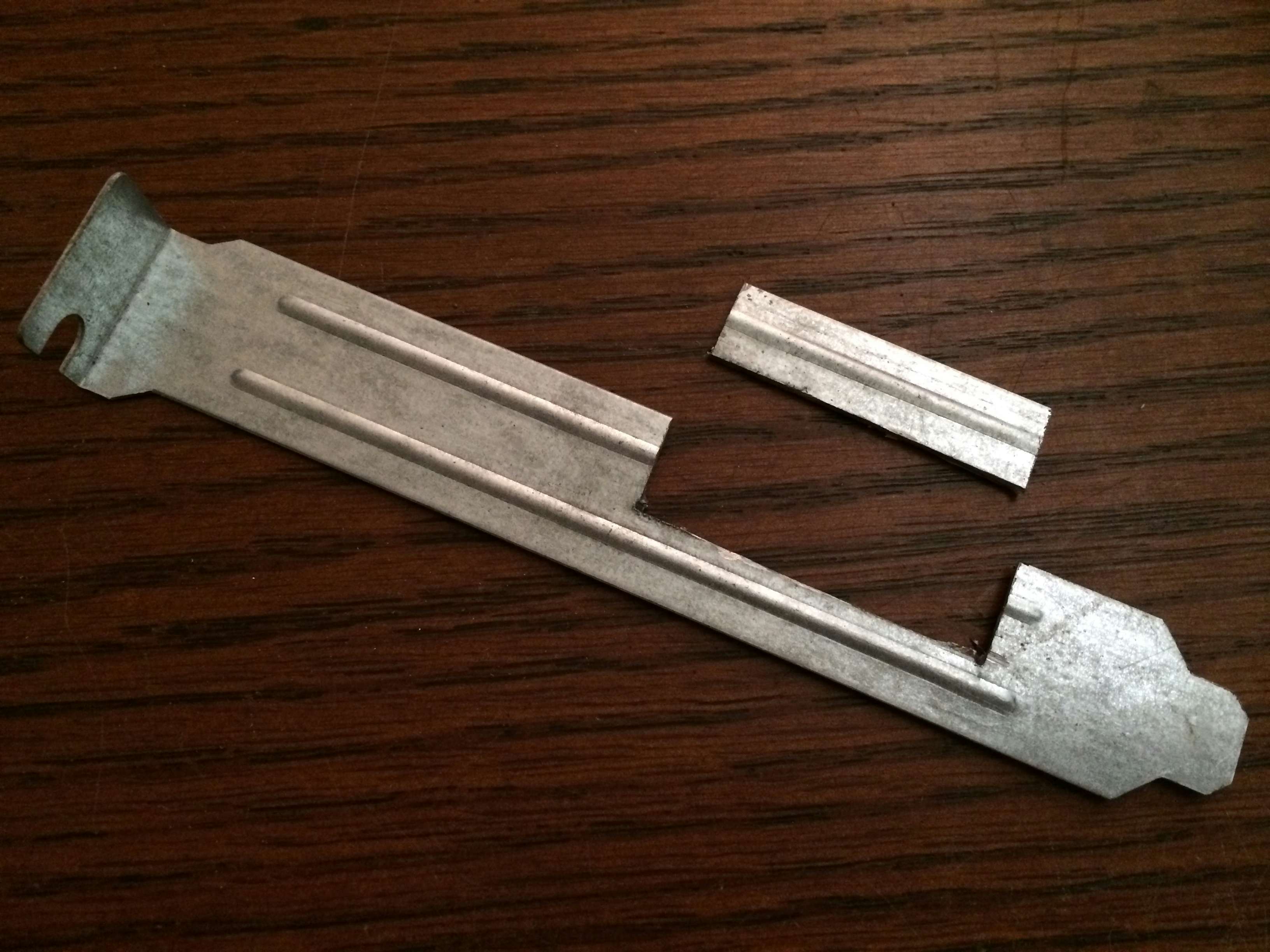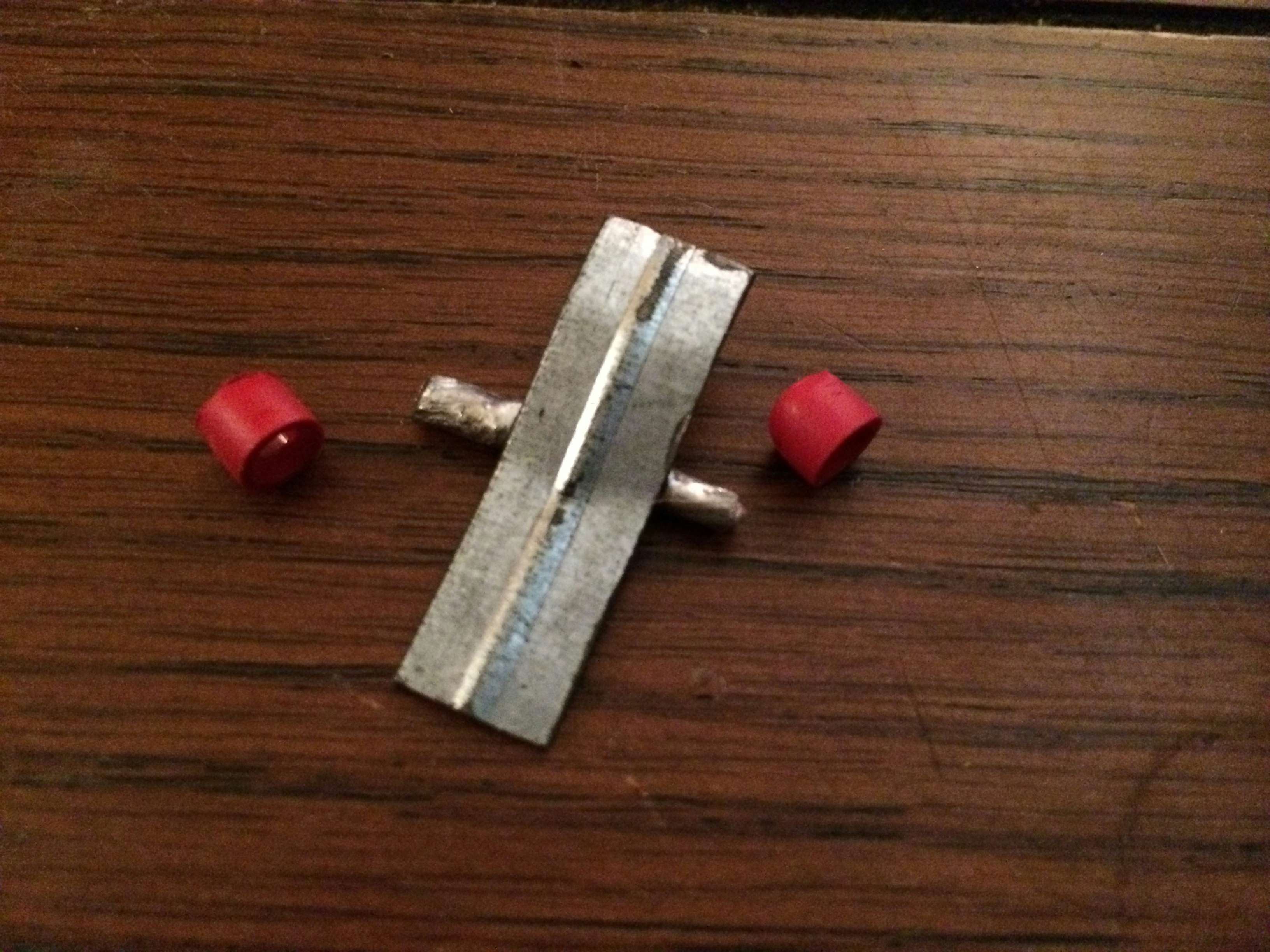 Using a bit of some old I/O riser card cover a small piece was cut out and with an added bonus of a structural bend in the middle that will help it retain rigidity over repeated usage. Next the lever needed a fulcrum on which to make its movement, in simple terms something was needed to act as a spacer. With some extra copper wire from an old power cord a small length was twisted and then soldered or tinned. This piece of wire will act as the fulcrum and can easily be trimmed later on.