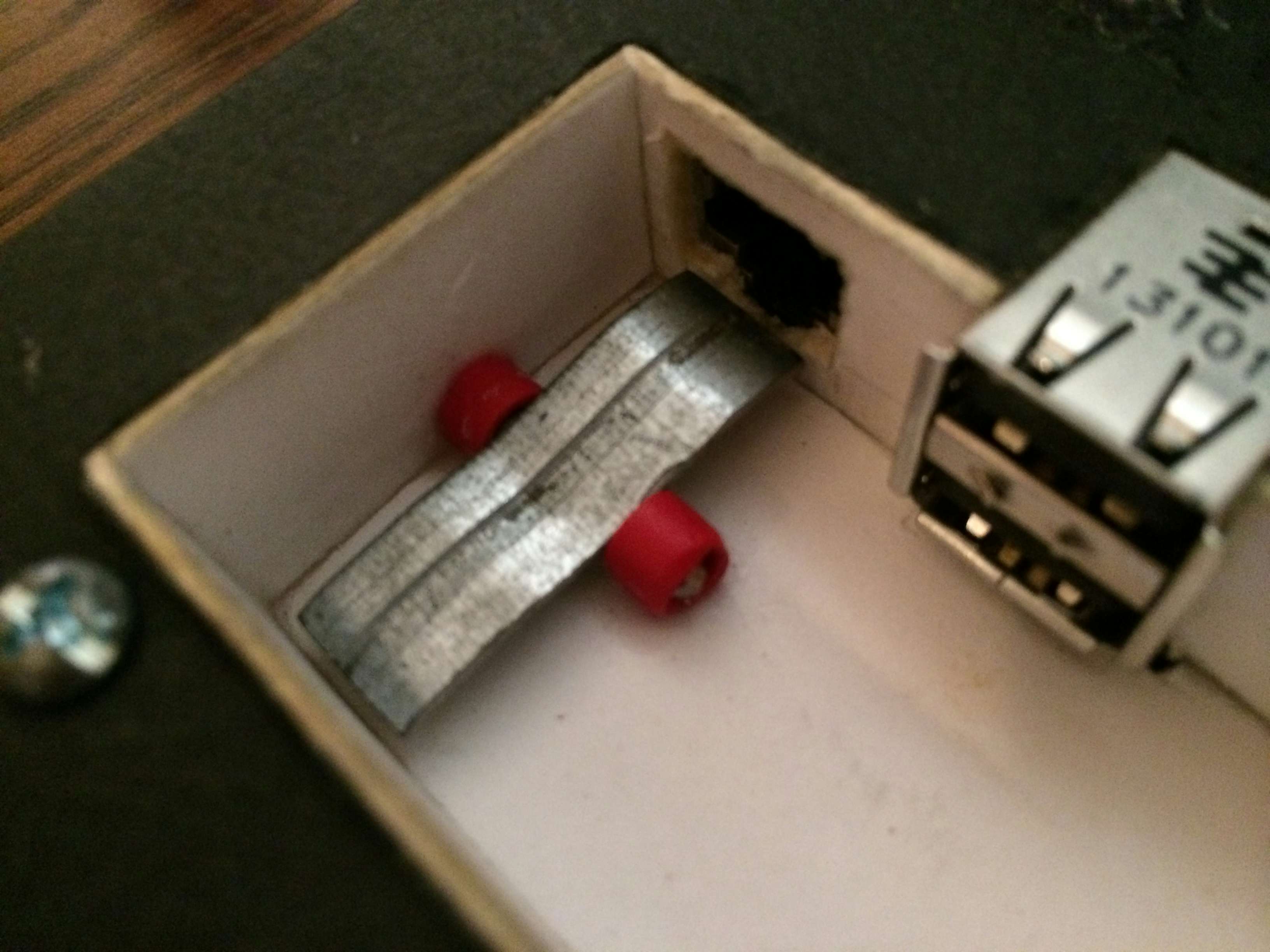 With the fulcrum attached to the lever again with more solder. As a general rule metals with steel in them can be soldered to generally with a bit of scuffing to ensure direct contact with the metal. The lever was given a few bends that will ensure pressure is placed on the correct area of the clip on the ethernet cable and provide the right amount of give in both directions. Lastly two small bits of a pen were cut as spacers and as supports and glued in place inside the I/O area with my super glue of choice.