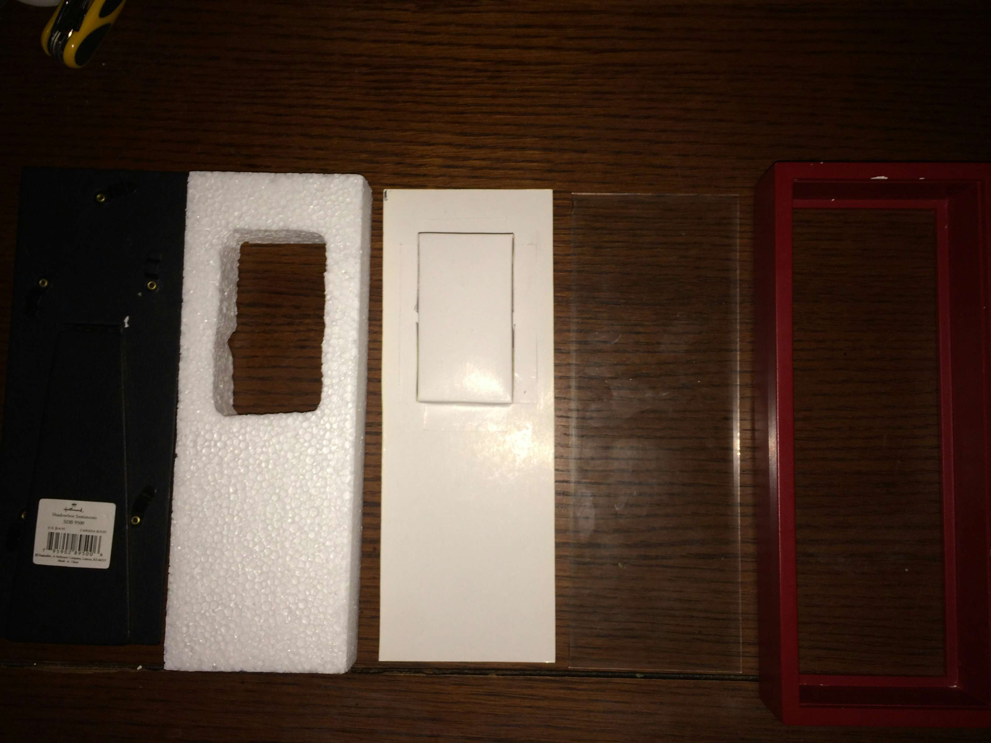With the back off the frame we can see that there is a large piece of styrofoam that occupies the remaining space in the frame and helps push the picture and glass towards the front while providing pressure to the rear plate. Finally with all of the parts out of the frame we can see the amount of space to work with will be quite confined but still possible to work within.