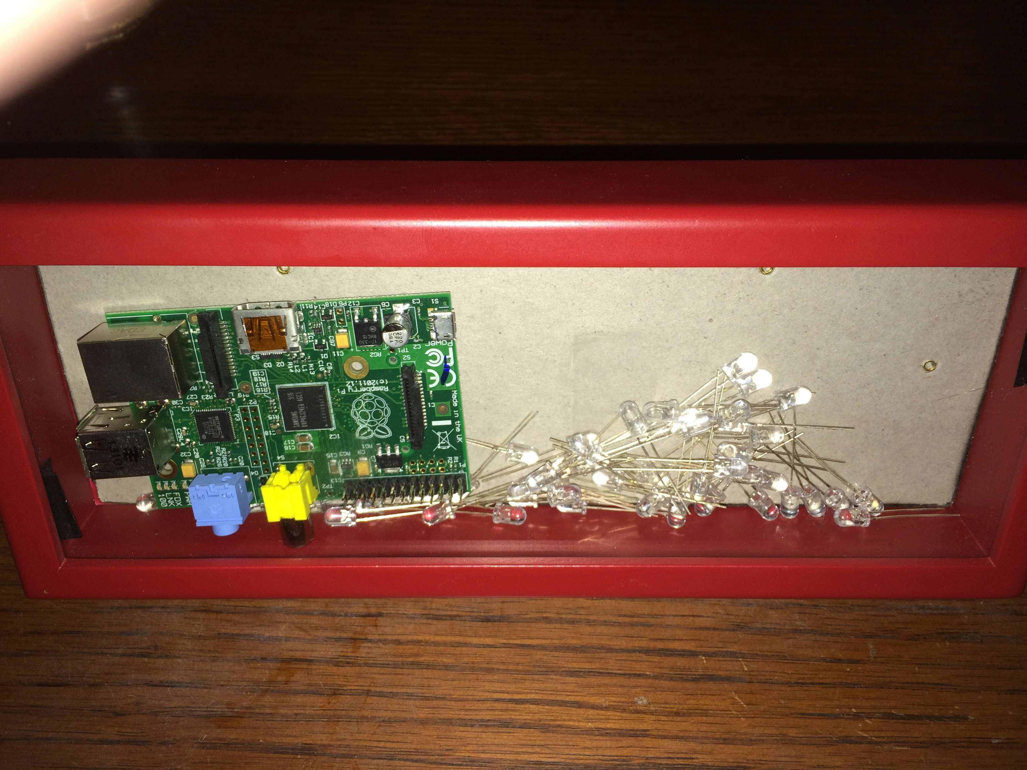 With all the parts outside the frame the RaspberryPi and an assortment of LEDs were placed inside the frame just to get a visual for how much room there will be on the inside once the back is sealed up.