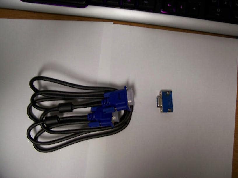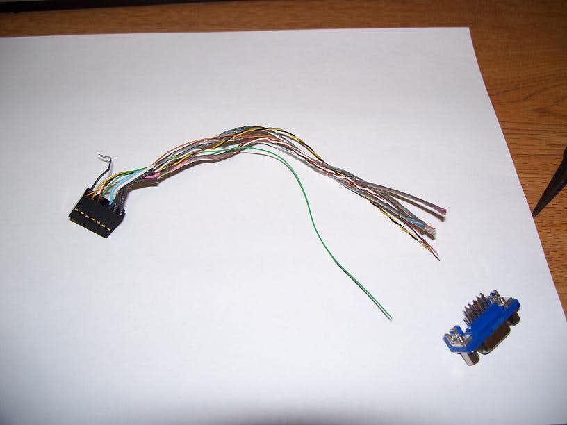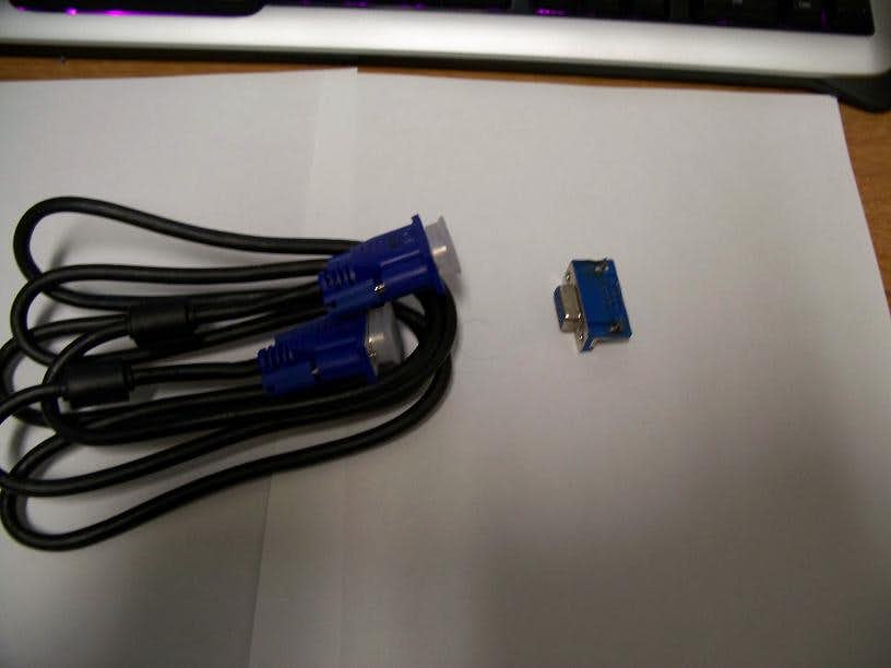 The new VGA cable and the donor VGA jack that I desoldered off an old graphics card.