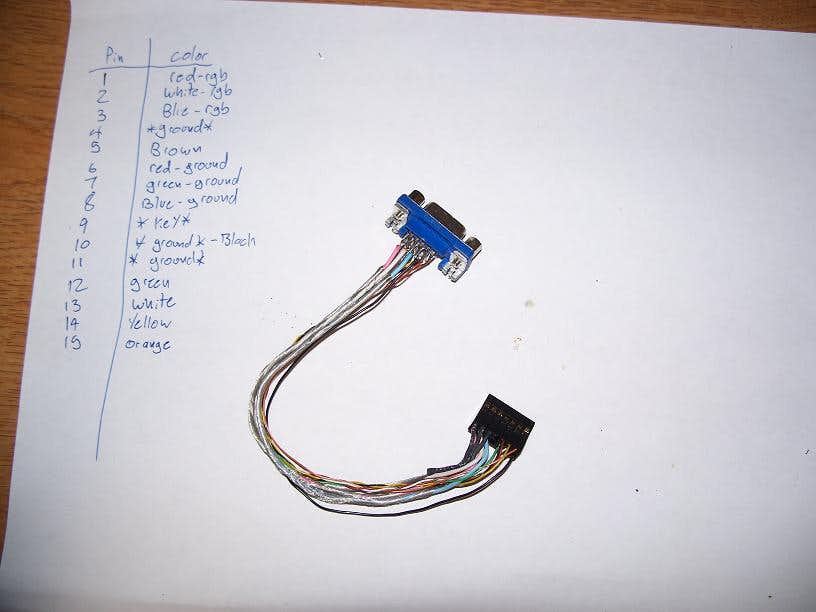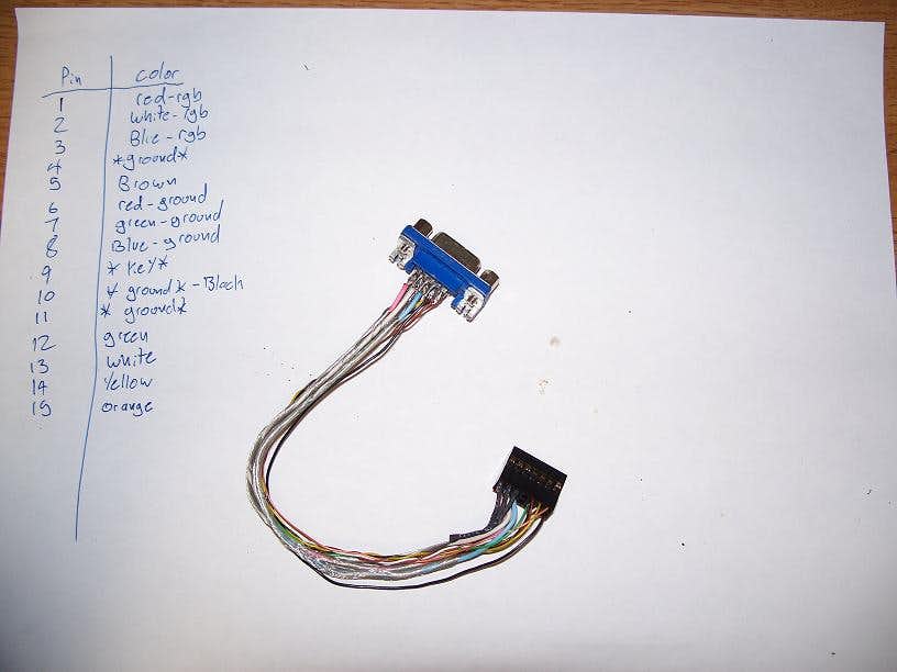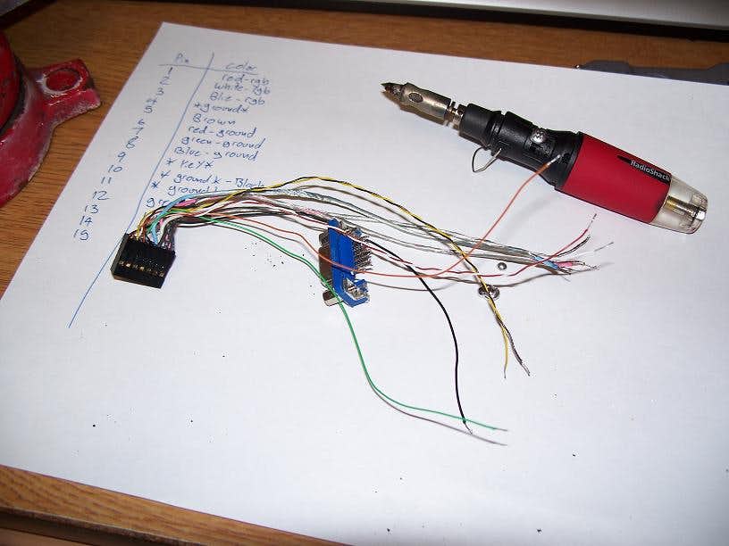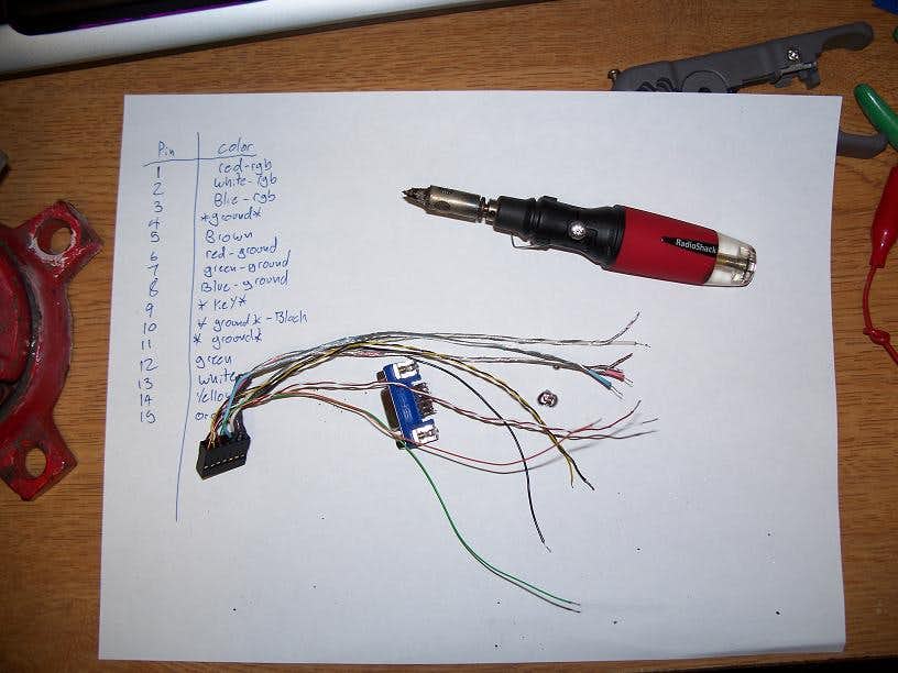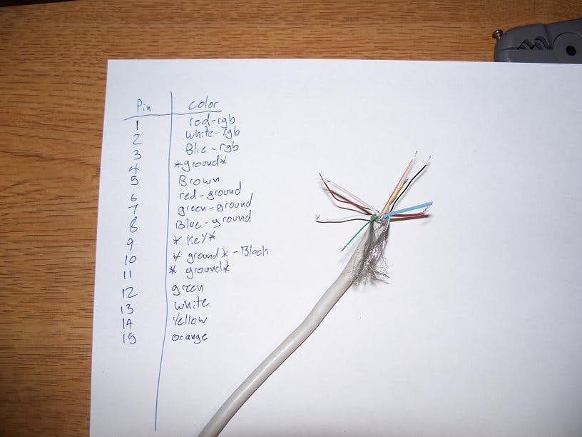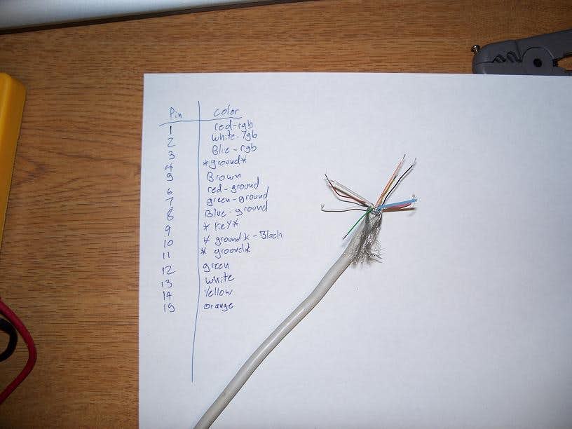 This was an important step of the process. What I did was connect a wire to pin 1 of the VGA plug on the end of my old cable, and used the circuit test or resistance test function of my voltmeter to see if it completed a circuit. I then wrote down which wire corresponded to that pin, and repeated for each pin on the cable. Since many manufacturers do not use standard colors it is important to know which wires do what.