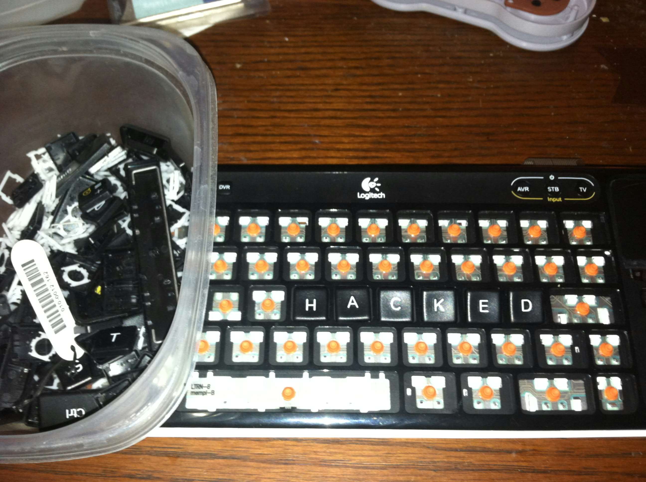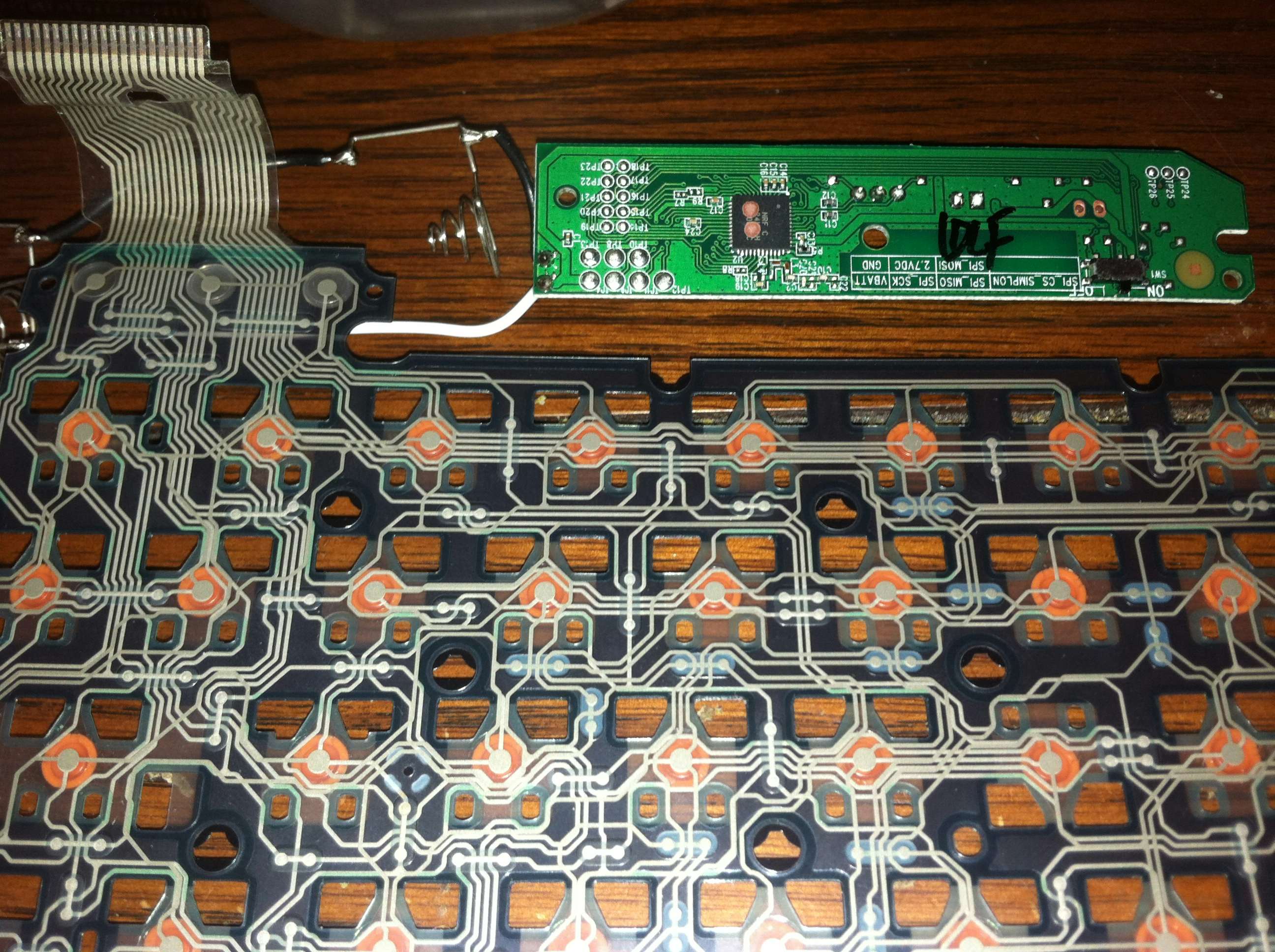 The keyboard was fairly difficult to disassemble and required that every key be removed before I could gain access to the membrane. With the membrane one could easily determine which keys on the keyboard map to which pins on the control board. A typical keyboard can not read all the keys at once either due to multiplexing, charlieplexing, etc.. By choosing keys which map to distinct pins on the control board the theory is that all or most of the buttons on the controller can be pressed at once without cross-talk.