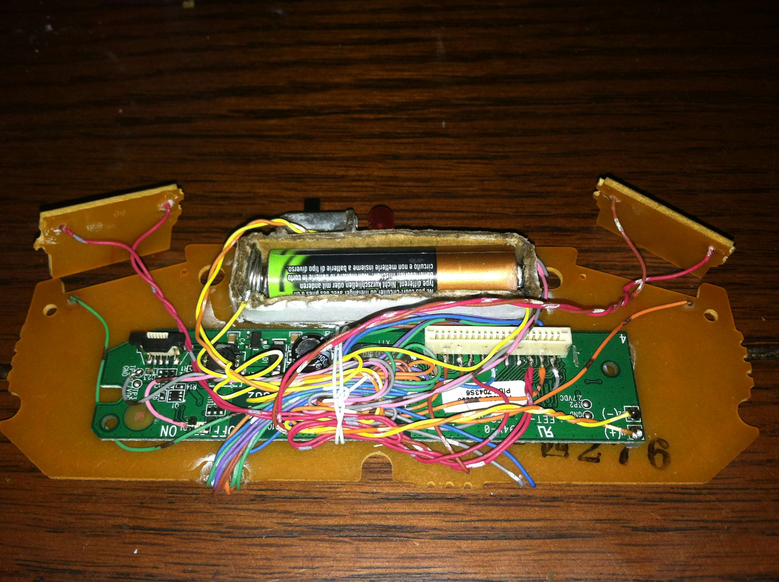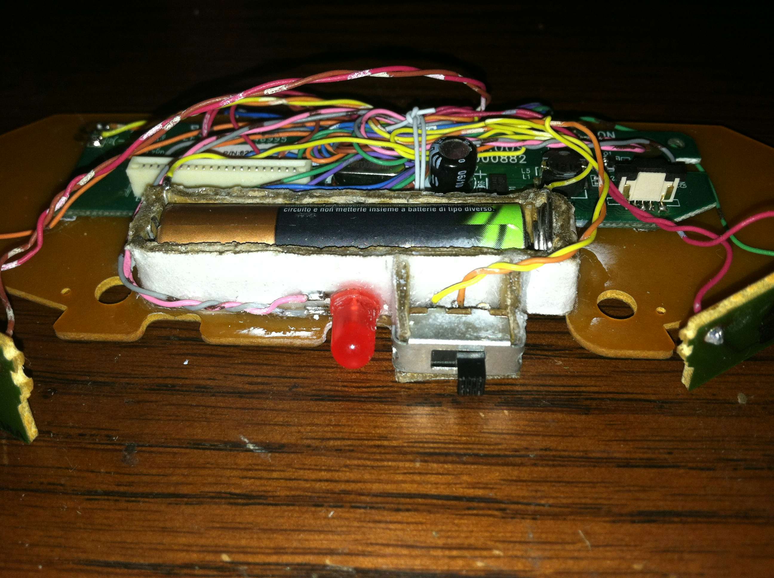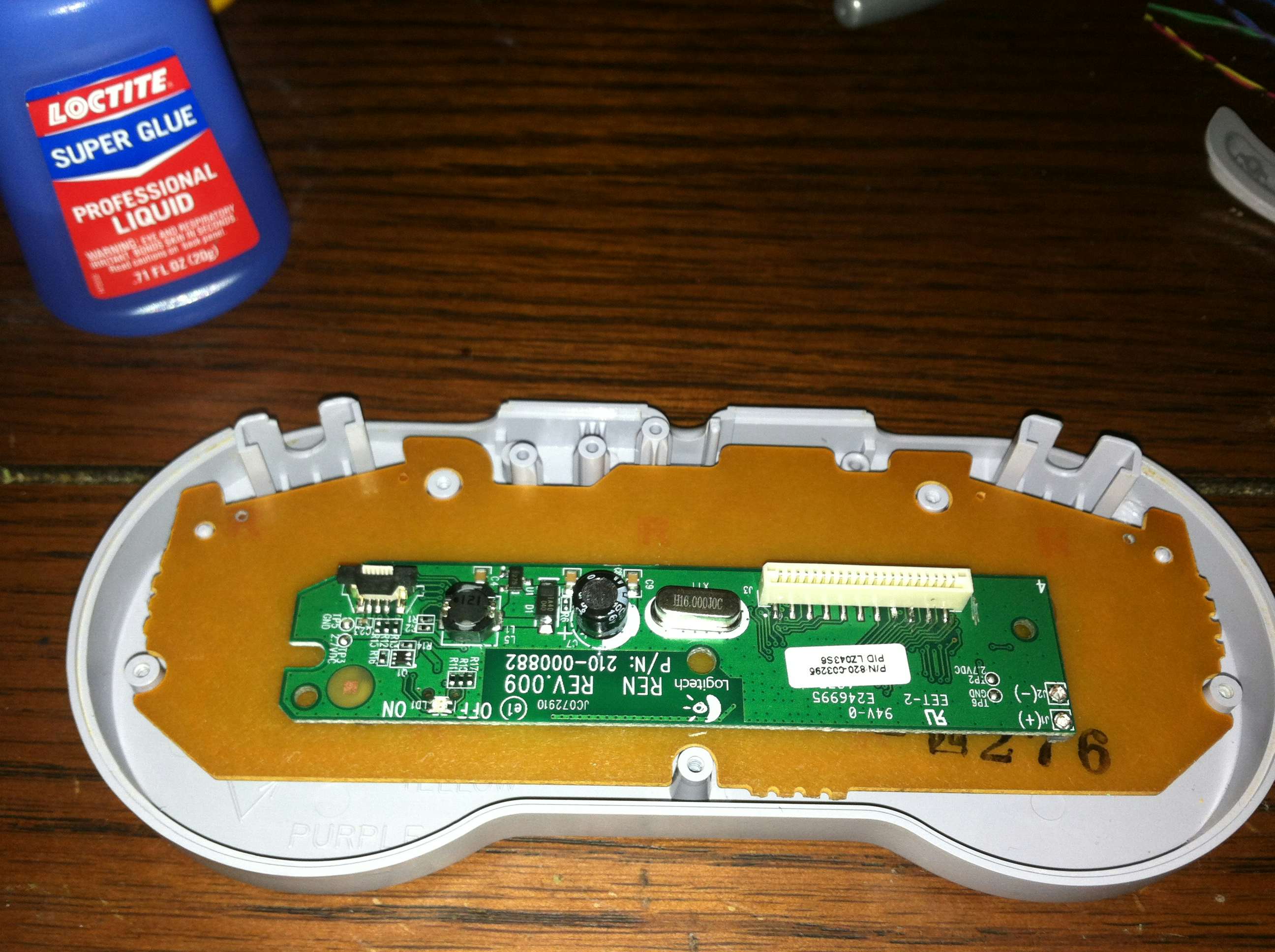 Ensuring that the battery lasts as long as possible between charges a power switch is was added and marks the only external modification to the controller case. Additionally a power LED was glued in place to occupy the hole previously used by the controller’s cord. Everything is attached to the main board assembly with the plastics being completely independent of all electronics.
