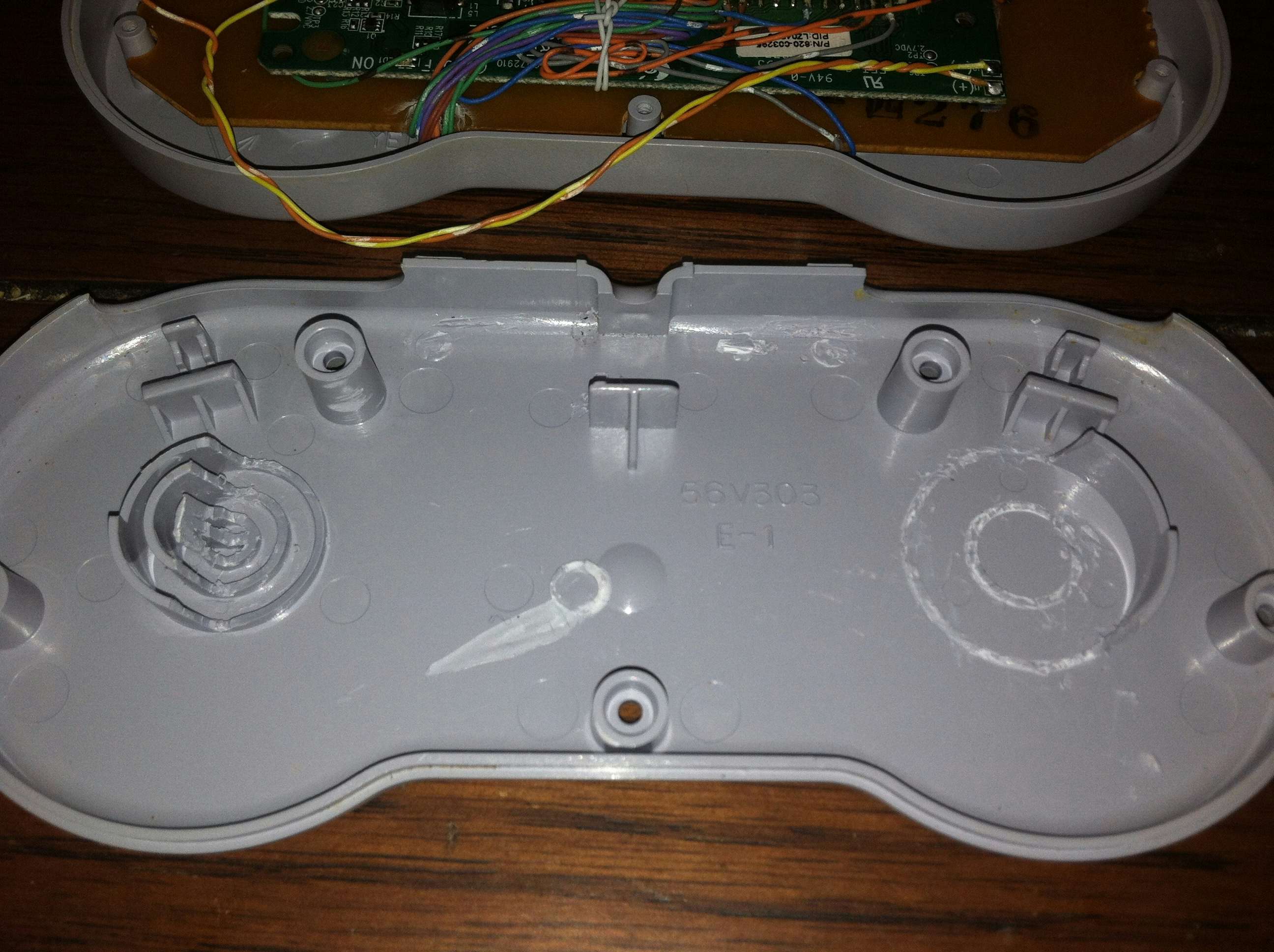 First some of the plastic is removed from the back plate of the SNES controller to leave room for both the control board and space for the battery to fit. There are no cut-outs on the back of the controller to preserve the original feel of the controller. This does present a problem with changing the battery but I would much rather remove 5 screws to take off the back plate versus an ugly cut-out that ruins the feel of the mod.