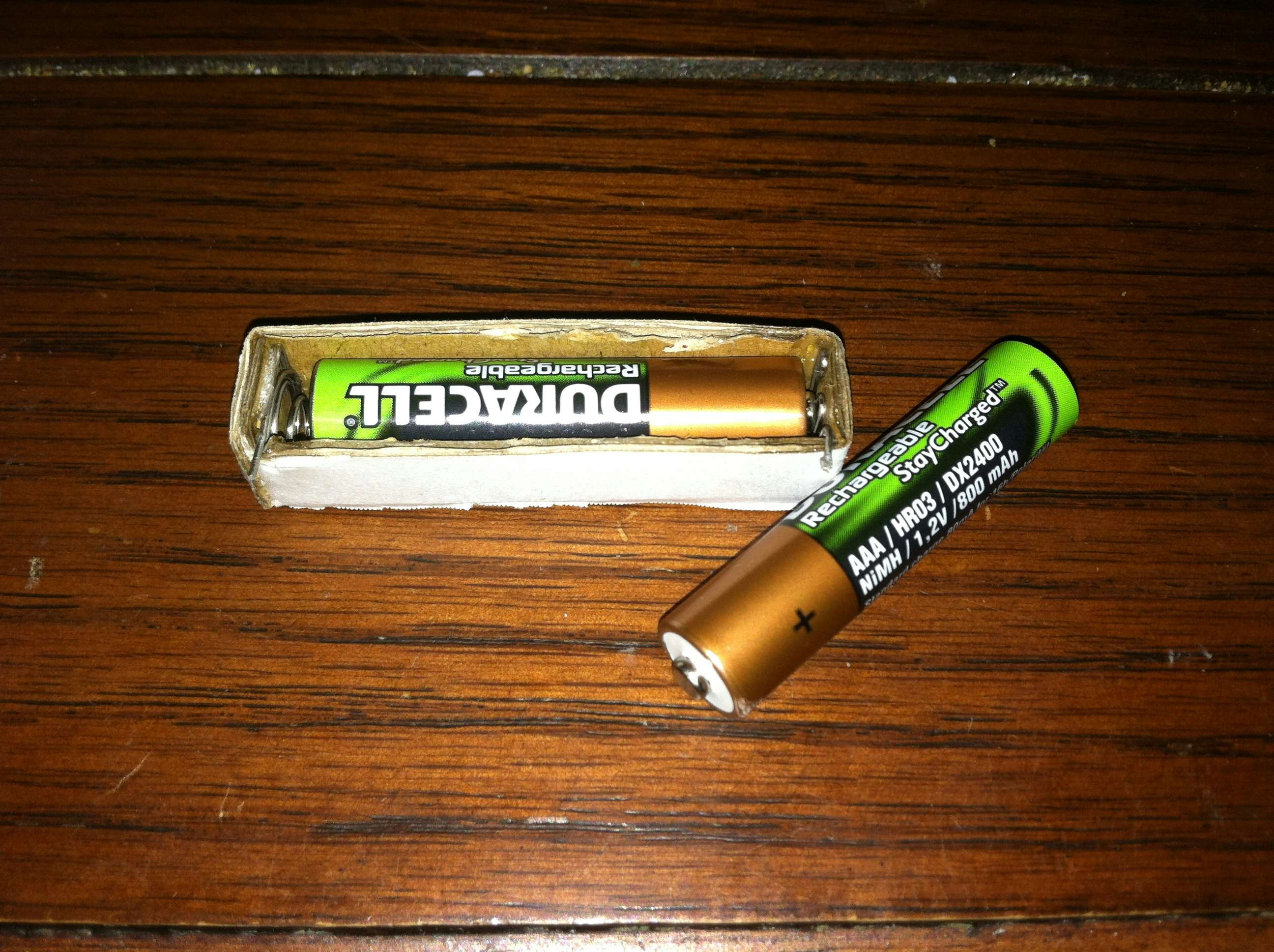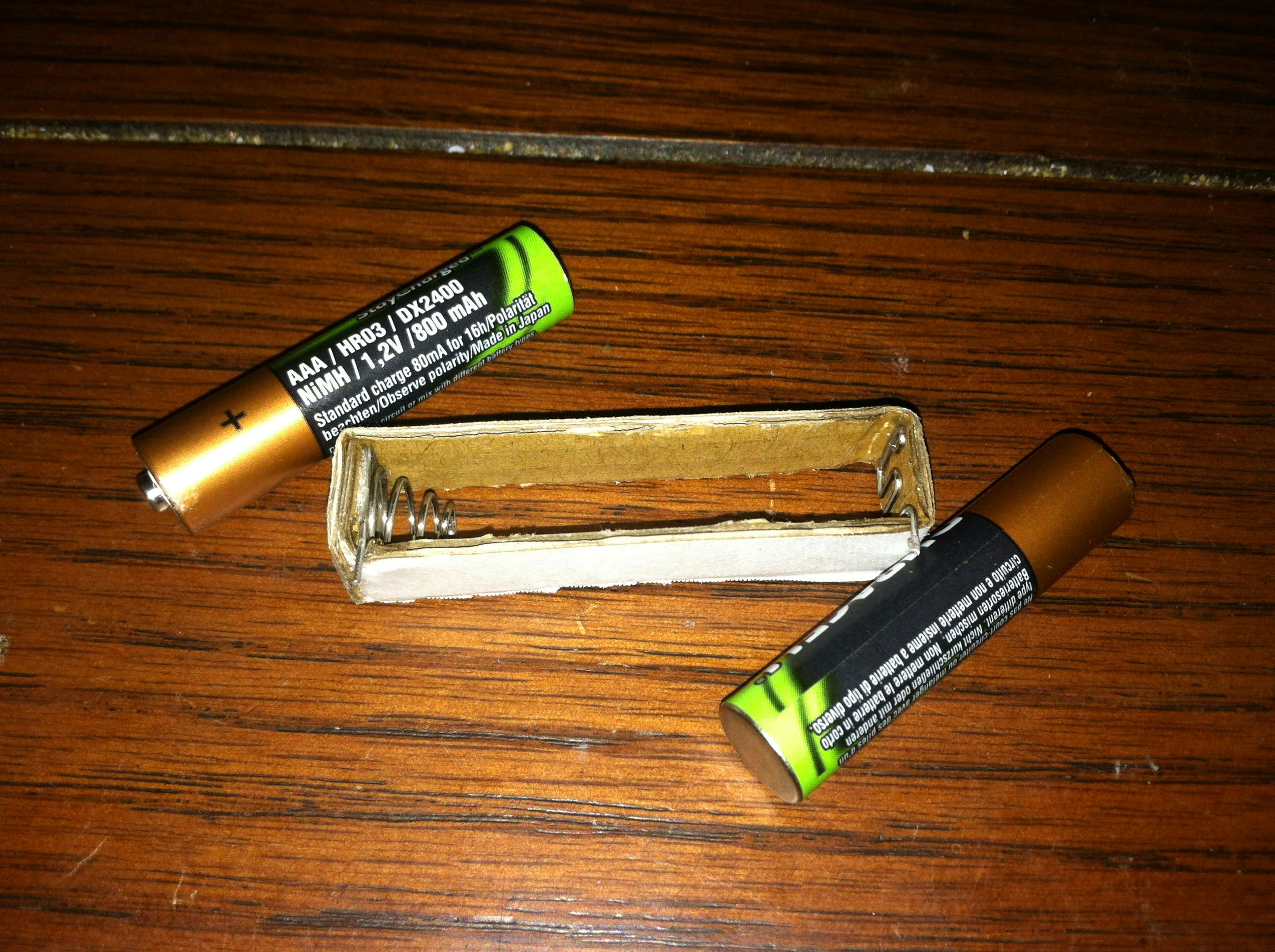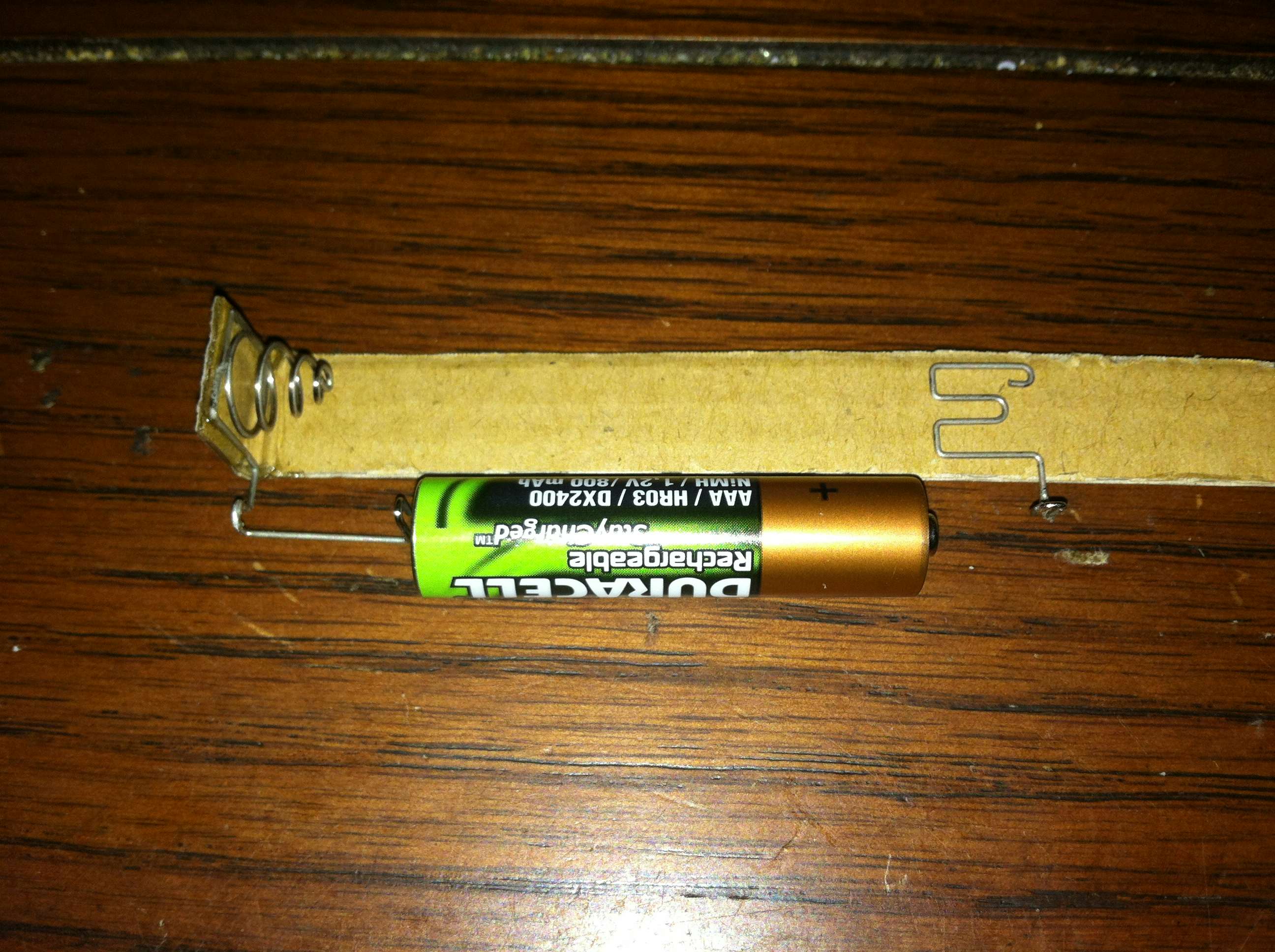 Choosing a battery like a AA or AAA requires some sort of holder with a spring that will hold the battery in place and make the appropriate electrical connection. Without a ready built holder and with a bit of imagination a usable holder can be constructed out of cardboard and Loctite professional superglue, I dare anyone to find a better superglue. First a small strip is cut that is about the same width as the diameter of the AAA battery. Spring contacts were taken from the original keyboard body since the footprint of the metal was closer to the size of a AAA than the AA batteries the keyboard used.