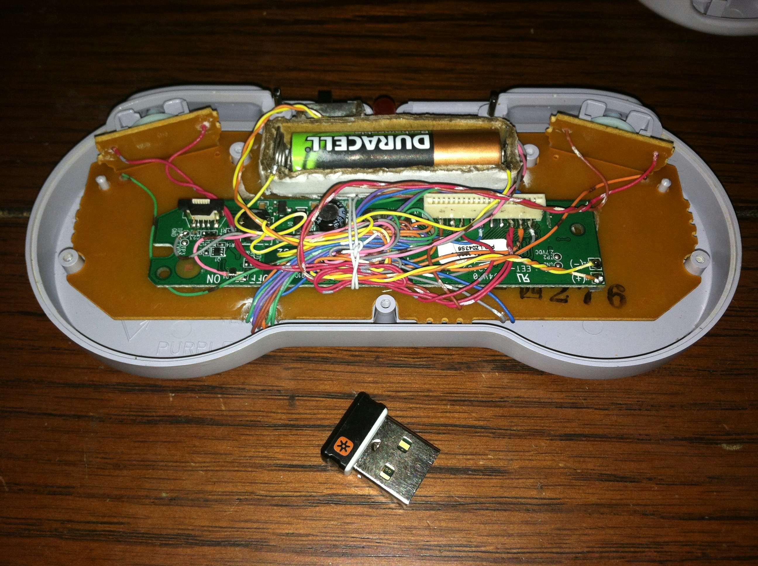 Starting with an unused Logitech keyboard I received with the Logitech Revue that never really took off I was able to integrate the control board inside of the SNES controller for that classic stock gaming feel.