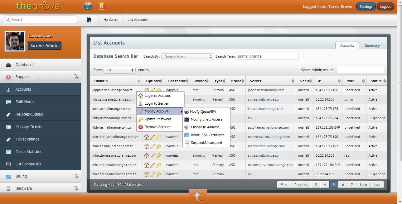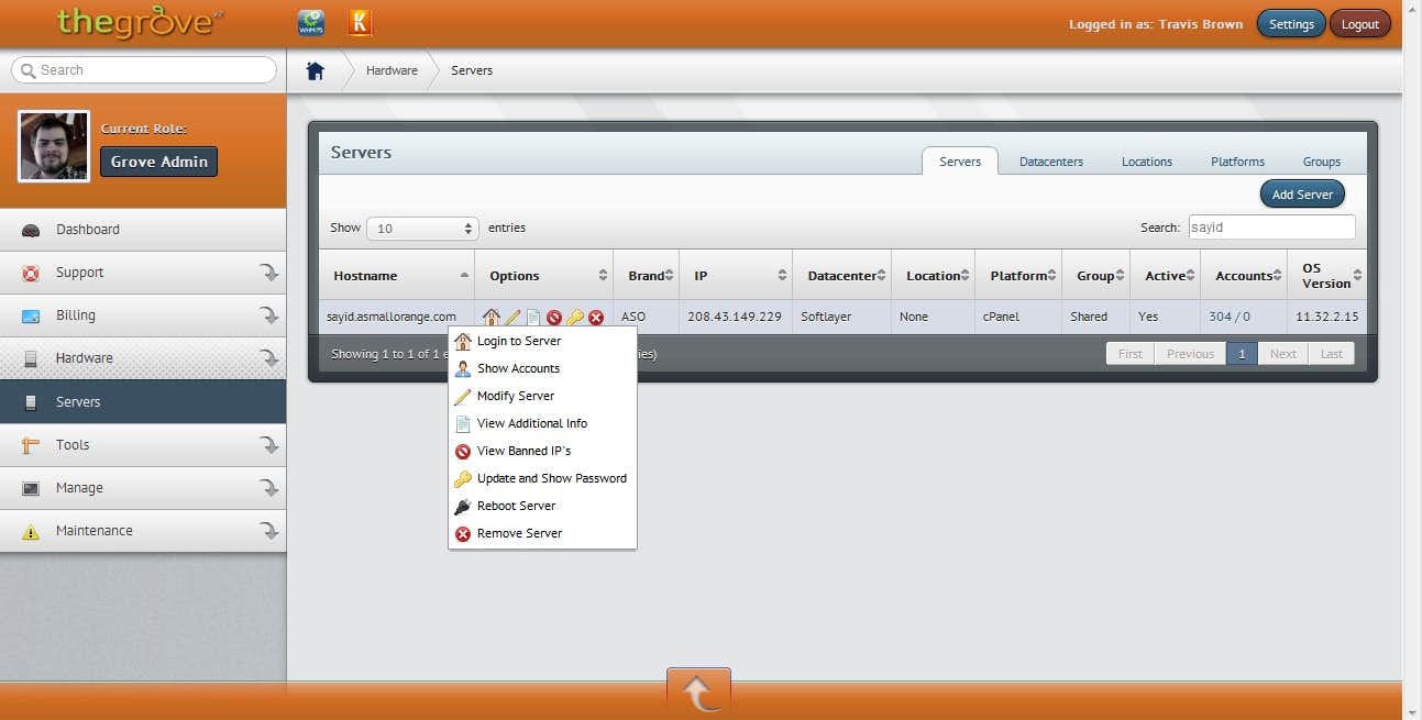 The Grove is a centralized aggregation platform custom designed for A Small Orange. The platform gathers all Accounts, Servers, Help Desks, and Billing platforms into one centralized location. Staff are able to quickly identify for which brand an account belongs and perform all actions as if you were logged into WHM.