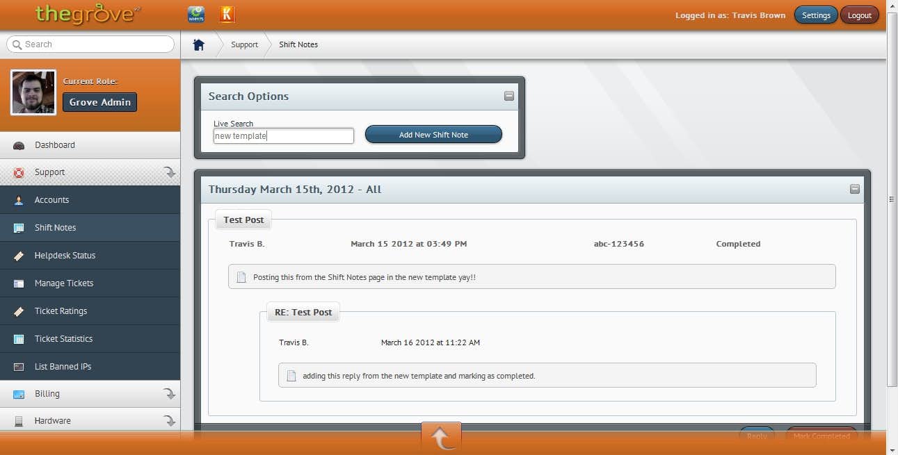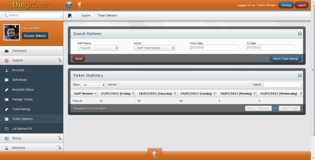 The Grove can access and manage Kayako Support Suite databases allowing ticket statistics and metrics to be generated for multiple brands at once. An integrated Shift Notes system allows staff to leave end-of-shift notes to staff that will be working the desks later on.