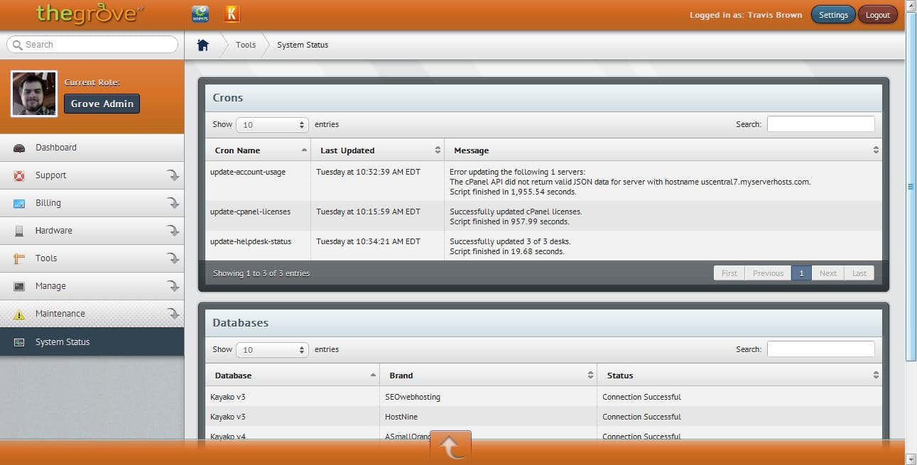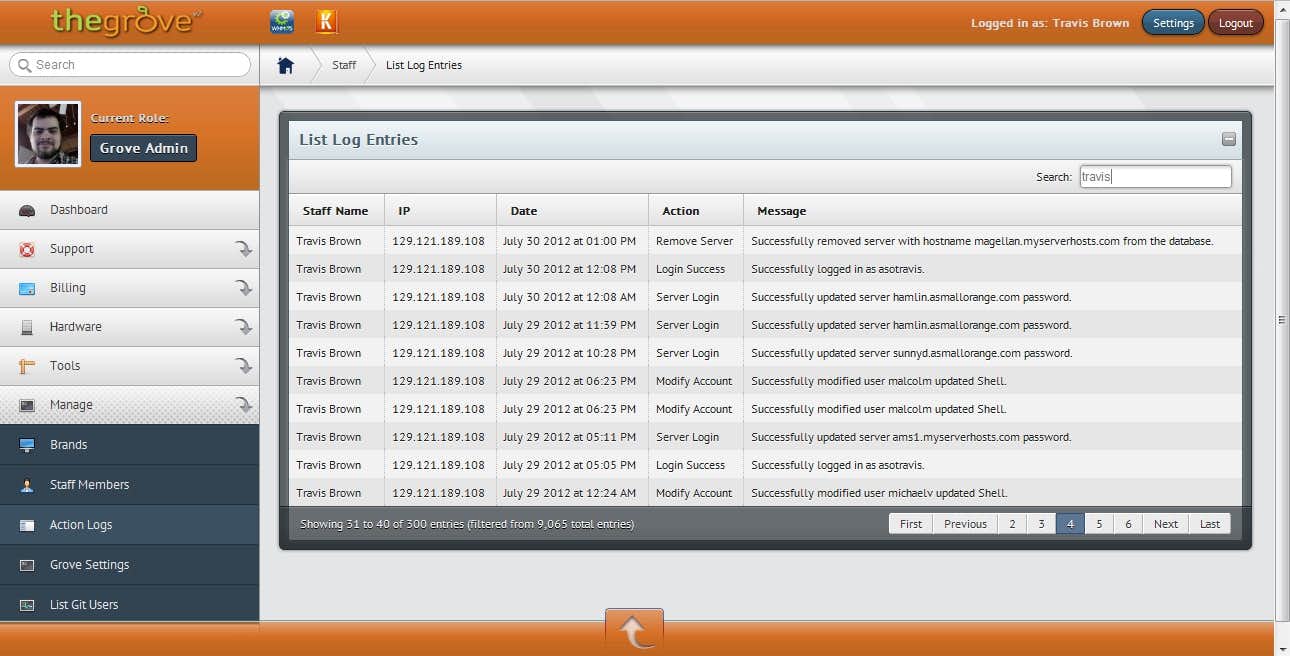 Staff and administrator actions are logged in a central location with all relevant information stored in the database. The Grove also allows administrators to view current status information about the processes running in the background and critical services.