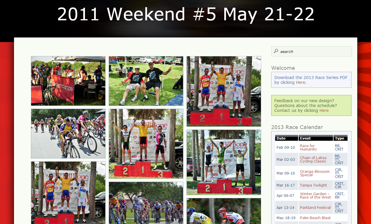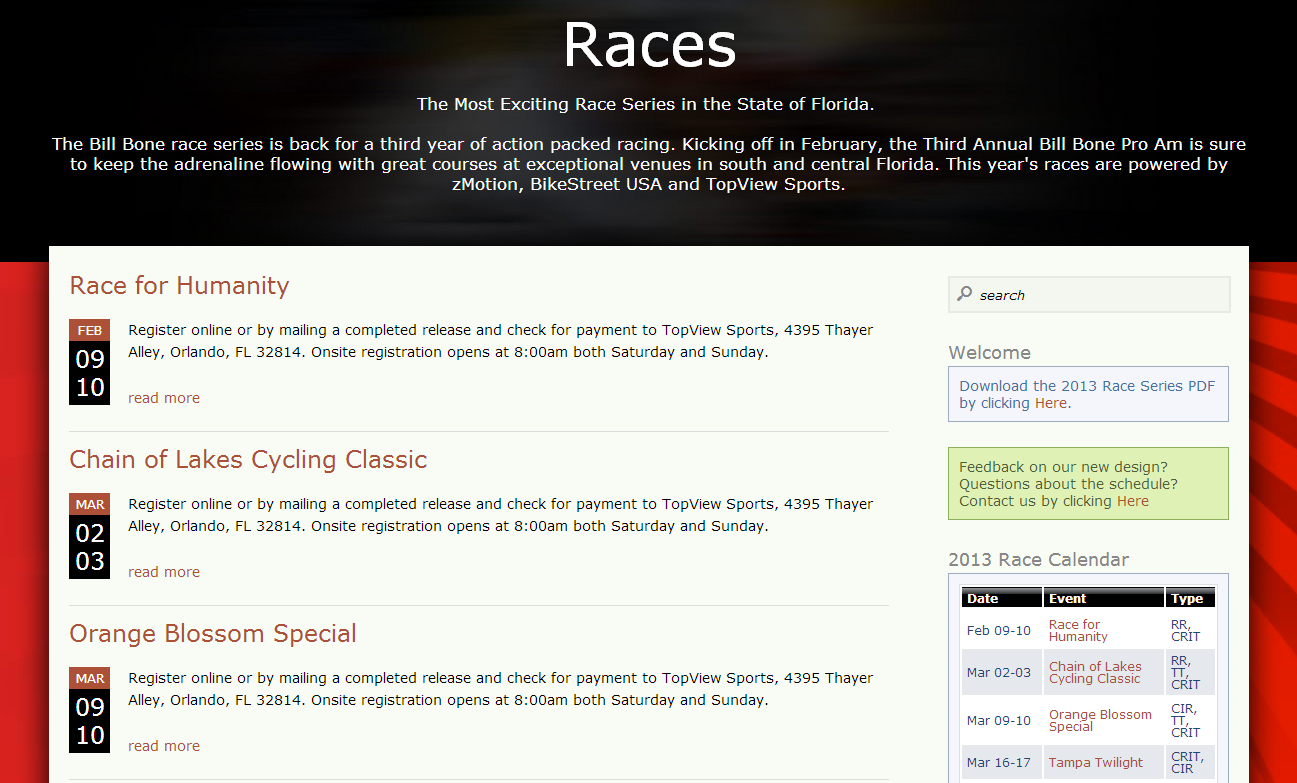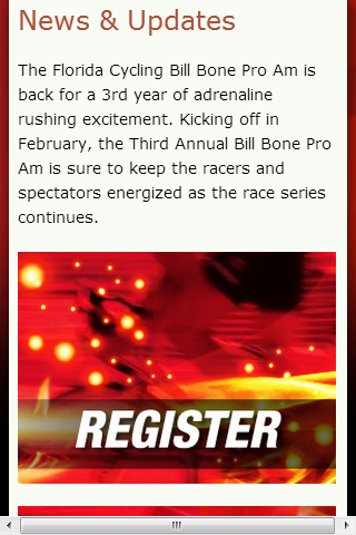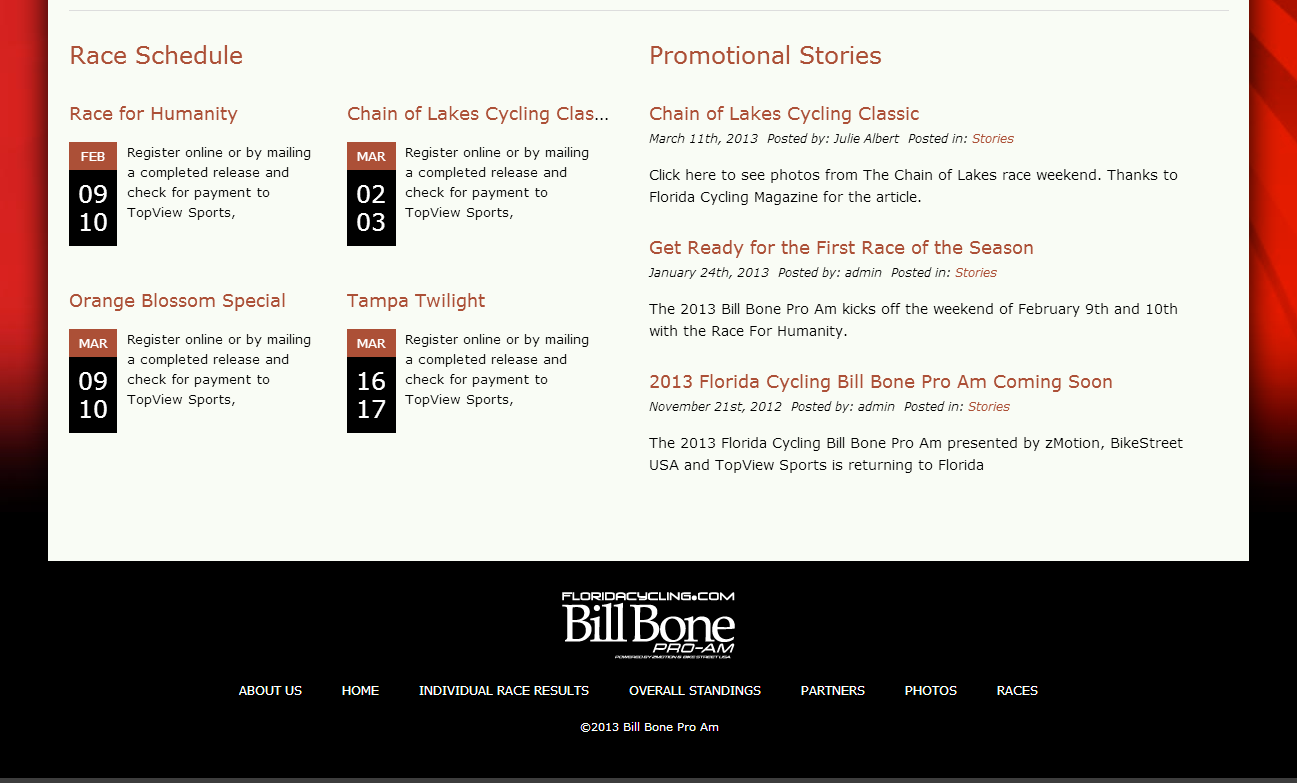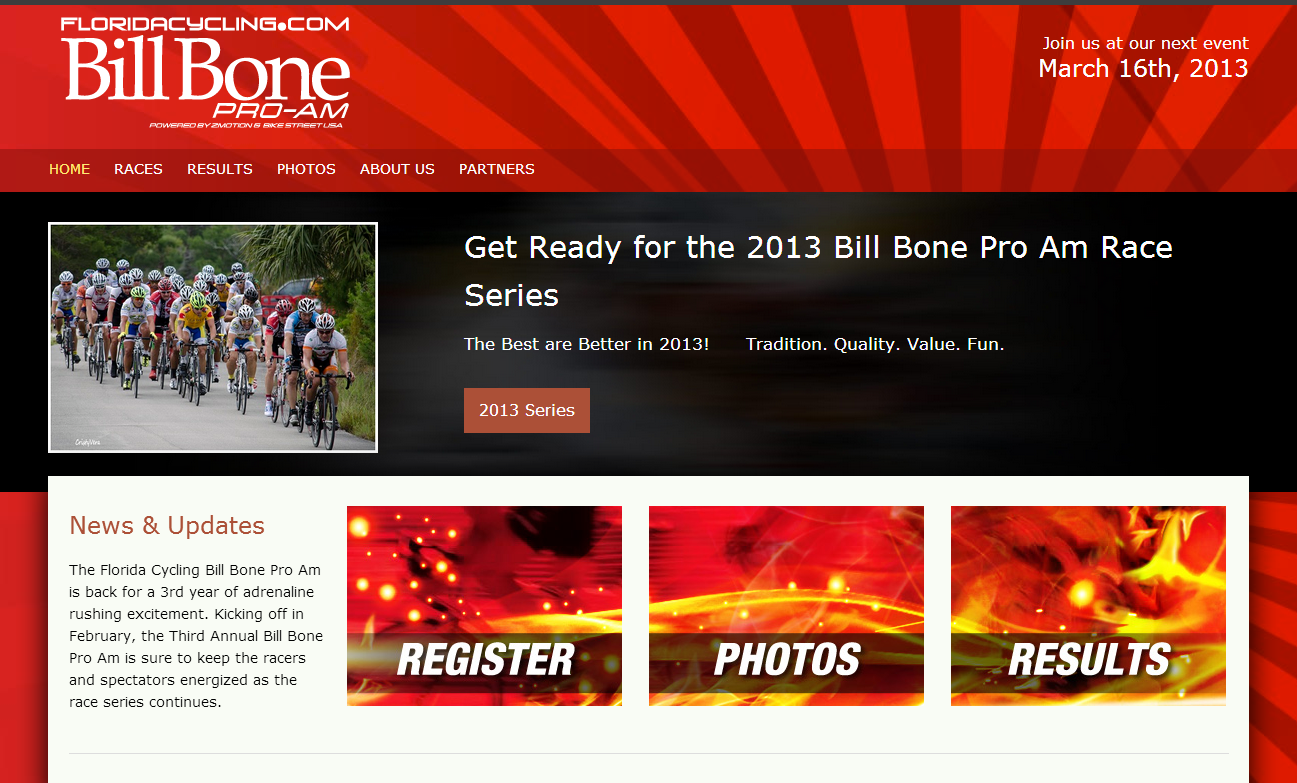 Bill Bone Pro Am is a fully customizable website integrated into WordPress. This gives the site administrator the ability to add/manage race events, pages, photo galleries, and customize the widget areas. Each page offers several content blocks that either auto populate with posts or allow static text to be placed.