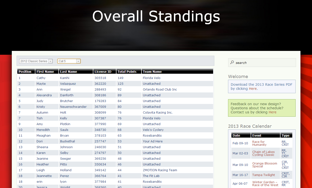 More custom page and post types were created to display photo galleries powered by jQuery Masonry, adding images is as simple as adding them to a post’s main content block. Overall standings are generated via data imported into a custom section of the site’s database with options to drill down on specific events and categories.