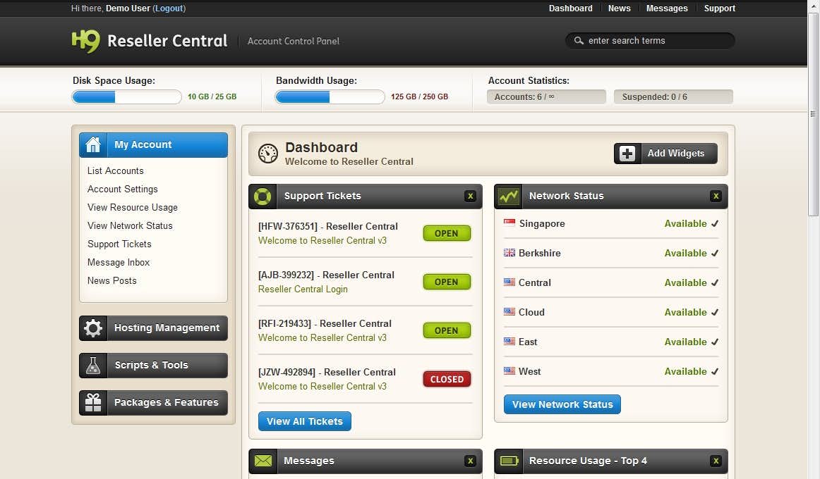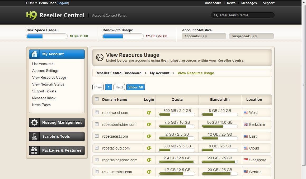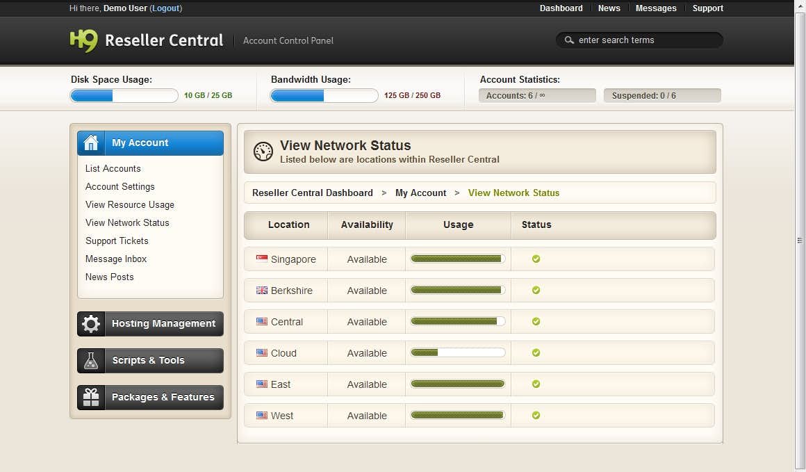 The Resource Usage page shows the overall disk space and bandwidth usage for various accounts in your Reseller Central. The Network Status page gives an overview of the availability of locations that exist within Reseller Central.