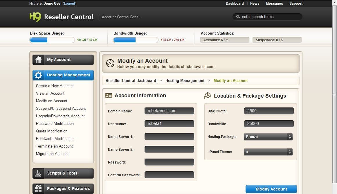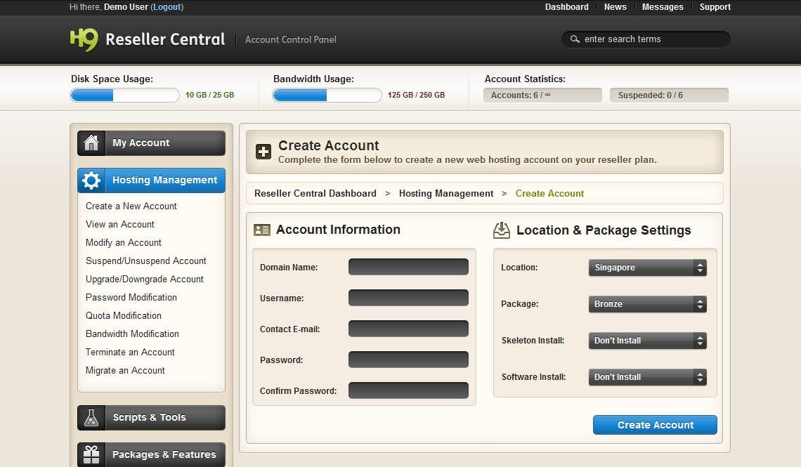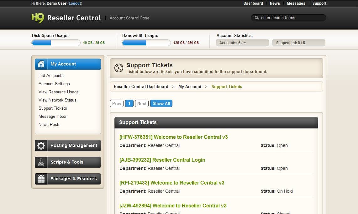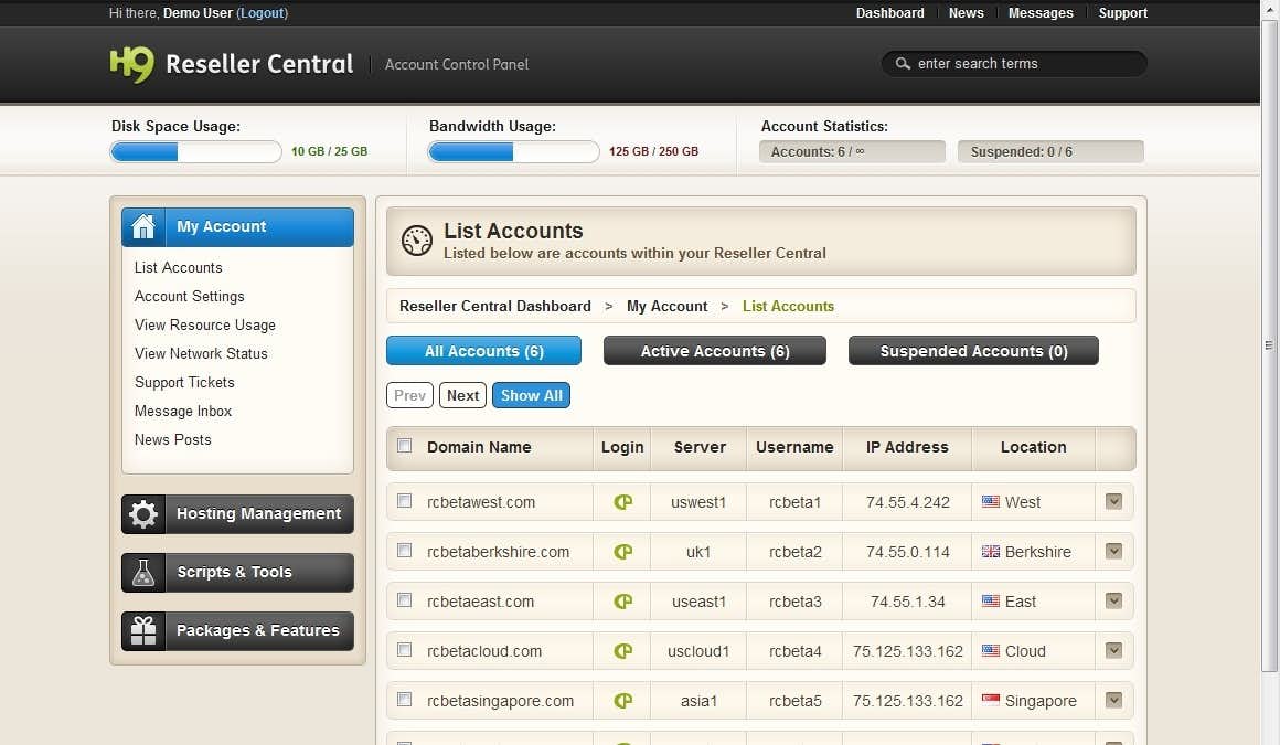 Clients logging into Reseller Central are presented with a clean interface where all accounts and settings can be managed.