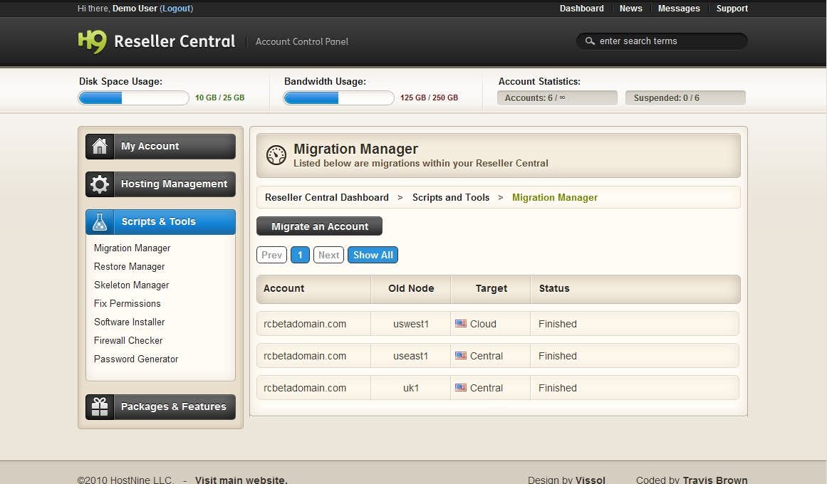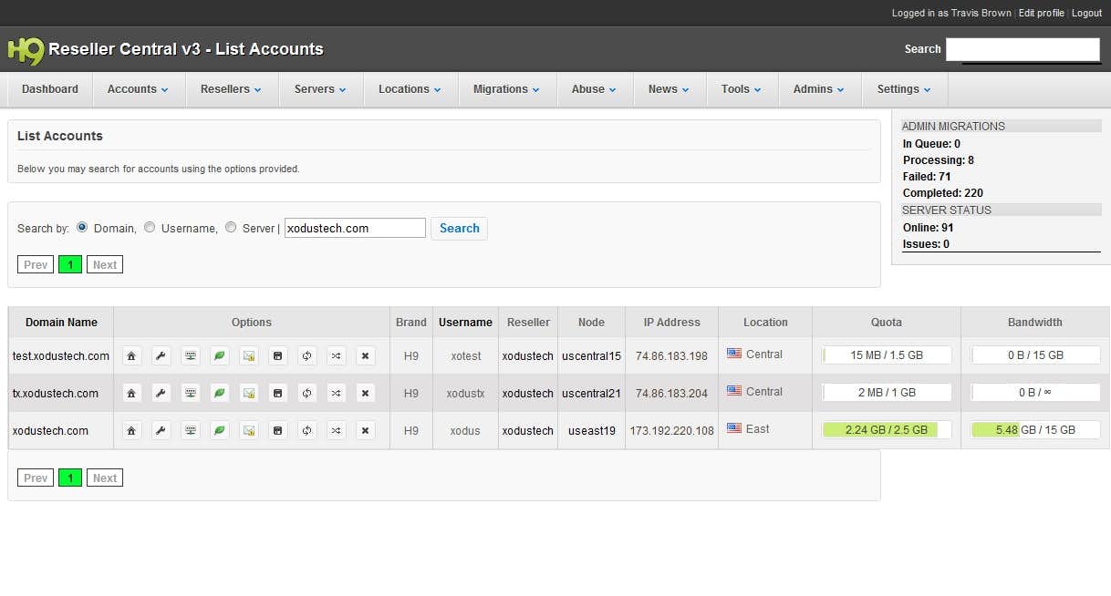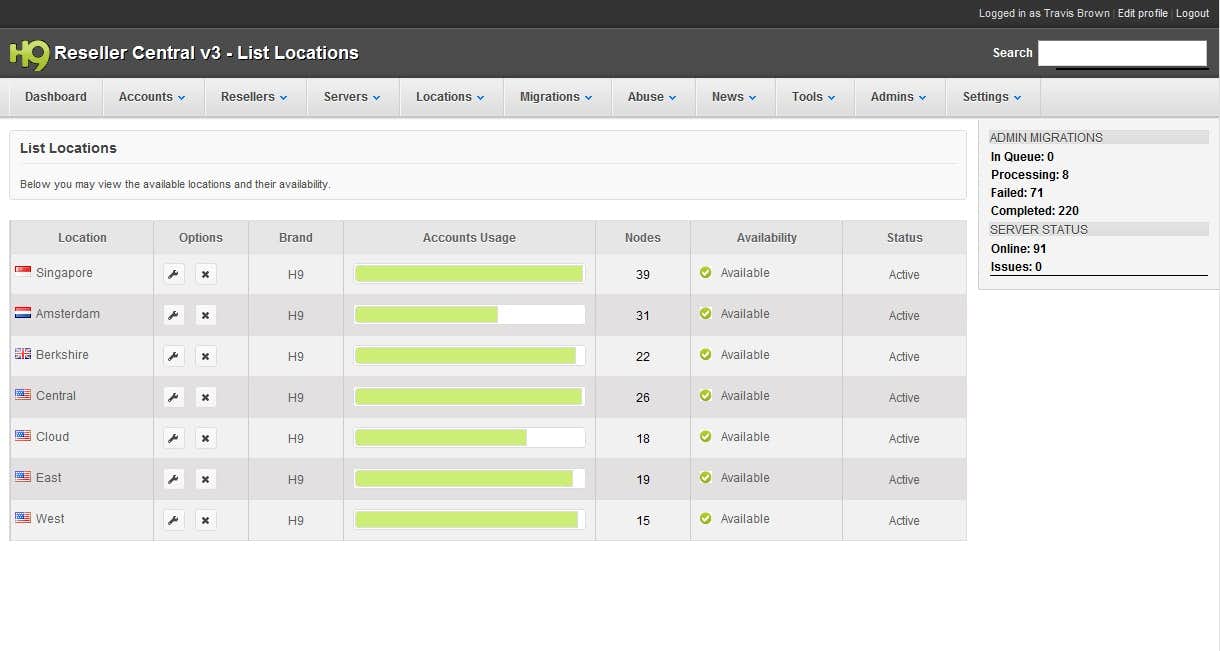 Reseller Central is a multi-location based account management platform custom designed for HostNine LLC. The platform integrates with the cPanel/WHM API allowing complete control over remote servers and all cPanel functions. Currently managing over 200 cPanel WHM servers with 6,000 resellers hosting over 200,000 domains. Reseller Central allows users to create accounts in any of the available locations using a familiar WHM like interface.
