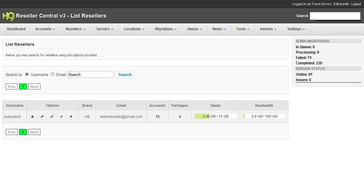 Reseller Central Admin provides staff the ability to manage Resellers and Accounts that are setup within th system. Visual graphs are provided allowing staff to identify quota and bandwidth issues at a glance. Tool bar options are provided in the results which allow quick access to items like Modify Account, Synchronize Account, Check Firewall Block, and many more.